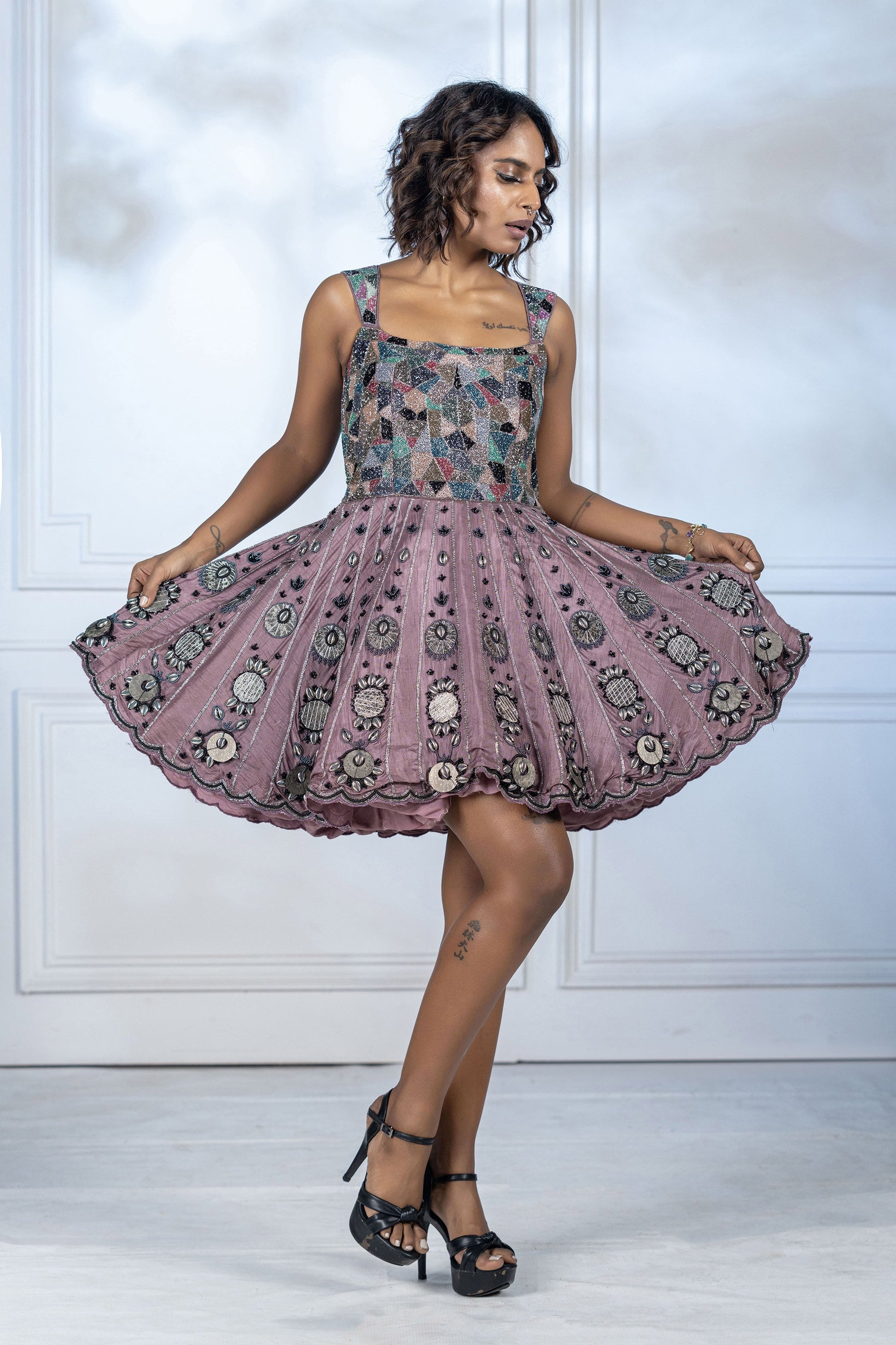 Greyish Purple Frock with mix of multicoloured Geometric patchwork in muted tones with Oxidised details and added flare