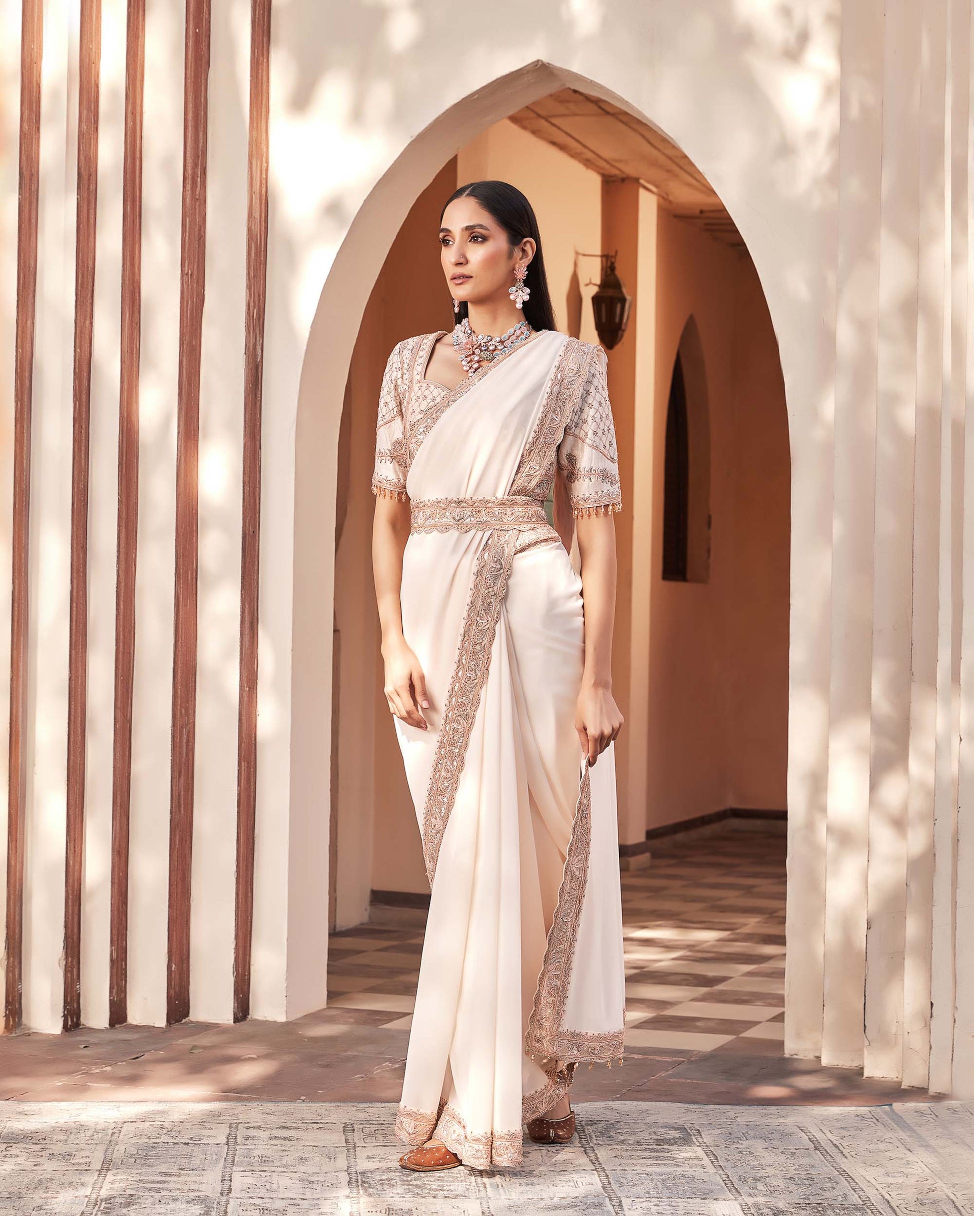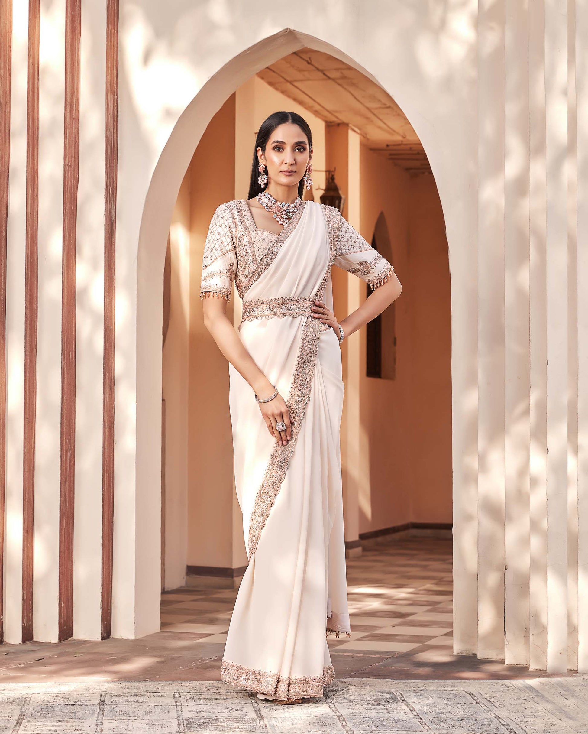 Featuring light peach embroidered silk georgette saree with matching blouse and belt