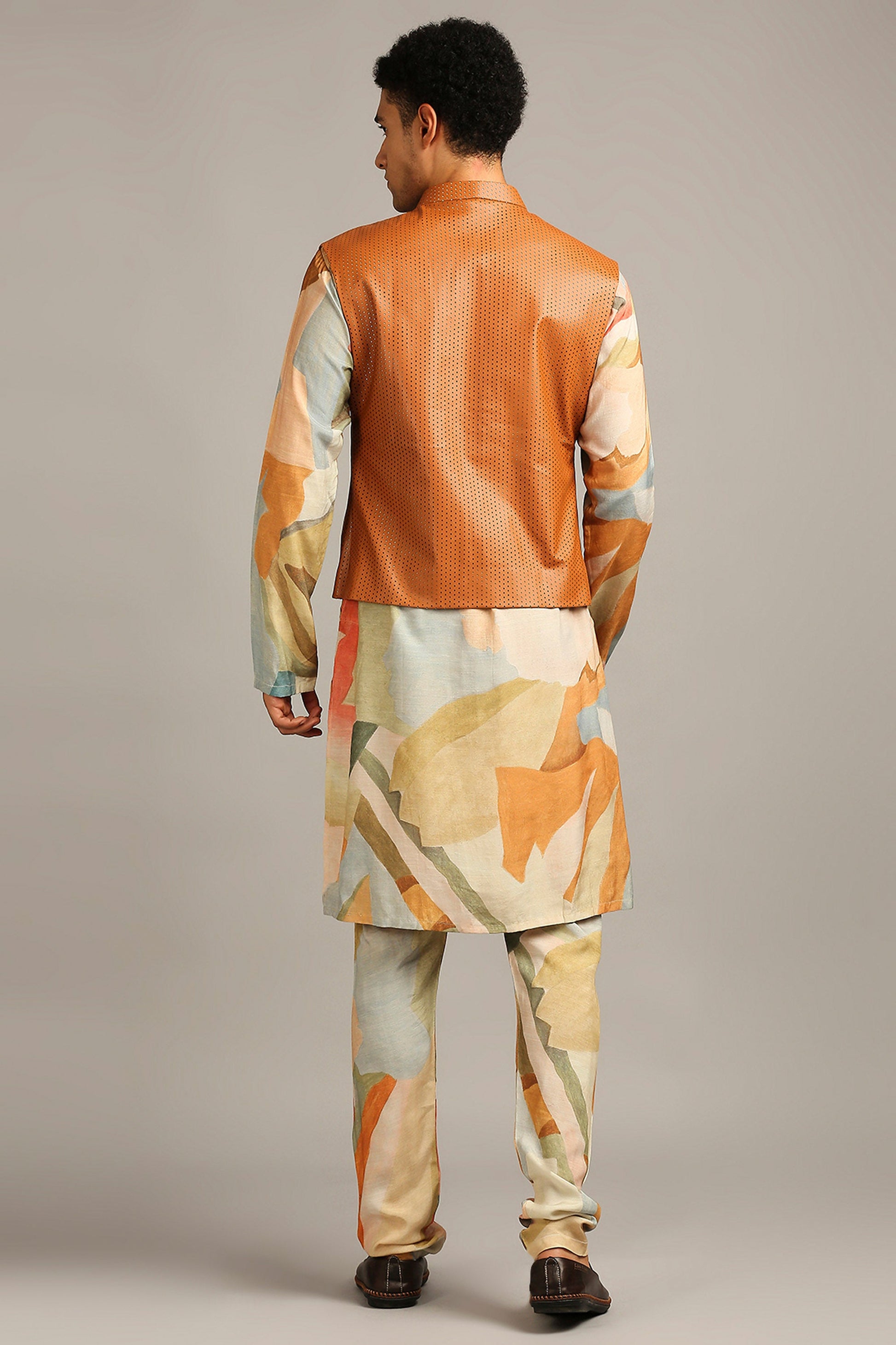 Multi colour Muslin Slub & Leather Conversational printed bundi with kurta set
