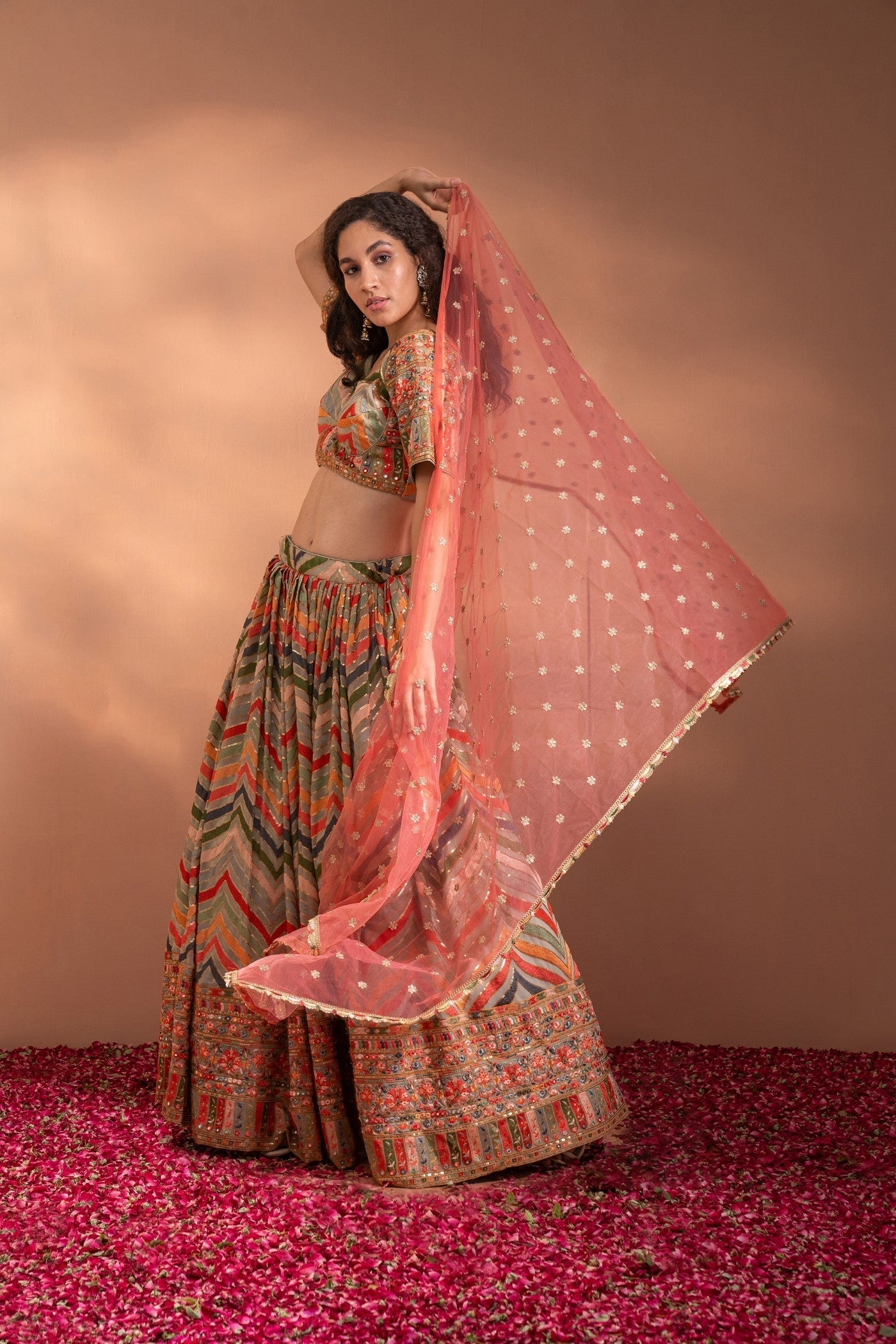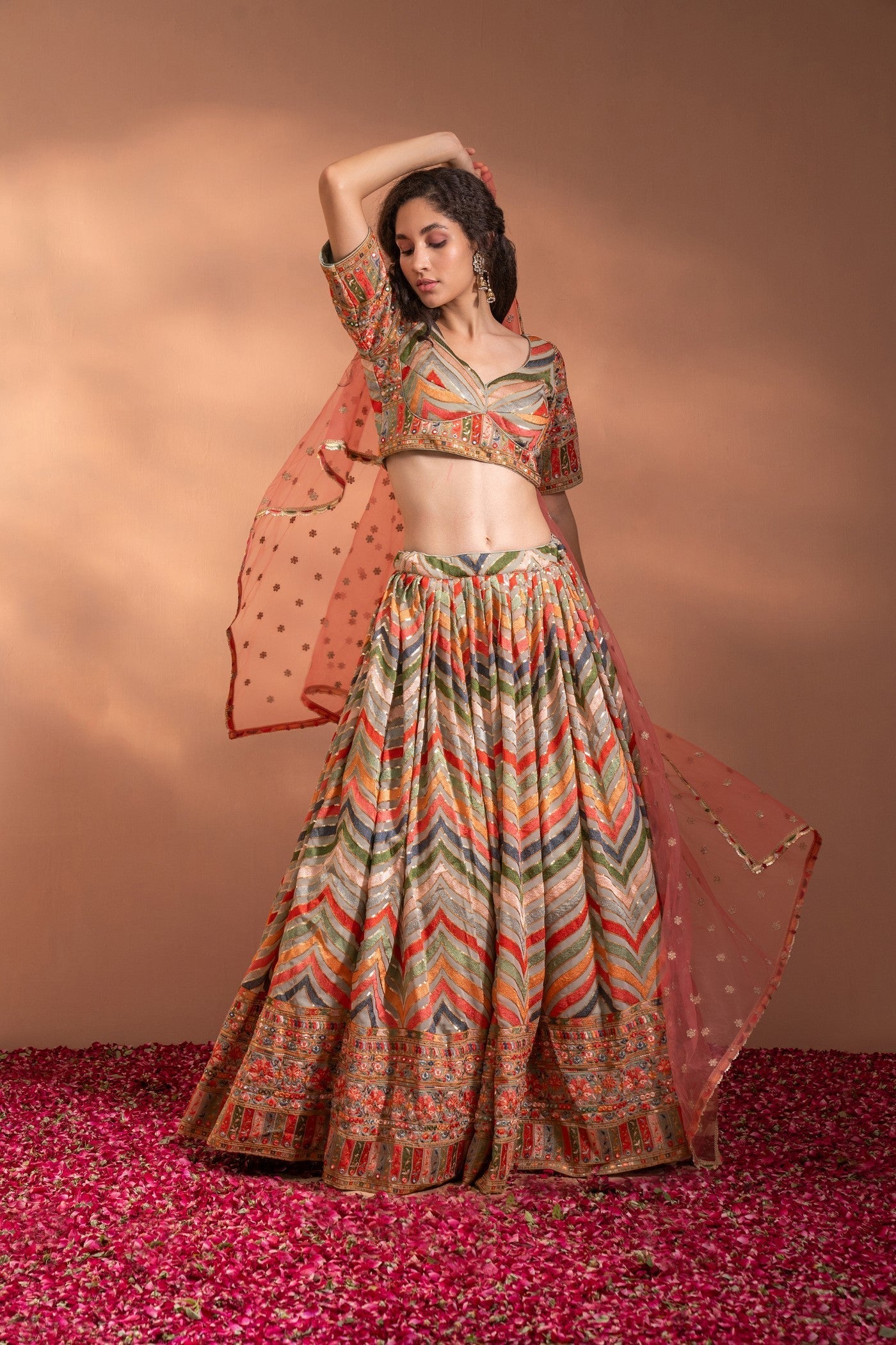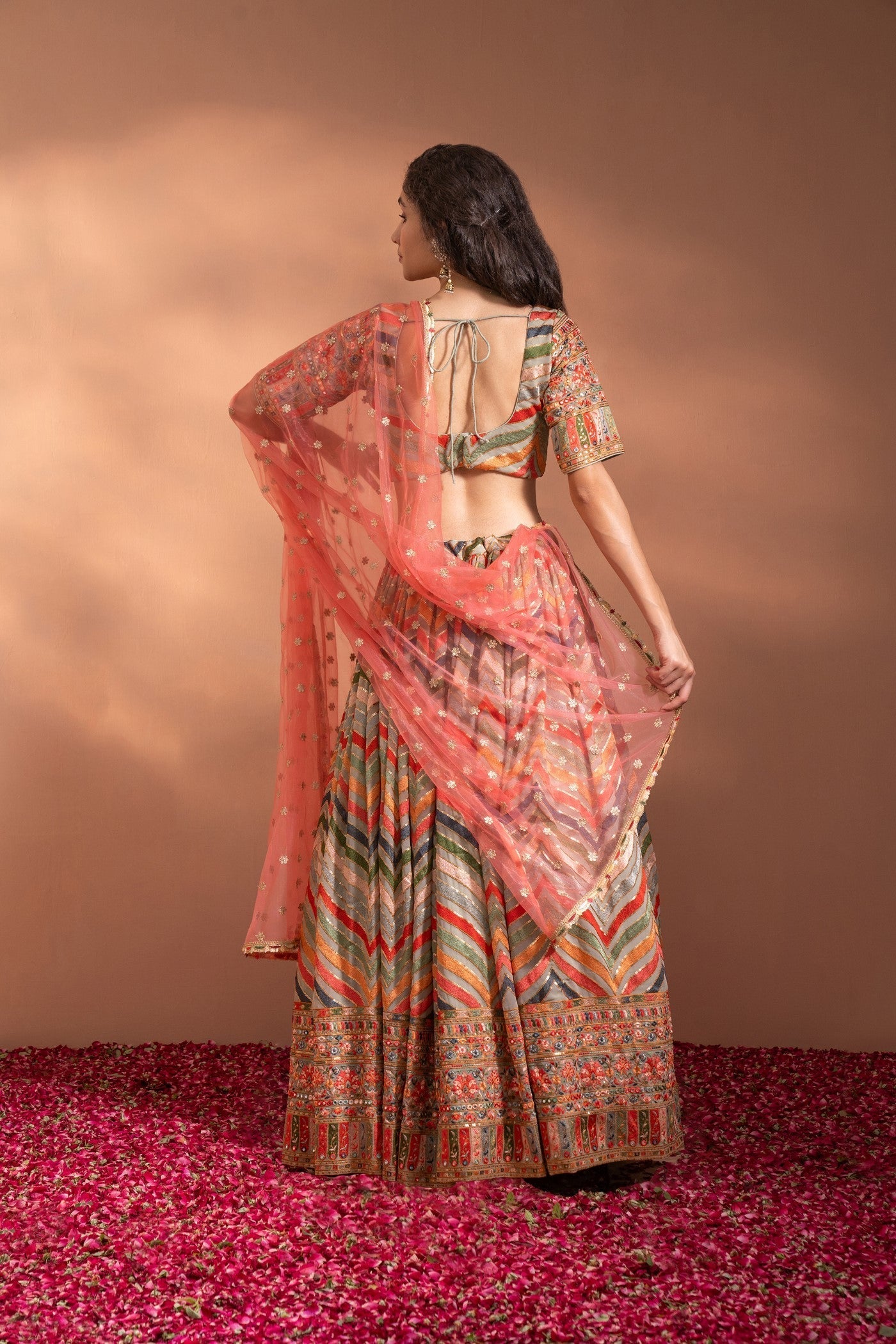 Multi Colour Lehenga set in Cotton-Satin Fabric with heavy threadwork, sequence, arri work & Net Dupatta.