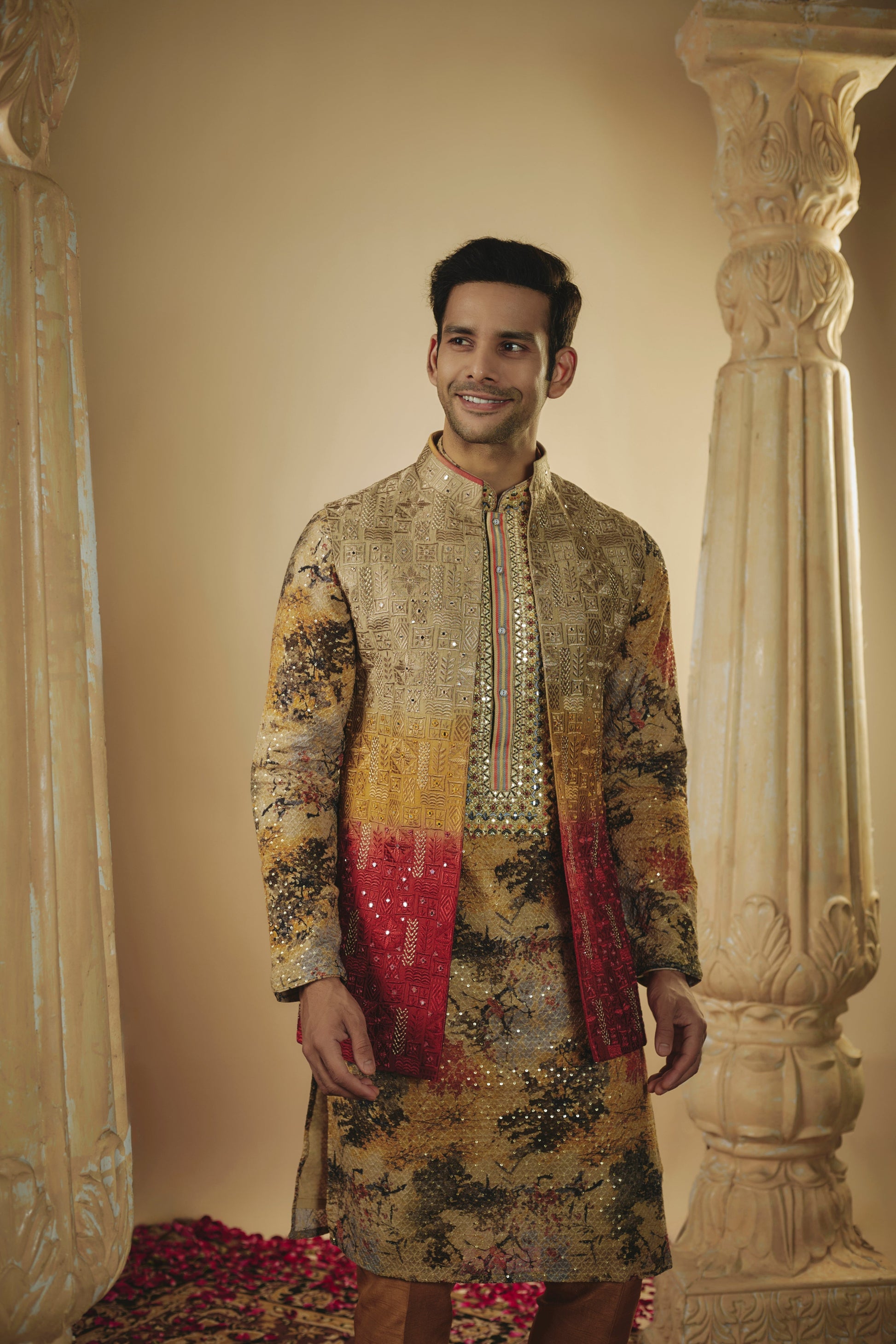 Multicoloured digital print lucknowi kurta with sequins and resham work with mirror and thread work ombre jacket paired with pants.