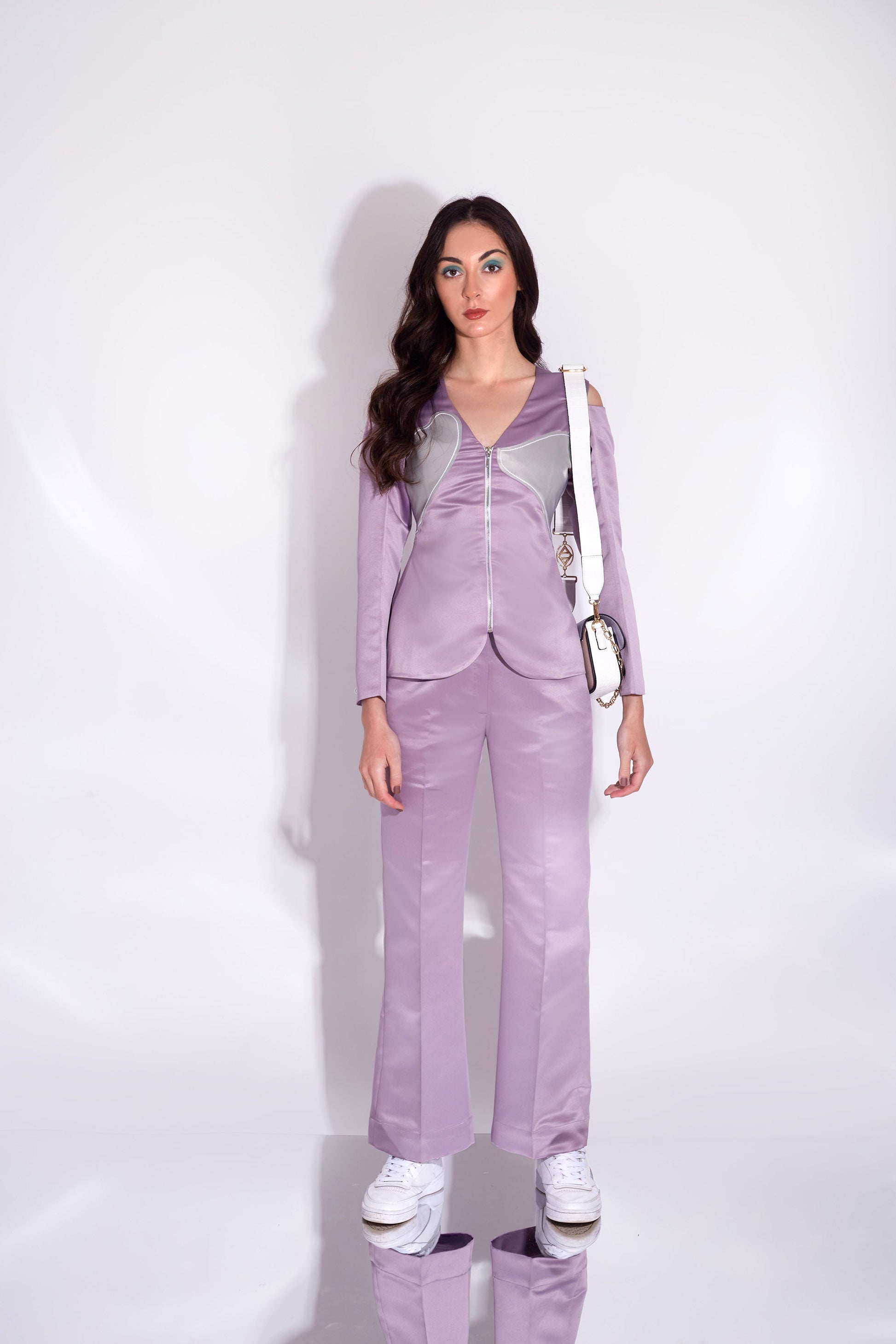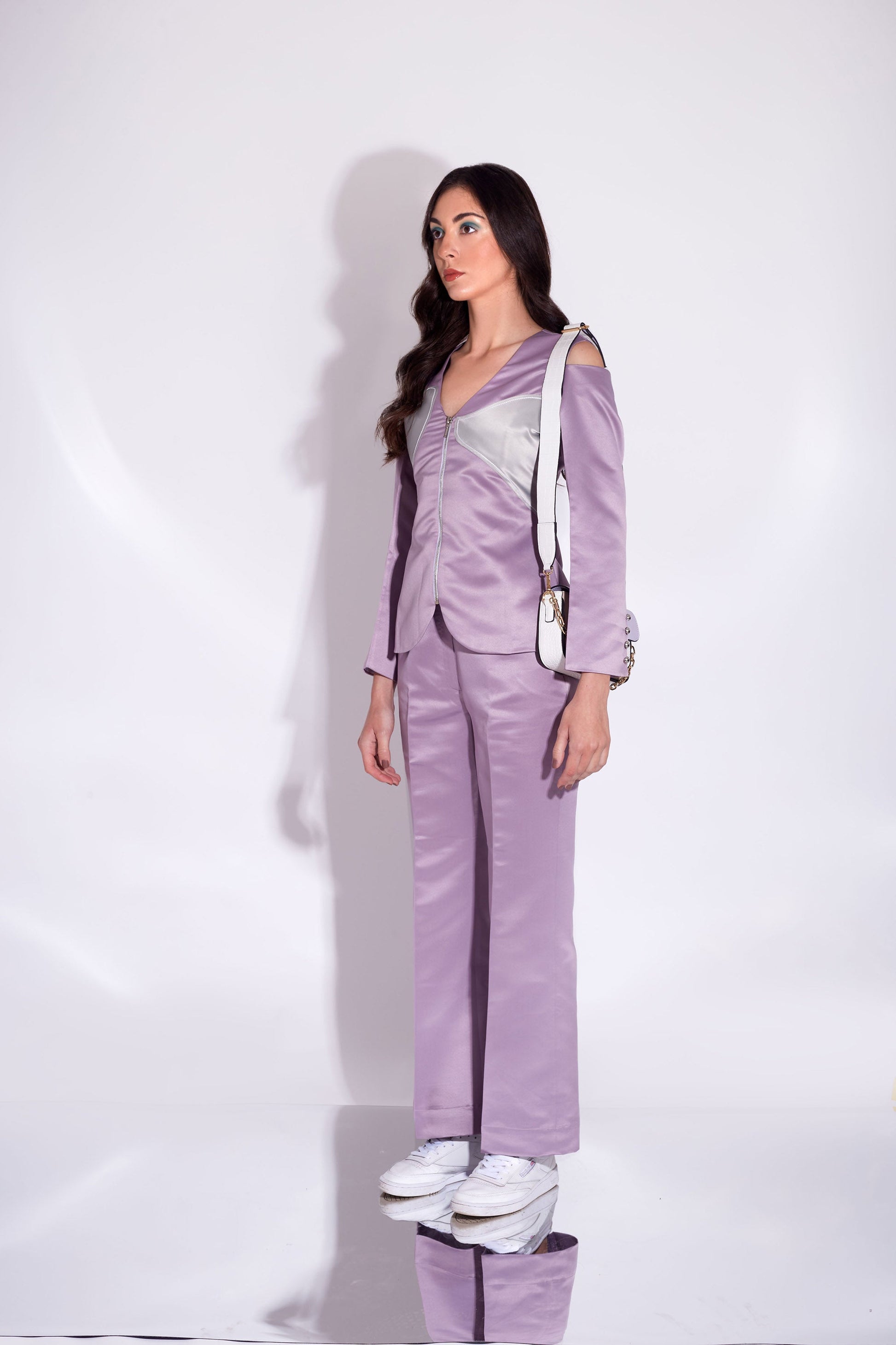 A color- block cut and sew constructed suit with front metal zip closure, peek-a boo shoulder sleeves paired with straight fitted front creased pants. The set contains 2 pieces.