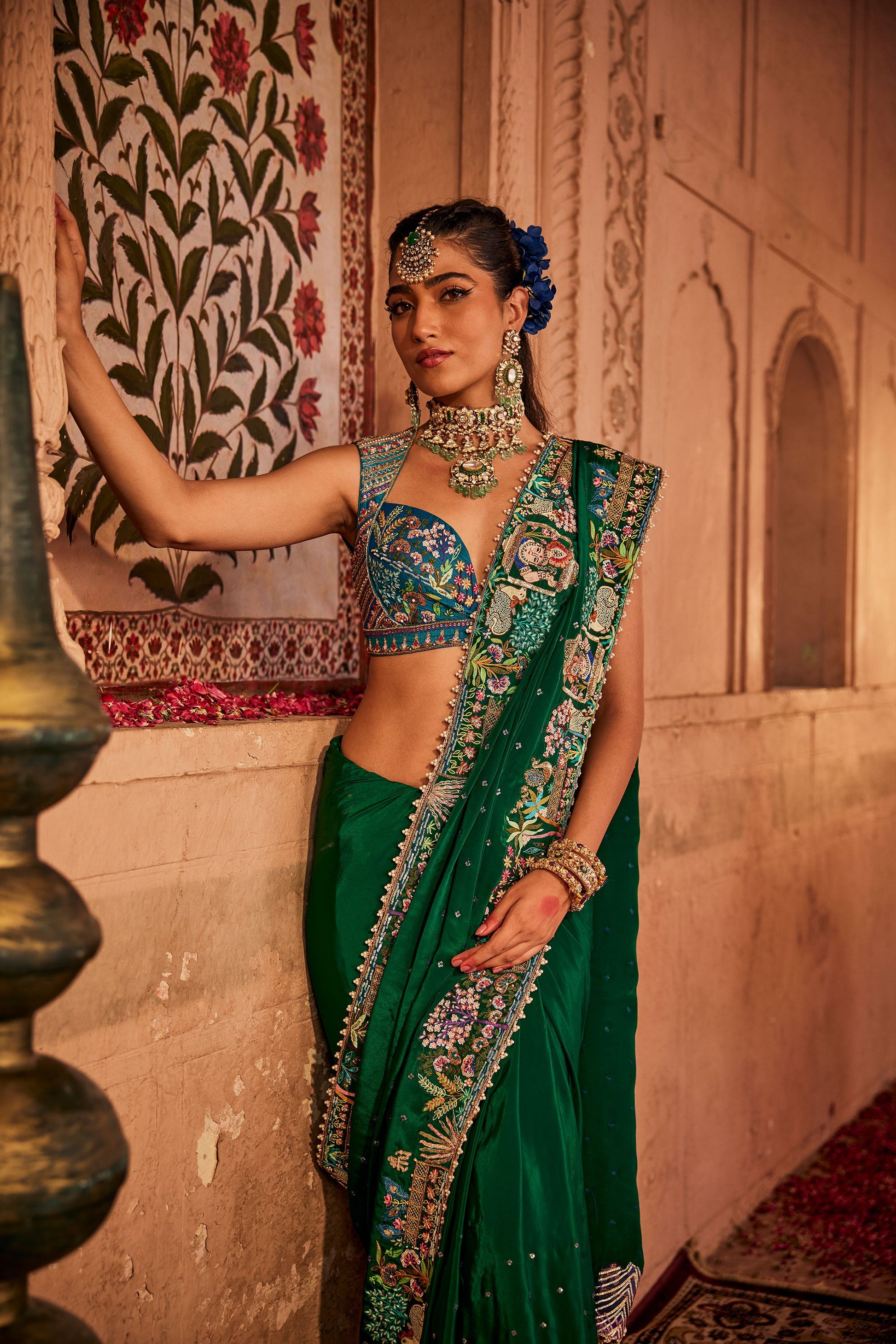 Elevate your wardrobe with our exquisite Emerald Green Embroidered Saree. Crafted with exceptional attention to detail, this saree features delicate hand embroidery done with aari techniques that showcase the intricate beauty of Indian artisanal traditions. The saree's stunning thread & bead work adds a touch of glamour to its emerald green fabric, while shrinathji motifs and vrindavan theme motifs provide a traditional touch that adds to its iconic appeal. A must-have addition to any wardrobe that appreciates the beauty of Indian fashion.