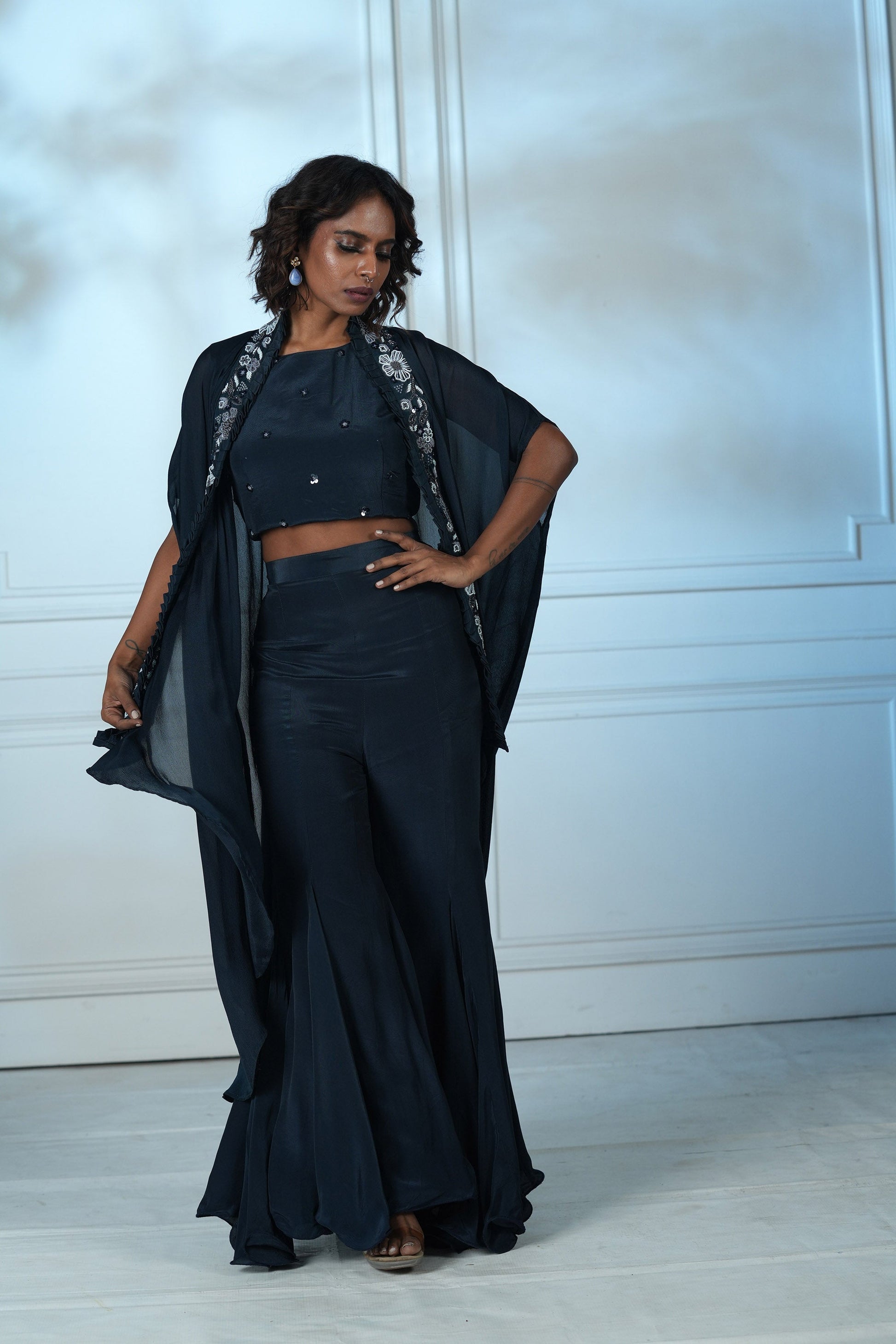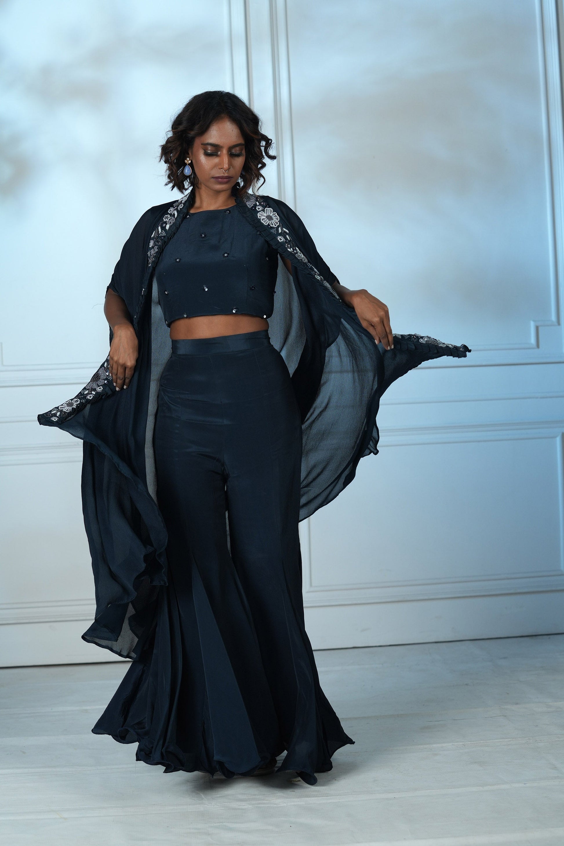 Embroidered spaghetti with long embroidered cape & pleated palazzo