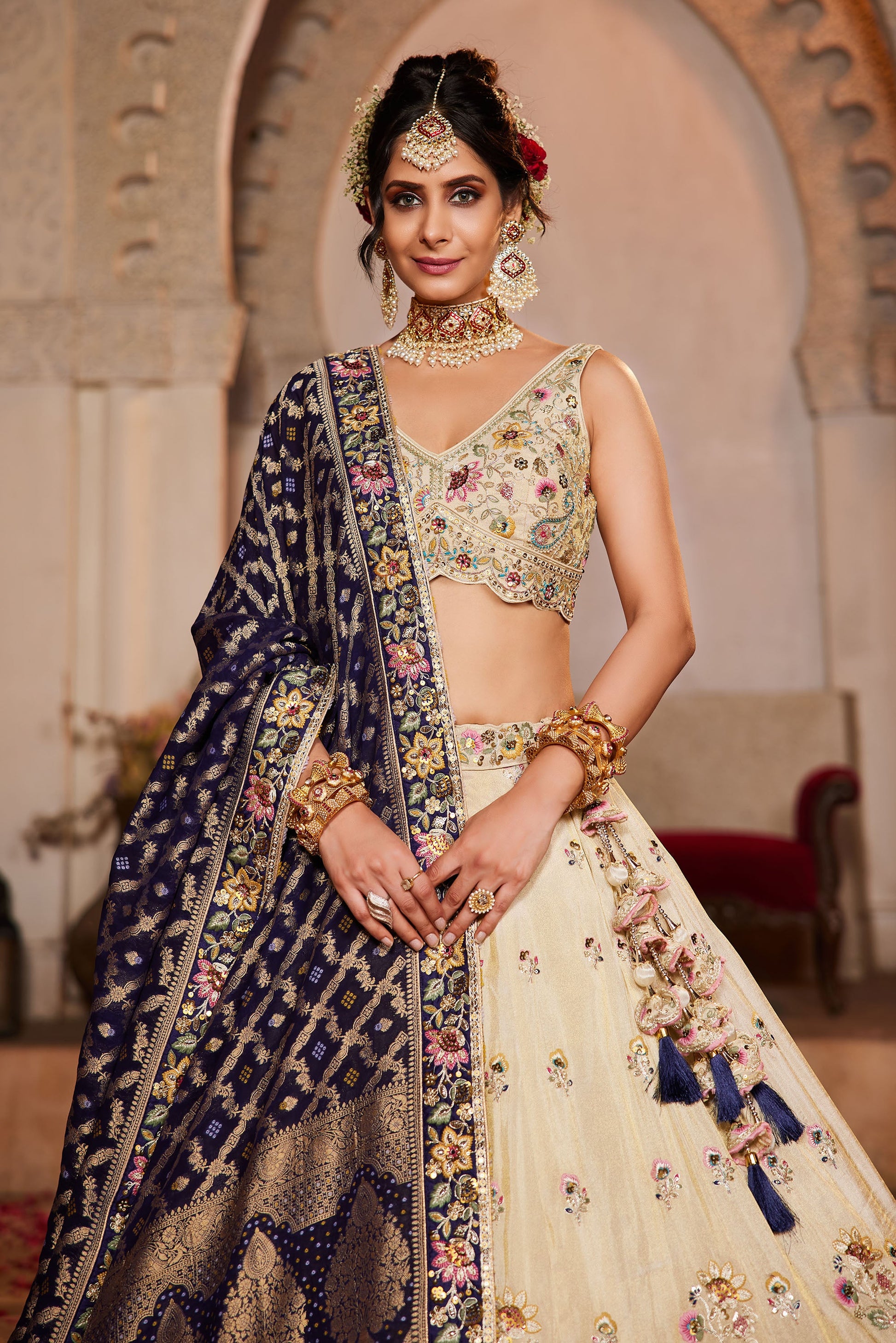 • Lehenga:- Made of premium quality Cream Colour Tissue fabric Full Flaire Lehenga With Moti, Sequins and Coding work has a thread Embroidery work. Has a thread work border on the hemline.
