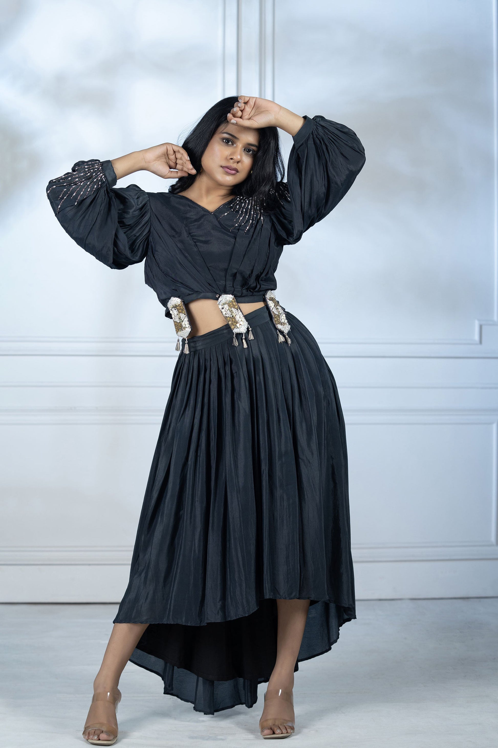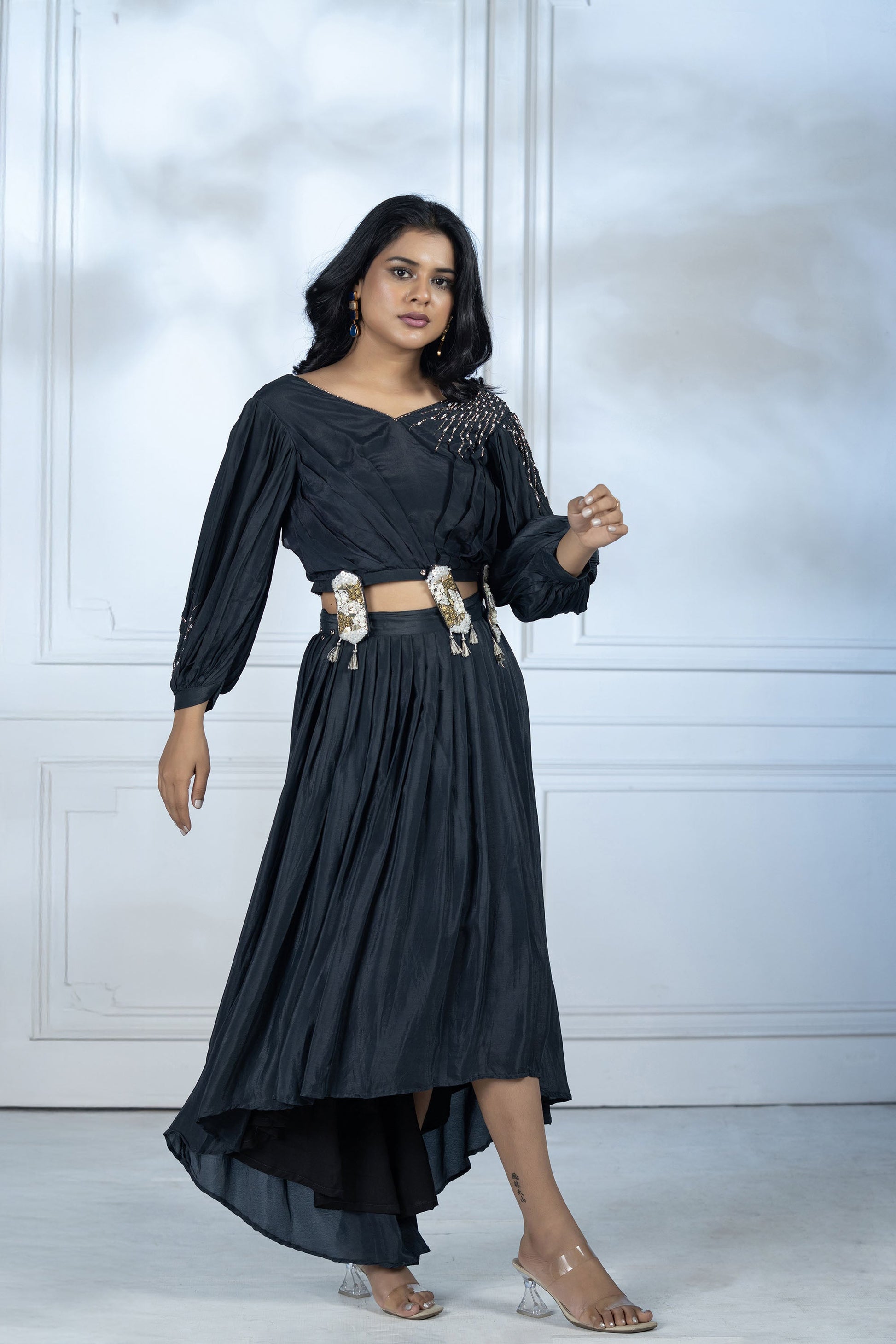 This is a fashionable & dynamic piece known for its asymmetrical hemline,where front is shorter than the back.Cutdana work on shoulder & armhole with patch work on waistline embarks the beauty of the outfit.