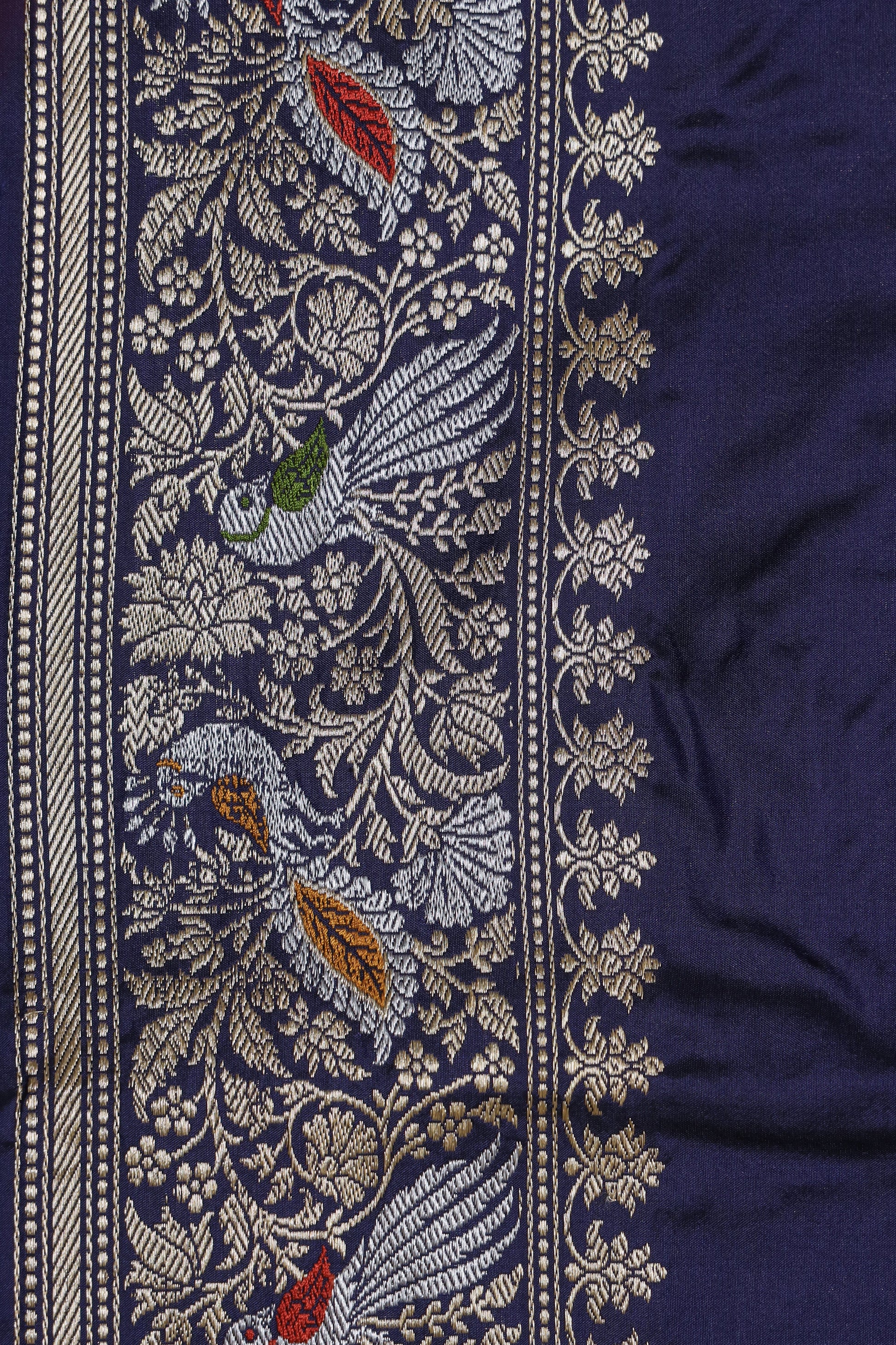 - Description: Tota Maina bird motif in sona roopa zari with multi-color meena aachal and border