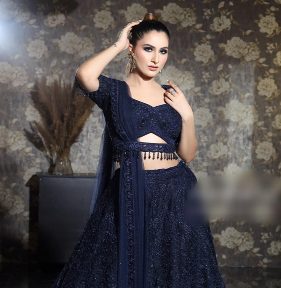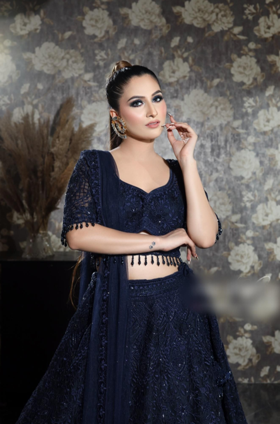 Navy Blue Soft Net Thread Embroidered Lehenga