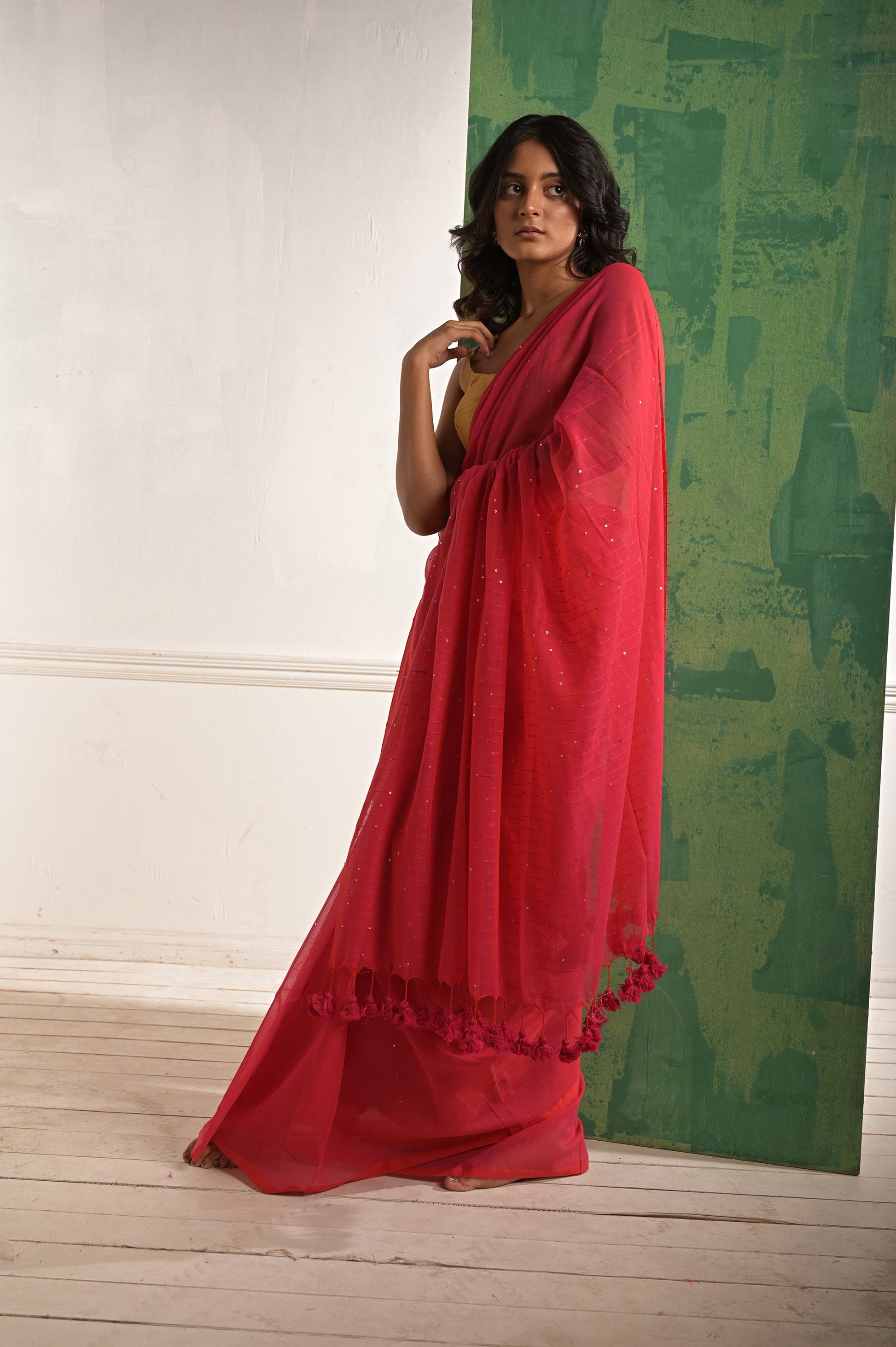 Nazuk Pankhuri | Hot Pink mul cotton saree with beaded sequins