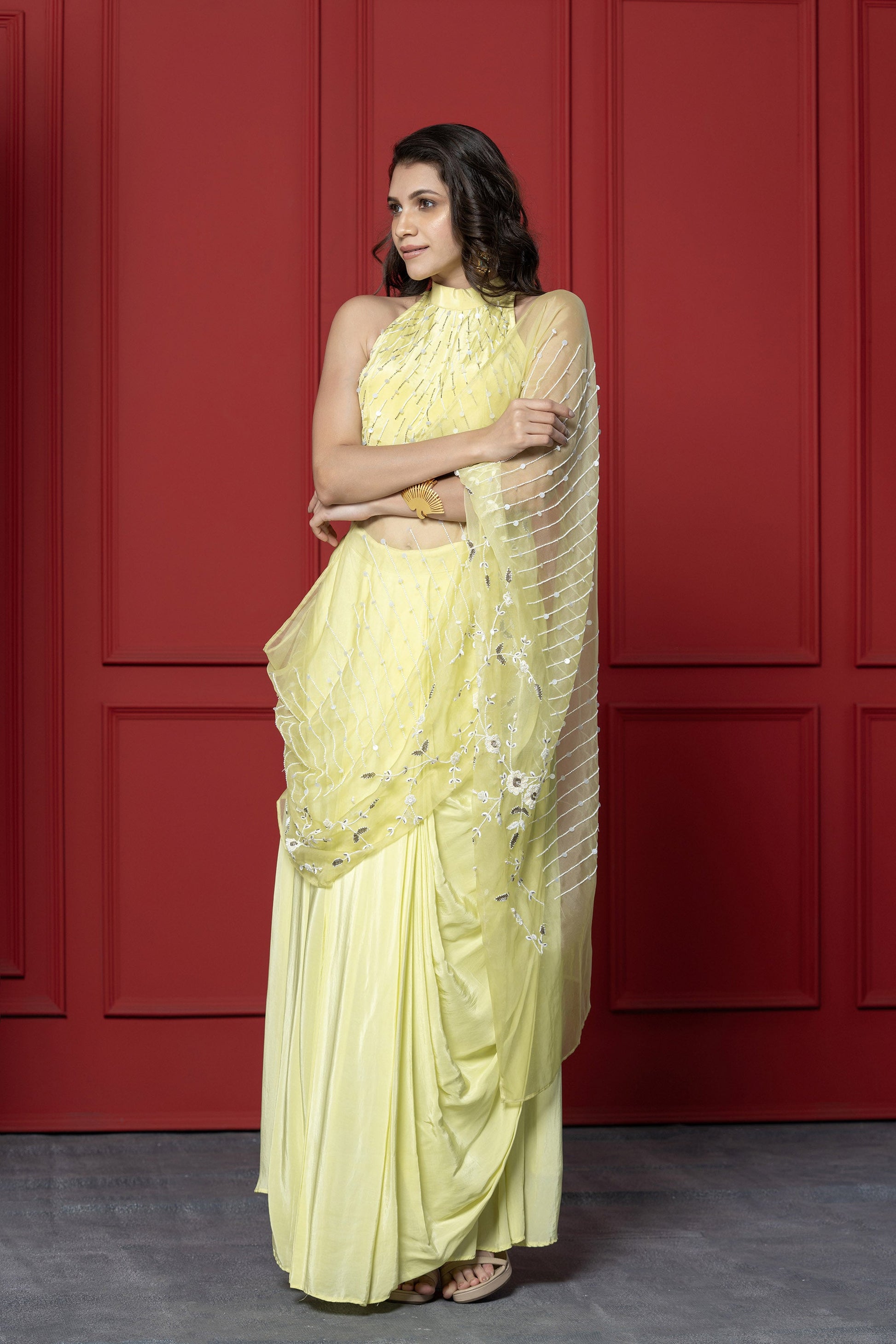 Halter neck blouse with work paired with a sheer embroidered drape which gives elegance & is best for parties & functions