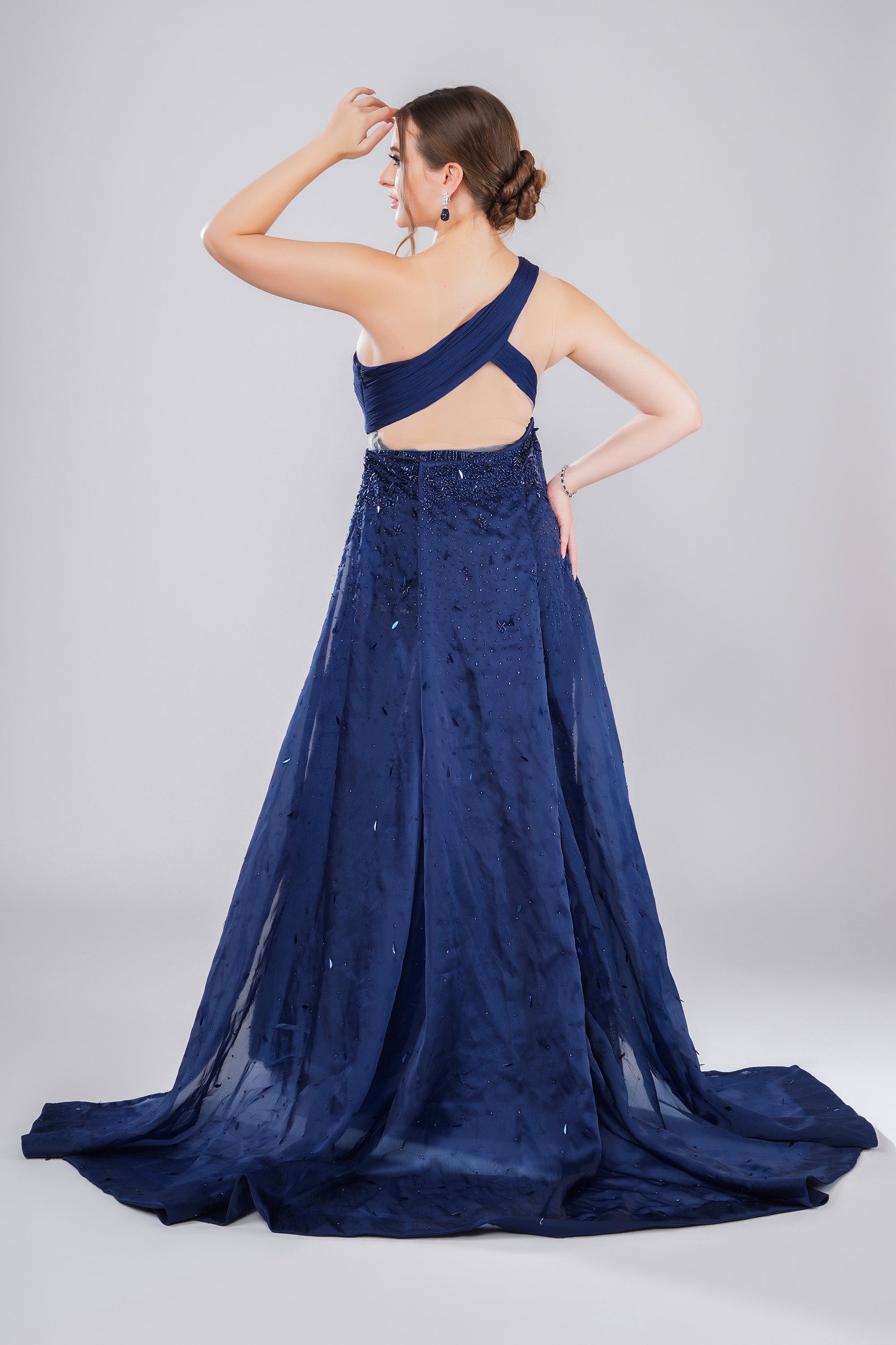 A deep blue handcrafted gown featuring a striking crisscross bodice with shimmering embellishments and floor-length skirt with a detachable embellished veil skirt. The deep blue fabric with pleated sections creates a mesmerizing effect, combining timeless elegance with exquisite twist.