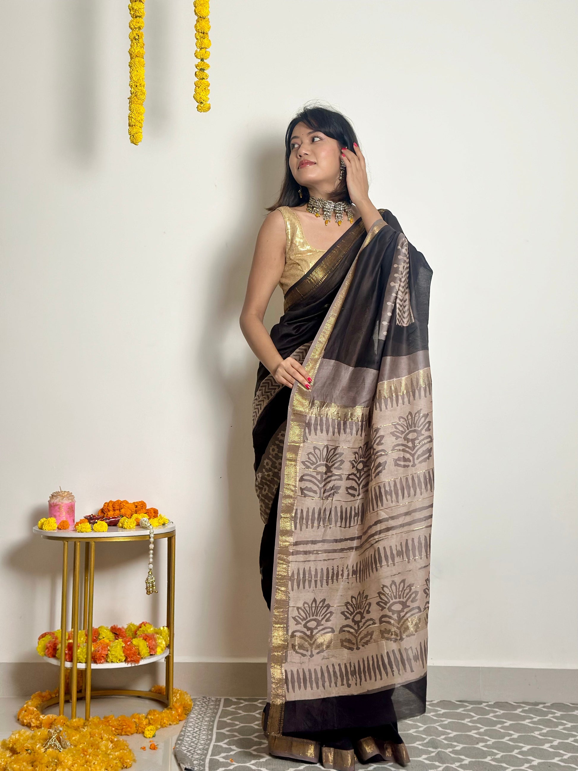 The Maheshwari Cotton Silk Saree with Handblock Print is a beautiful blend of tradition and contemporary style, originating from the historic town of Maheshwar in Madhya Pradesh, India. This saree showcases the elegance of cotton-silk fabric, combining the softness and comfort of cotton with the subtle sheen and richness of silk, making it perfect for both casual and festive occasions.The saree is adorned with intricate handblock prints, which add a unique artistic touch to the fabric. These traditional handblock motifs, often inspired by nature, geometric patterns, or cultural symbols, are meticulously crafted by skilled artisans. Each motif is individually stamped onto the fabric, creating a one-of-a-kind design that highlights the craftsmanship involved in the process.