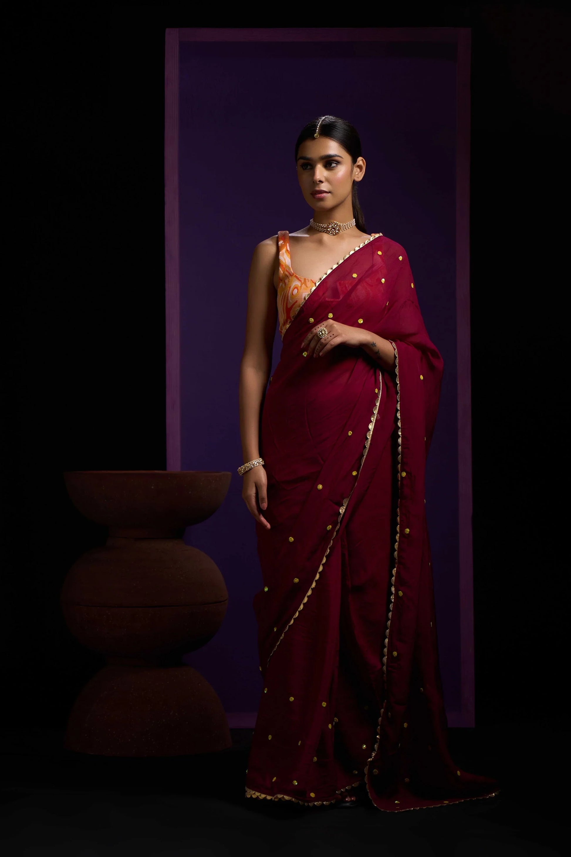 Noori saree is in viscose organza fabric. This saree has yellow sequence flower handwork with gold cutwork border. Saree fabric is soft and flowy.