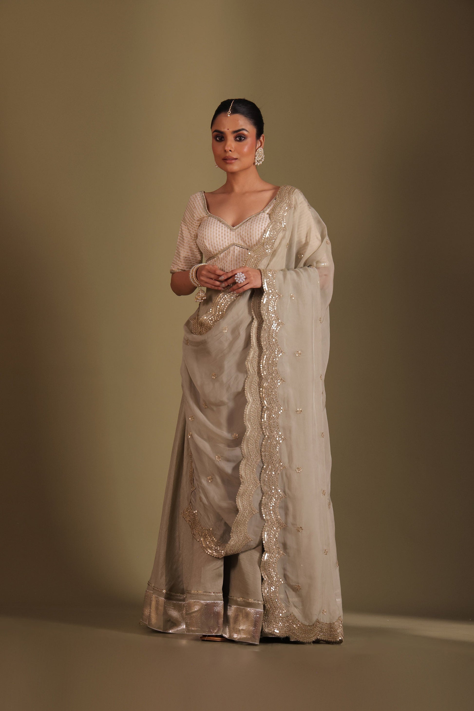 This three piece set includes Blouse, Lehenga and Dupatta Grace meets grandeur in this ethereal Ivory and sage lehenga set. The structured blouse features intricate work and a flattering sweetheart neckline with elbow-length sleeves. The silk lehenga flows in a rich flare with a gota border for added opulence. Completing the look is a sheer organza dupatta with delicate embroidery and scalloped sequin detailing along the edges, making it a perfect choice for intimate weddings, sangeet nights, or festive soirées.