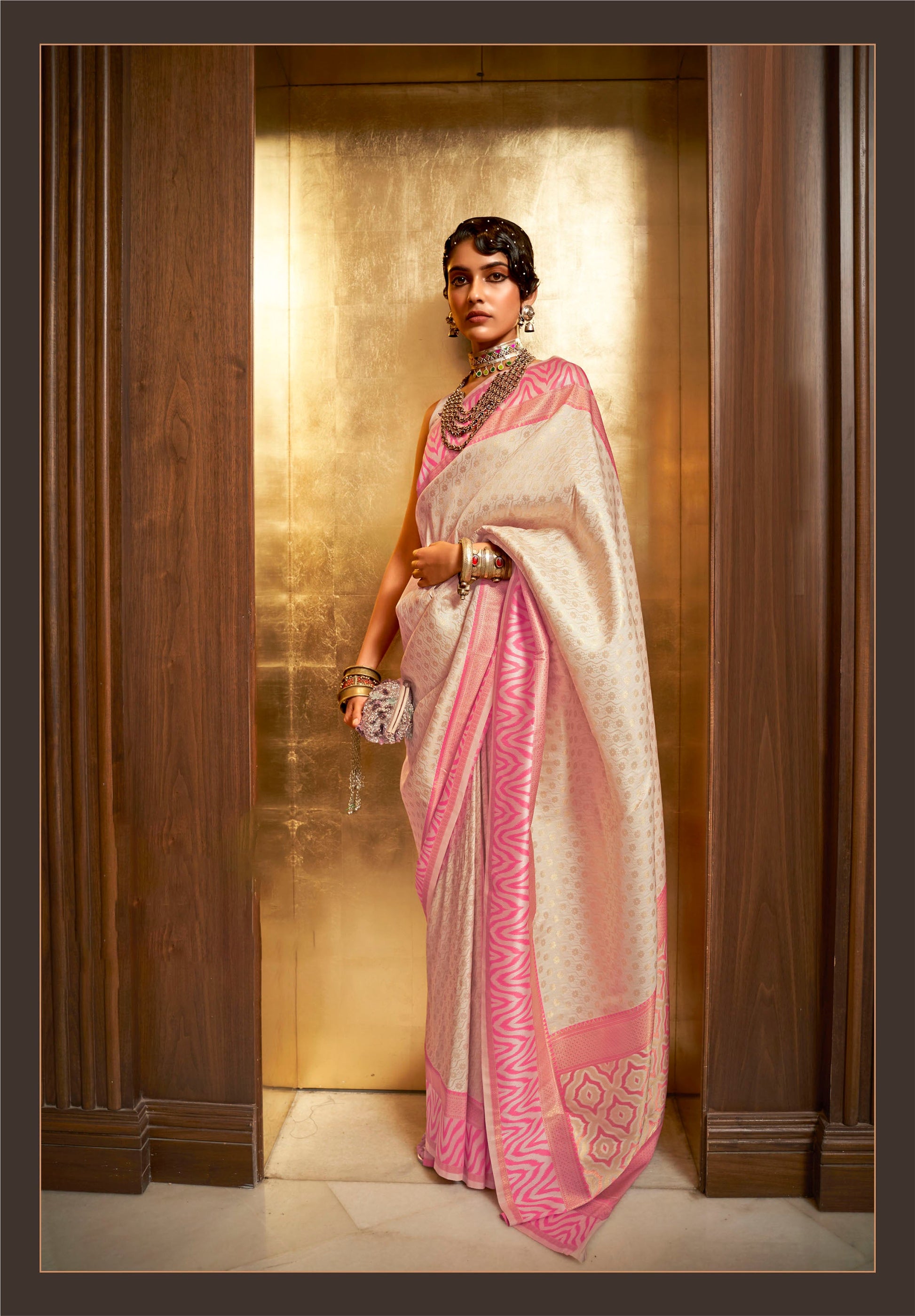 Does your wardrobe need more versatility? Then, check out this. Let your skin feel the refreshing touch as you adorn this superior-quality Banarasi Saree to match the overall modest design. If you're yearning to make a fashion statement in your outfit, pick this designer saree for any occasion, such as wedding receptions, engagement parties, and sangeets. A wedding Guest would look gorgeous in this Off-White and Pink Fancy Banarasi Silk Saree. Don't wait. Just go ahead and order