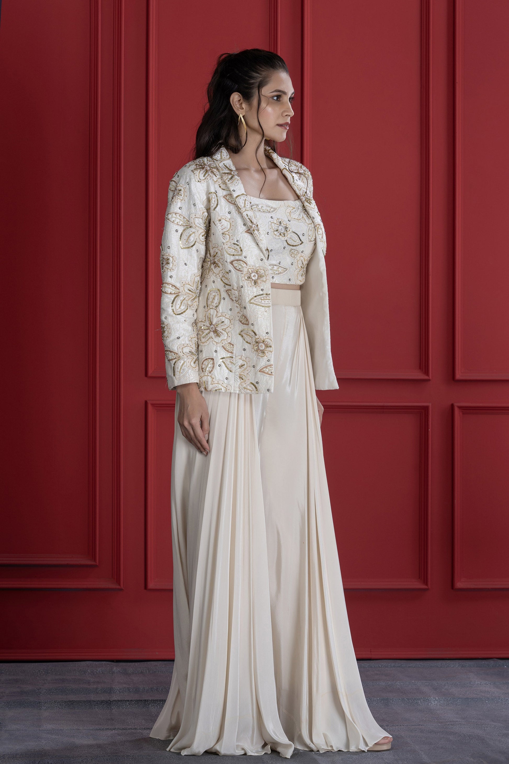 Textured spaghetti with Blazer with added handwork embellishments and a plain pleated palazzo