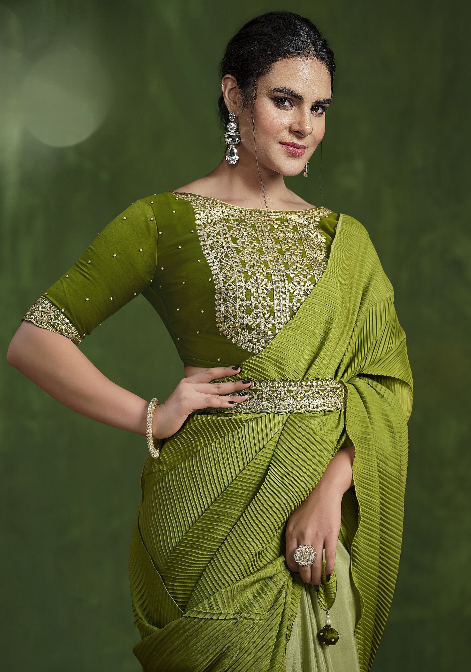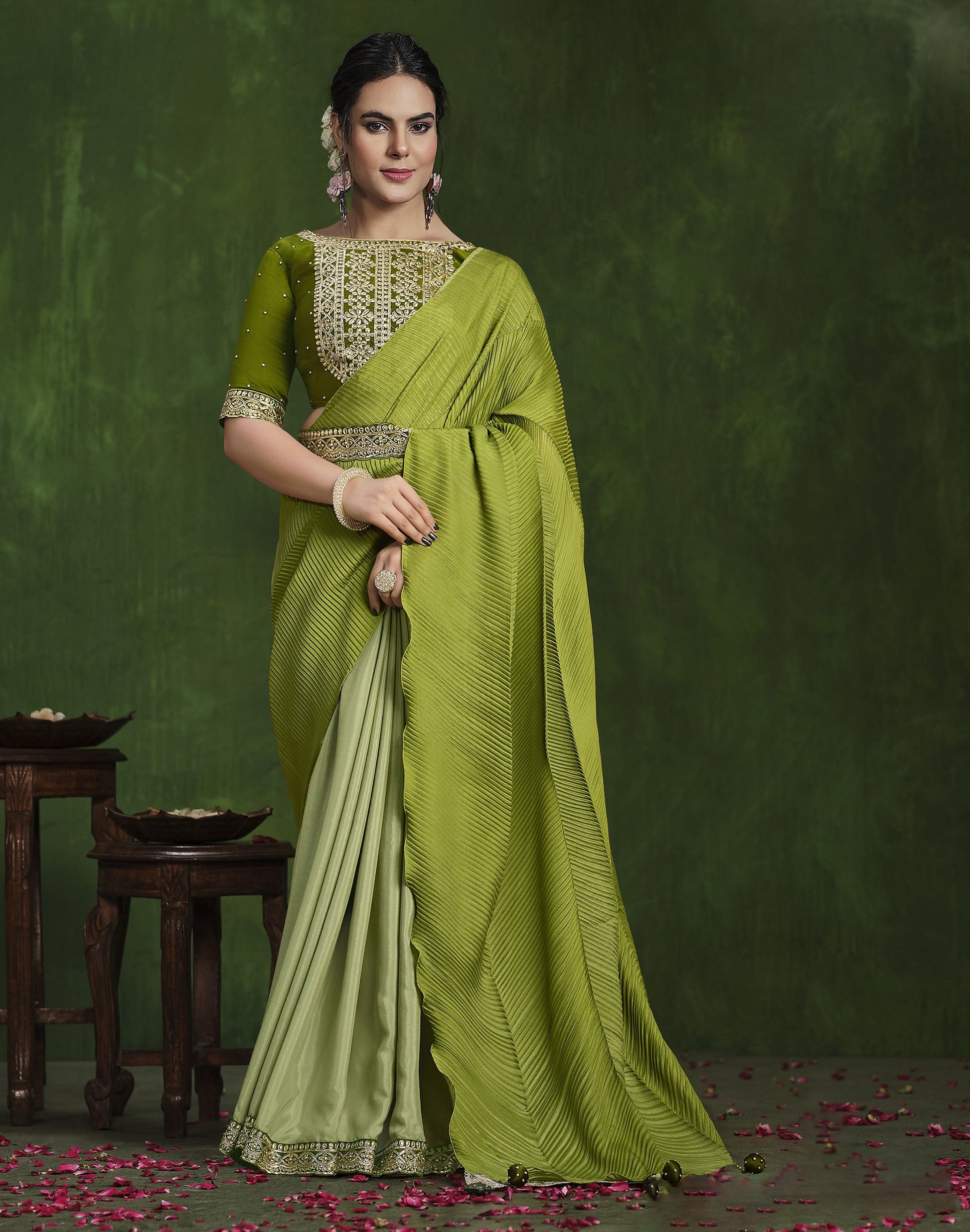 Does your wardrobe need more versatility? Then, check out this . Let you feel the refreshing touch as you adorn this superior-quality Olive Green Crepe Silk Georgette Zari & Stone Work Saree to match the overall modest design. If you're yearning to make a fashion statement in your outfit, pick this saree for any occasion, such as wedding receptions, engagement parties, and sangeets. A wedding Guest would look gorgeous in this Olive Green Crepe Silk Georgette Zari & Stone Work Saree. Don't wait. Just go ahead and order.
