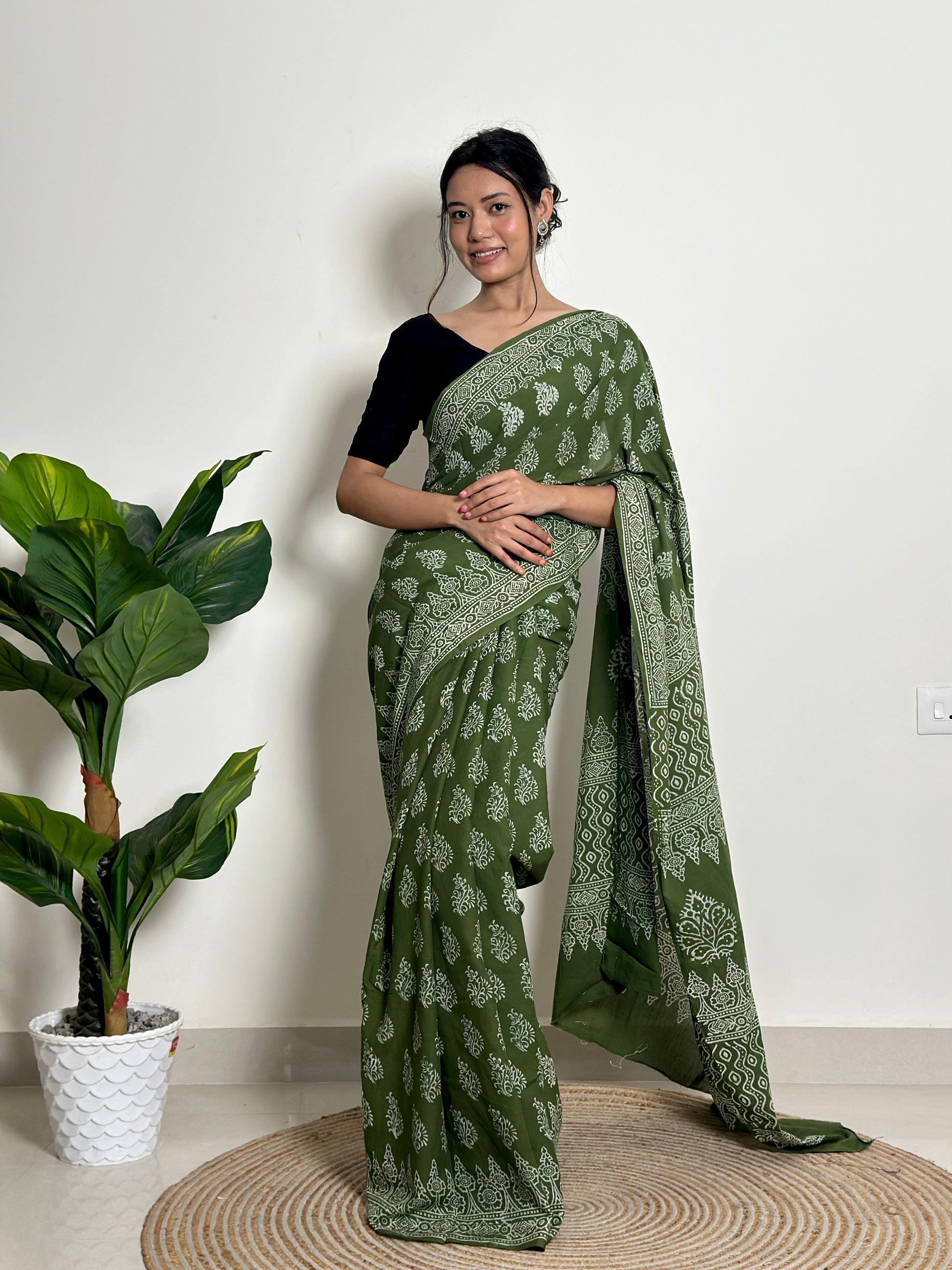 Olive Orchard - Handblock Print Natural Dyed - Mulmul Cotton Saree