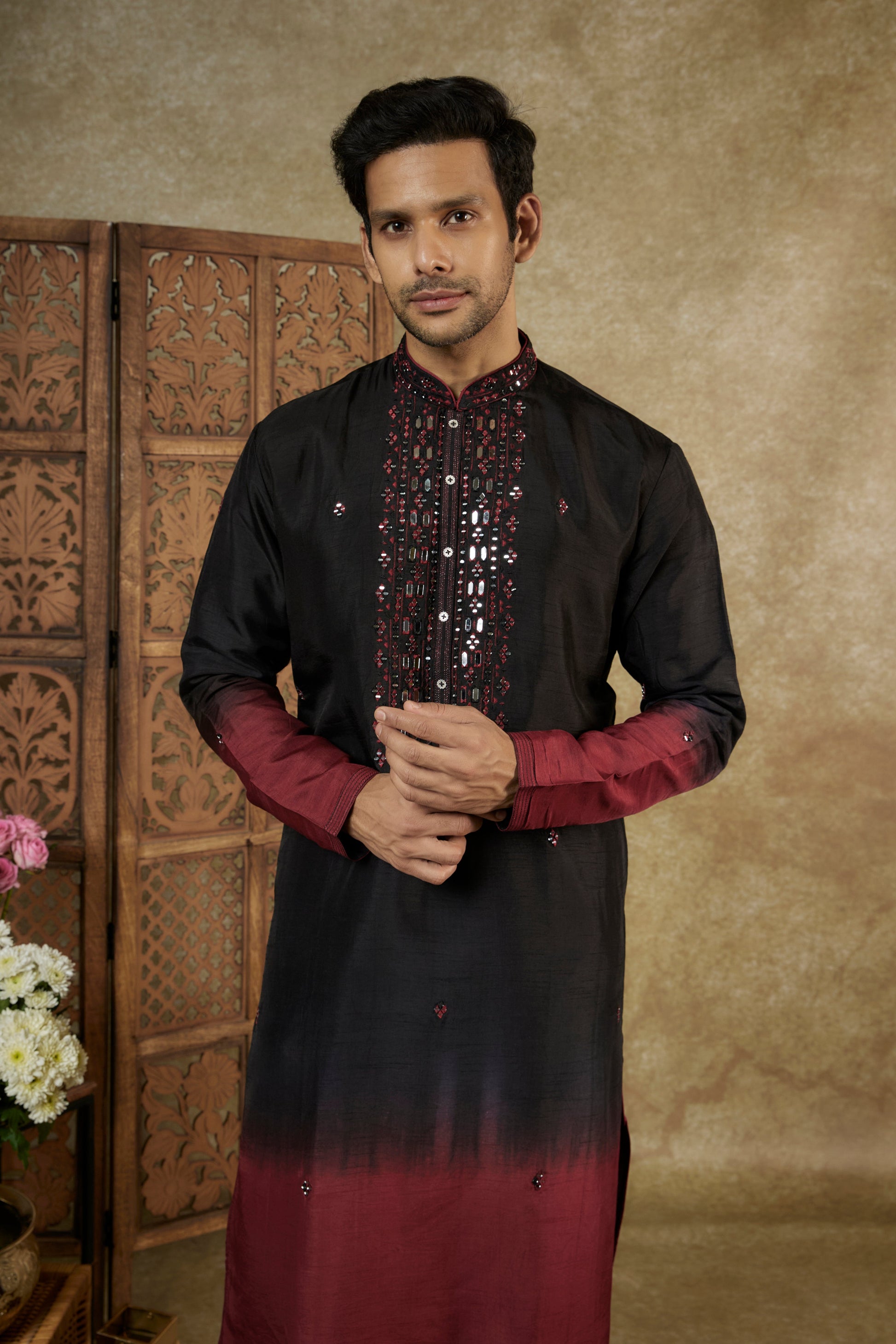 OMBRE BLACK GARNET SILK KURTA WITH MIRROR AND RESHAM WORK AND BLACK PANTS