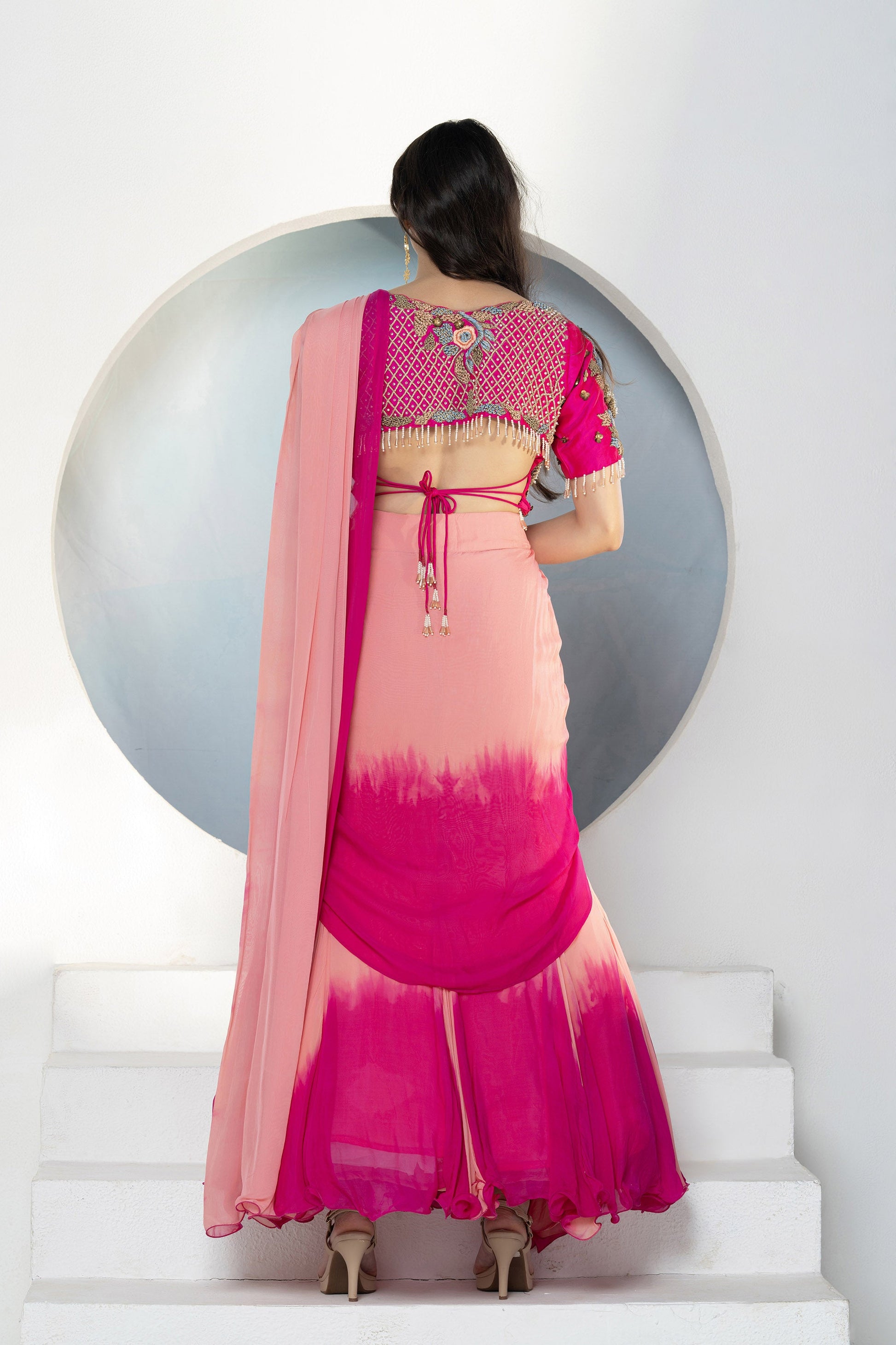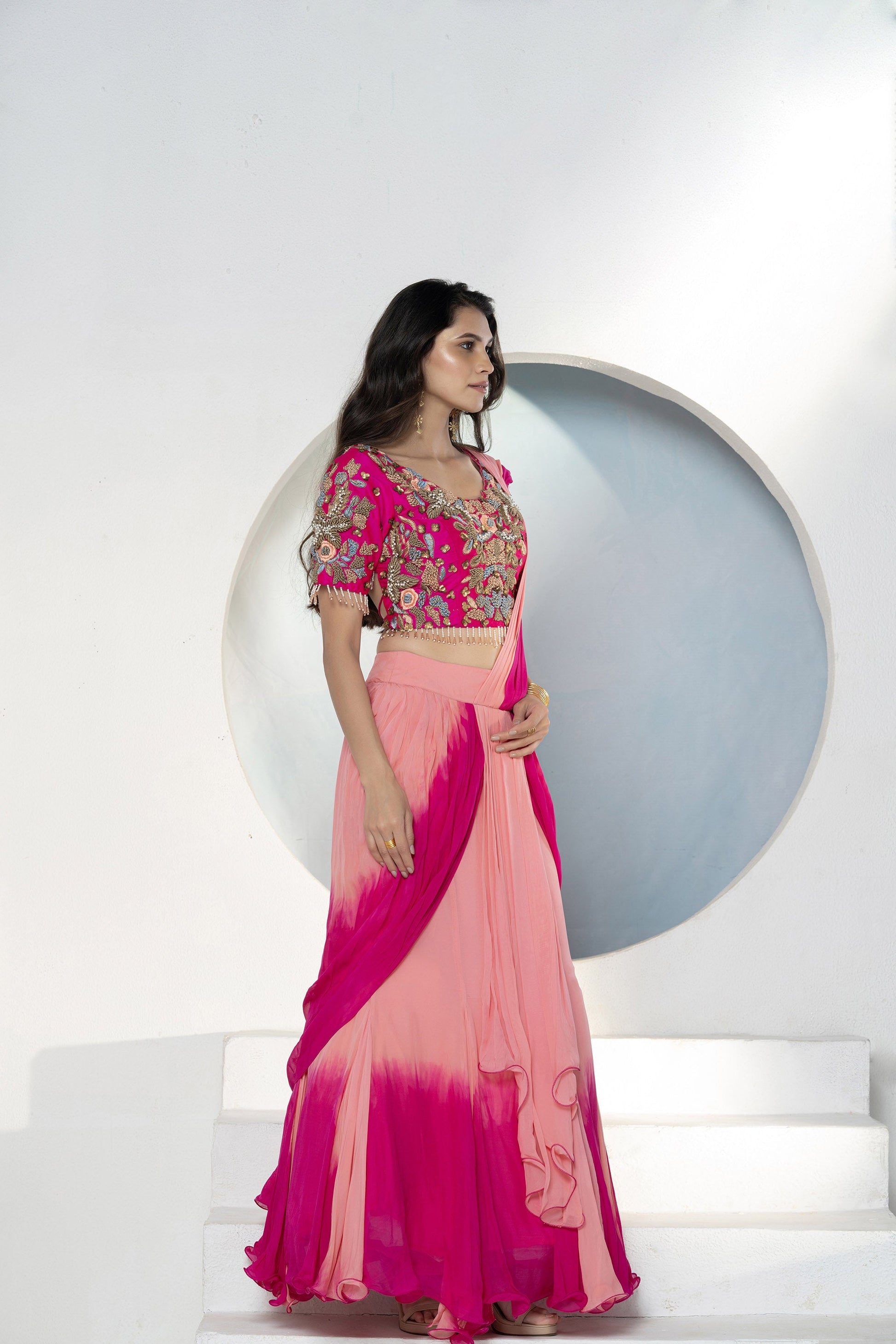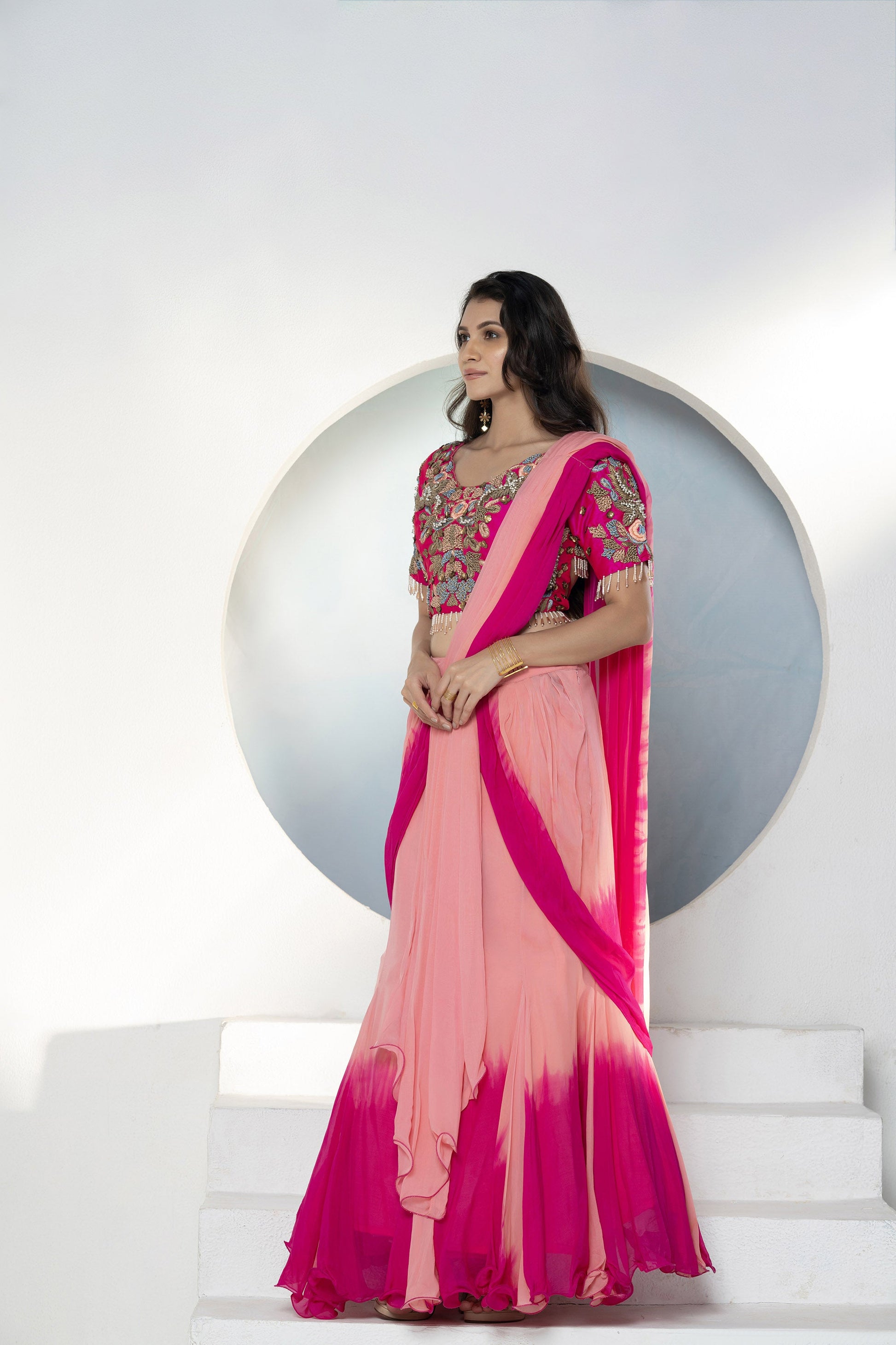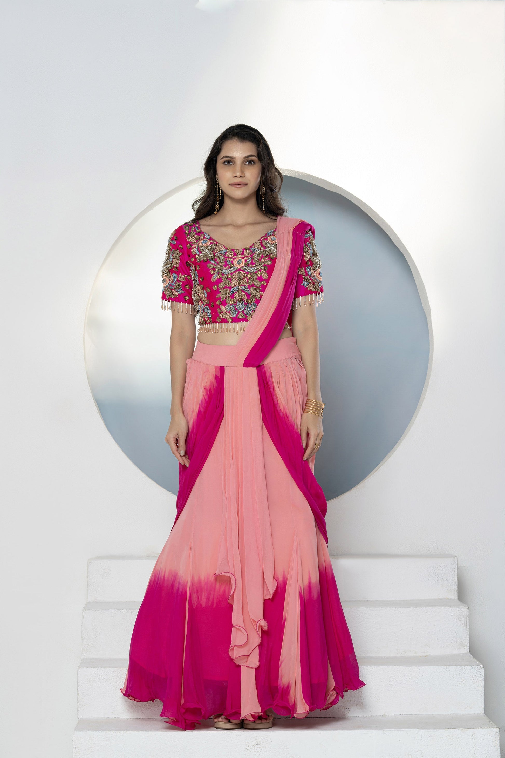 Embroidered thread work blouse with ombré lehenga style drape with front pleats