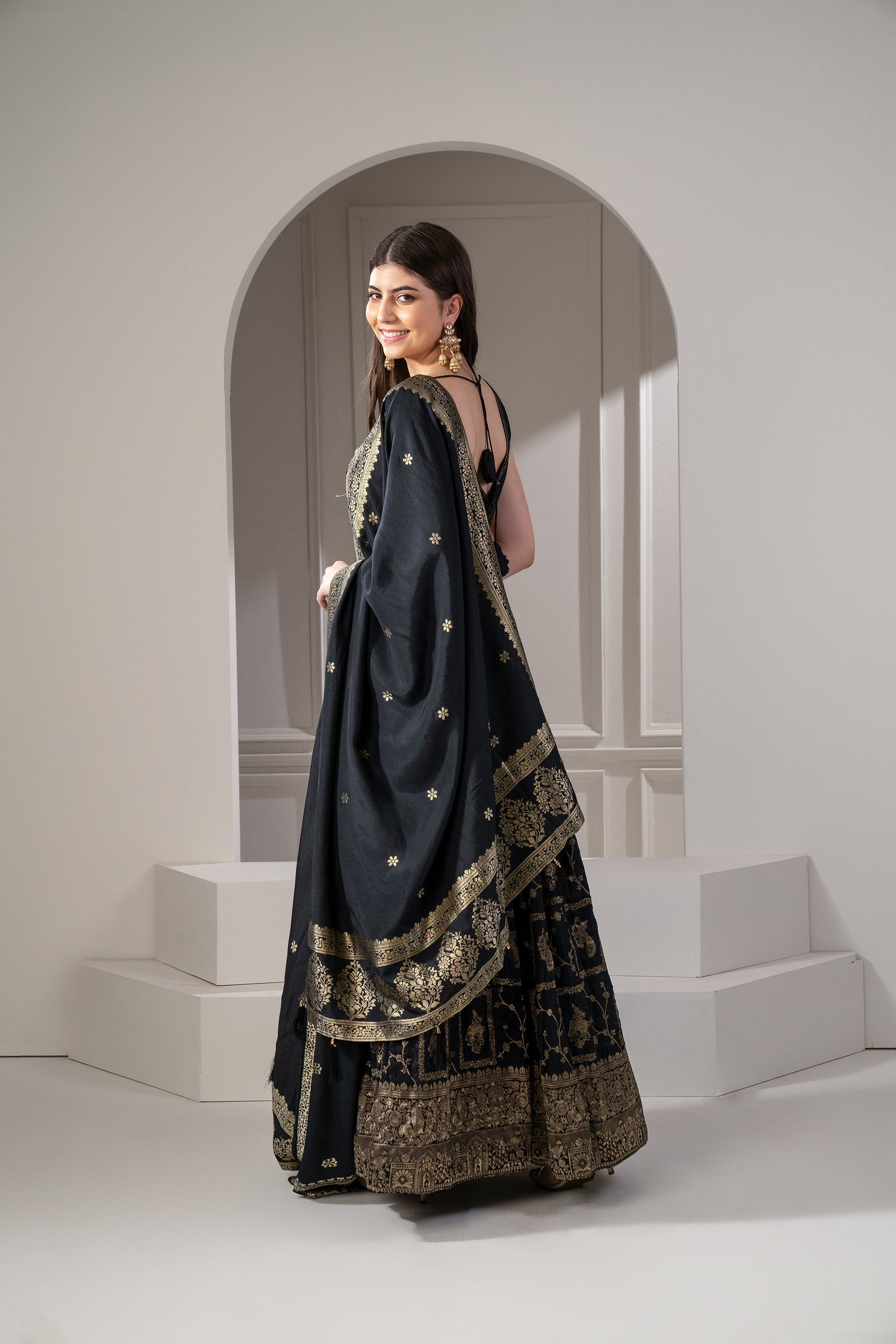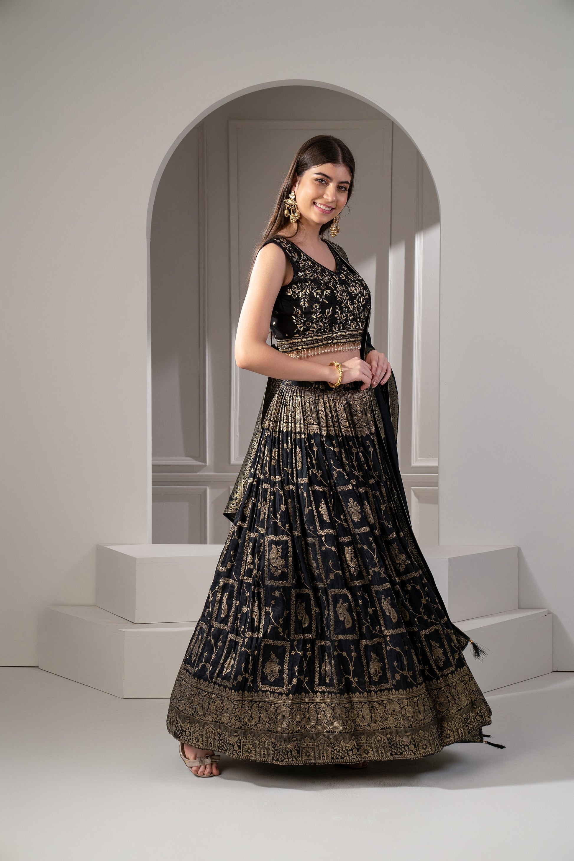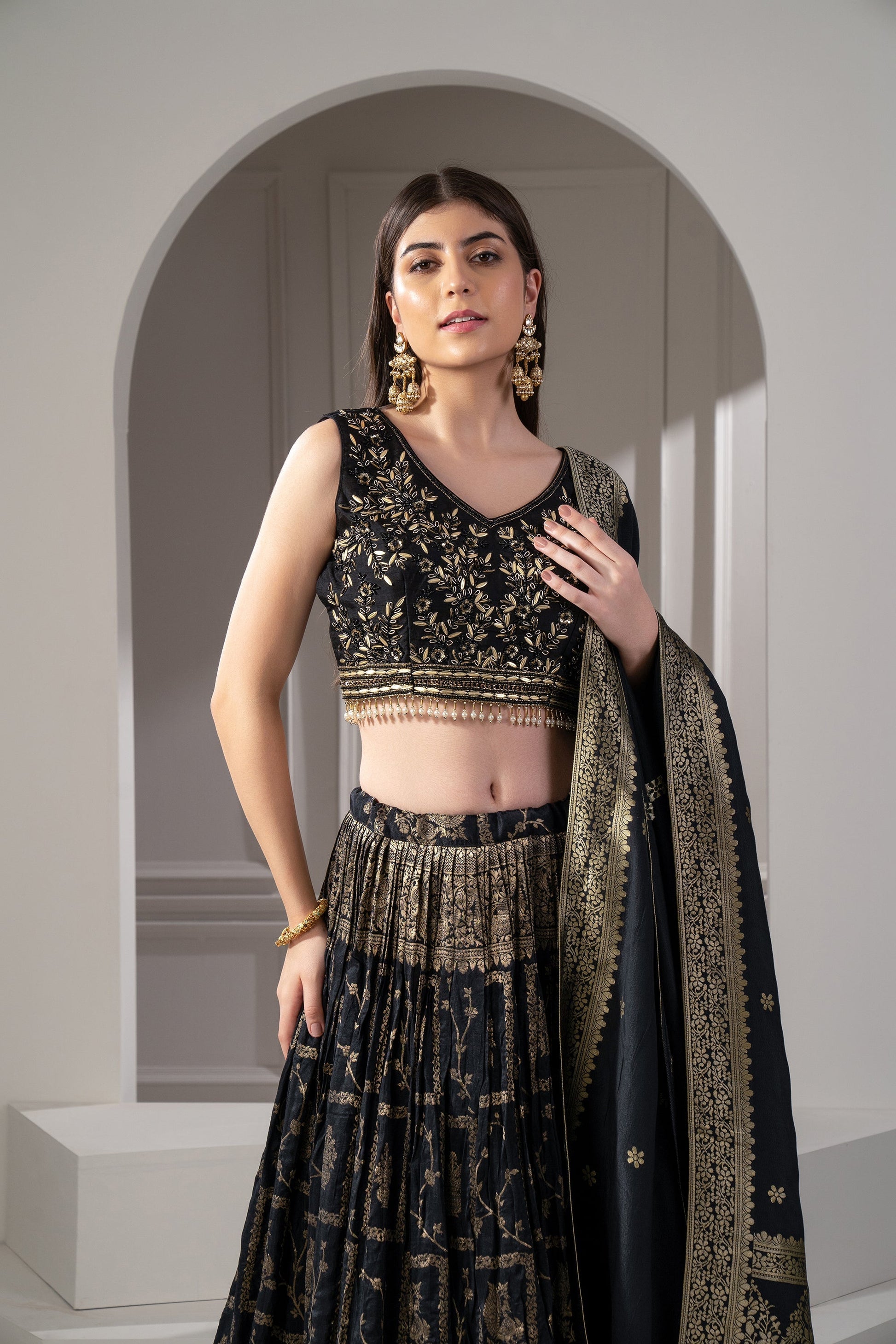 Onyx Black semi silk printed lehenga. 2) Topped with a matching silk dupatta with printed borders. 3) Paired with a matching sleeveless padded choli with sequins, zari, cutdana and thread embroidery and pearl tassles.