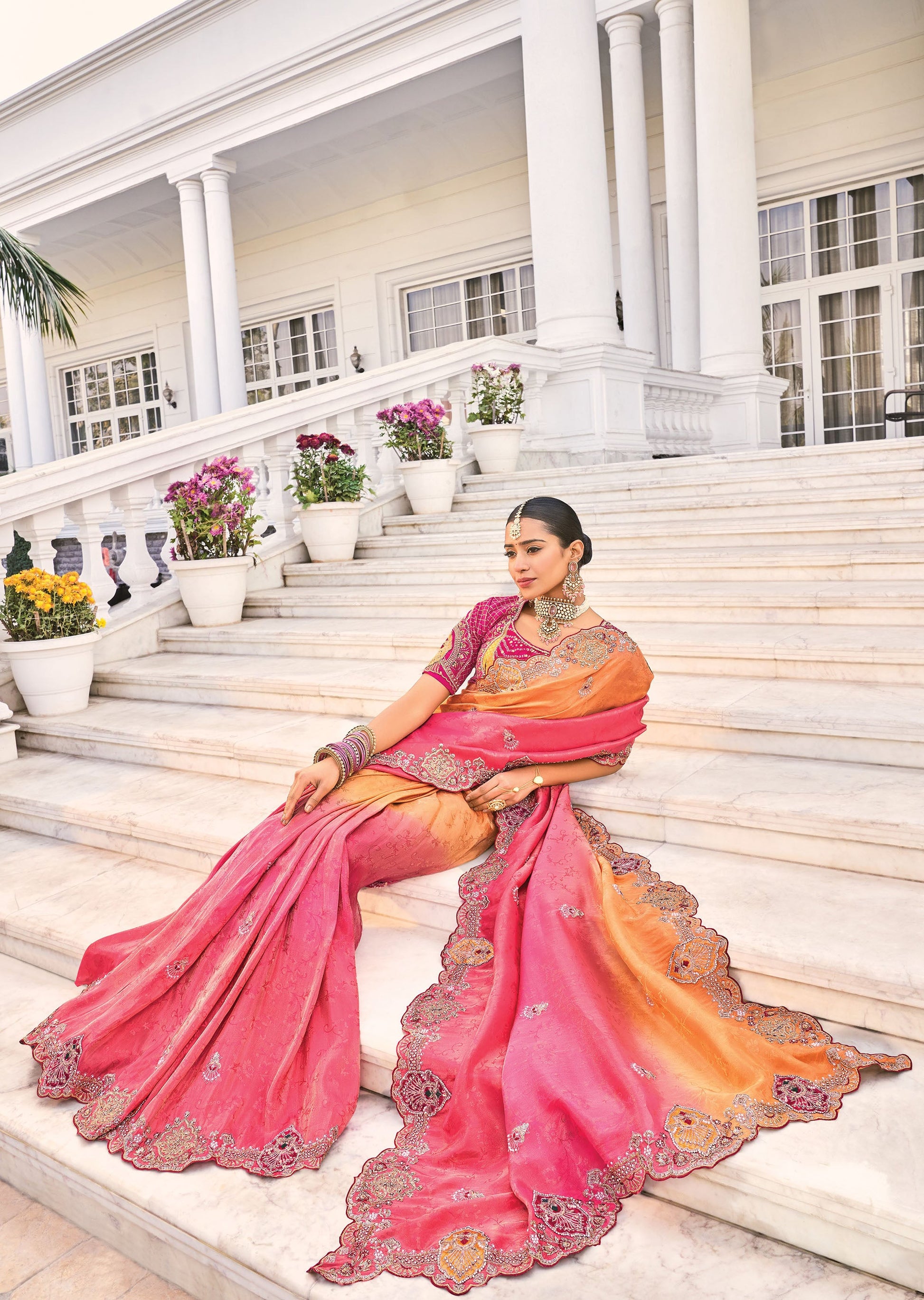 Orange and Pink Crepe Jacquard Zarkan Embroidery Party Wear Saree