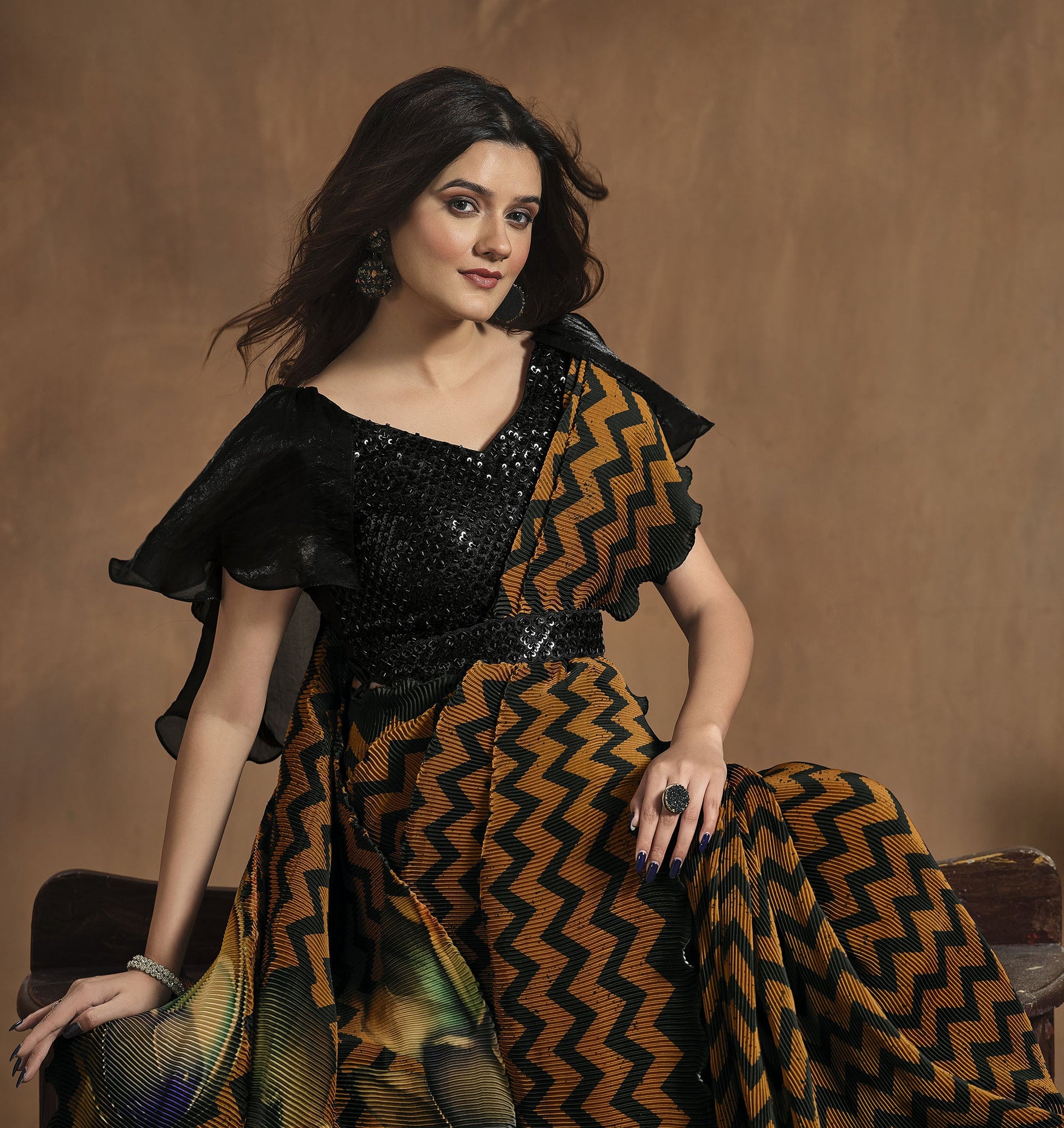 Orange & Black Satin Silk Readymade Digital Printed Saree