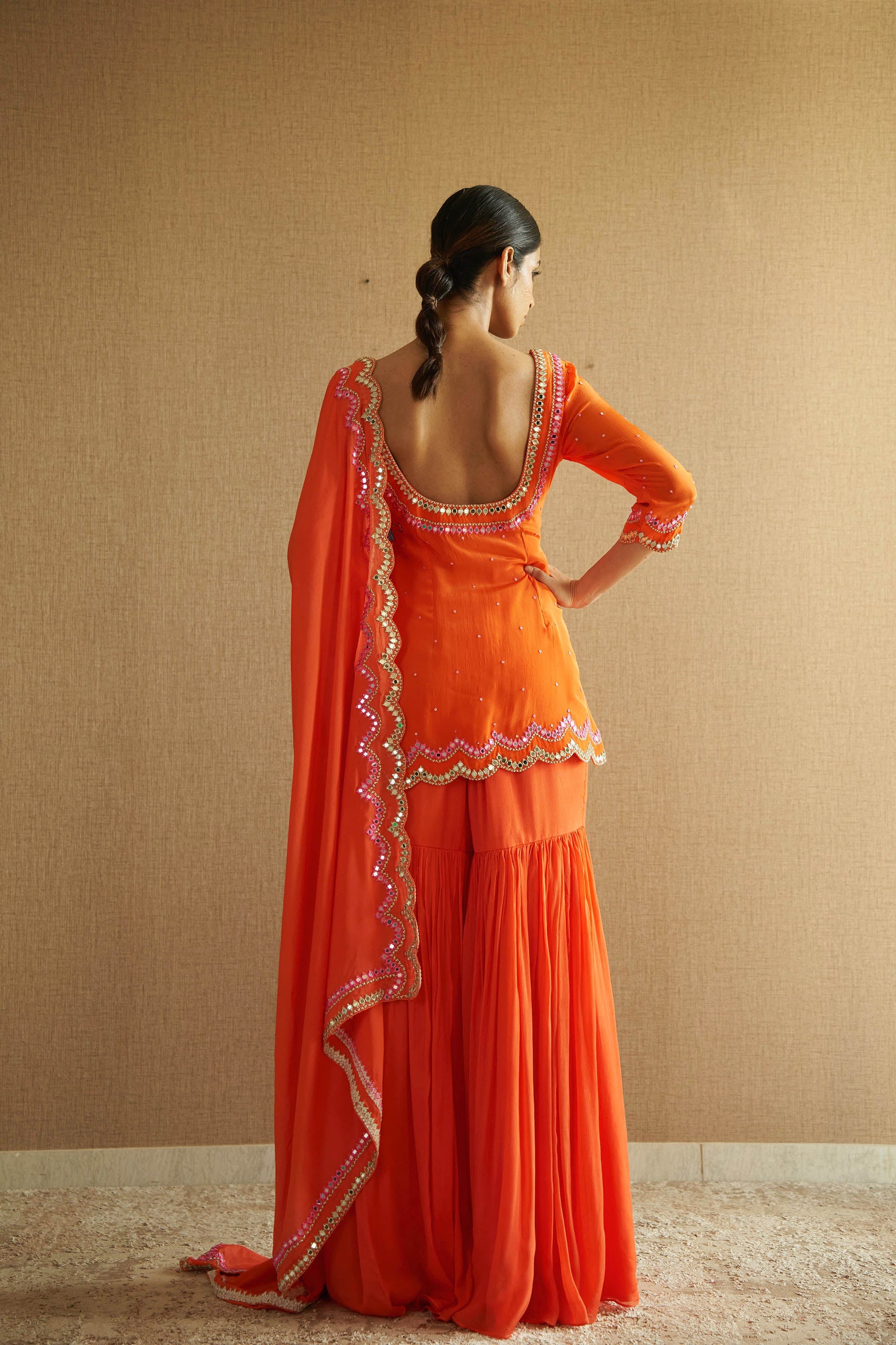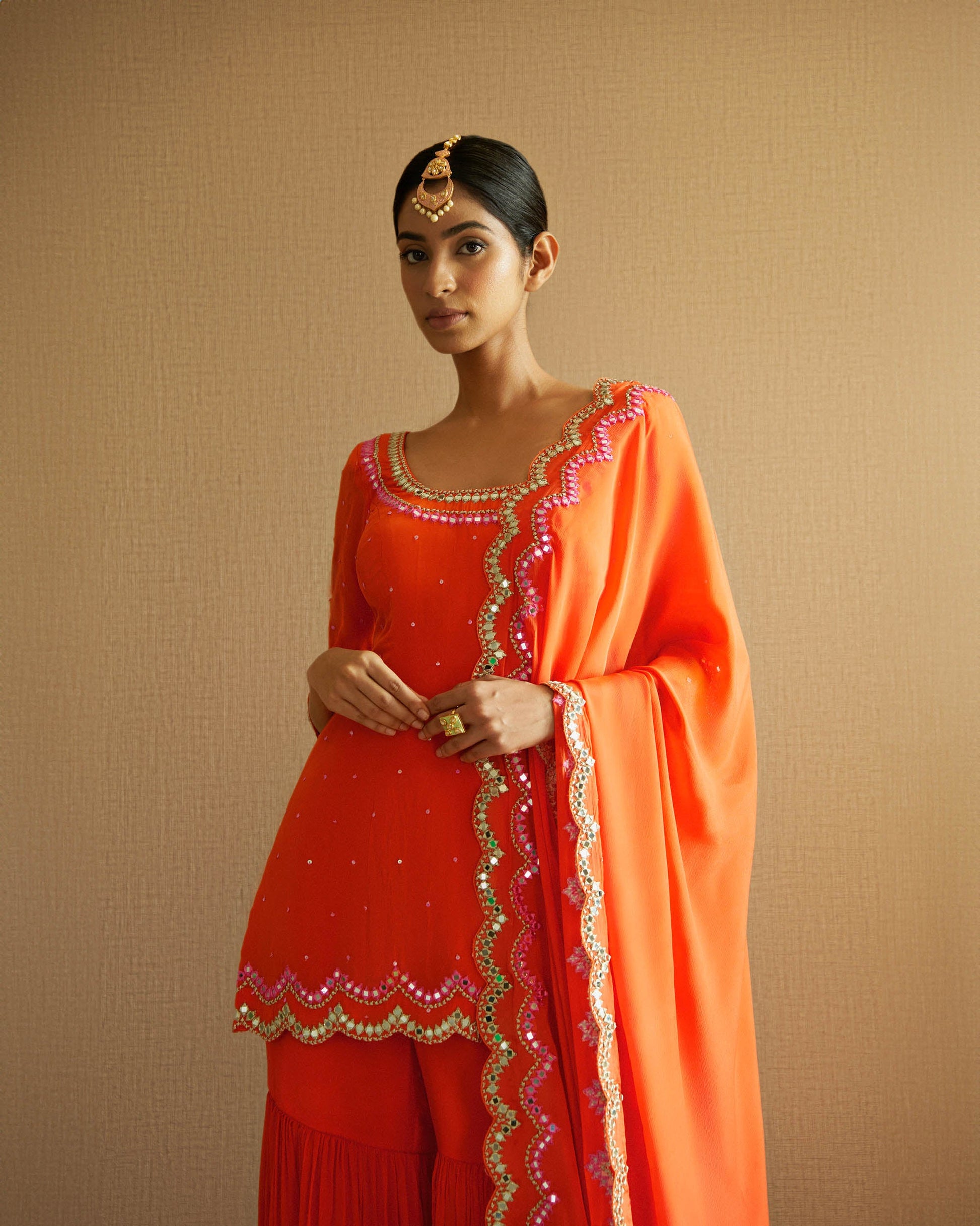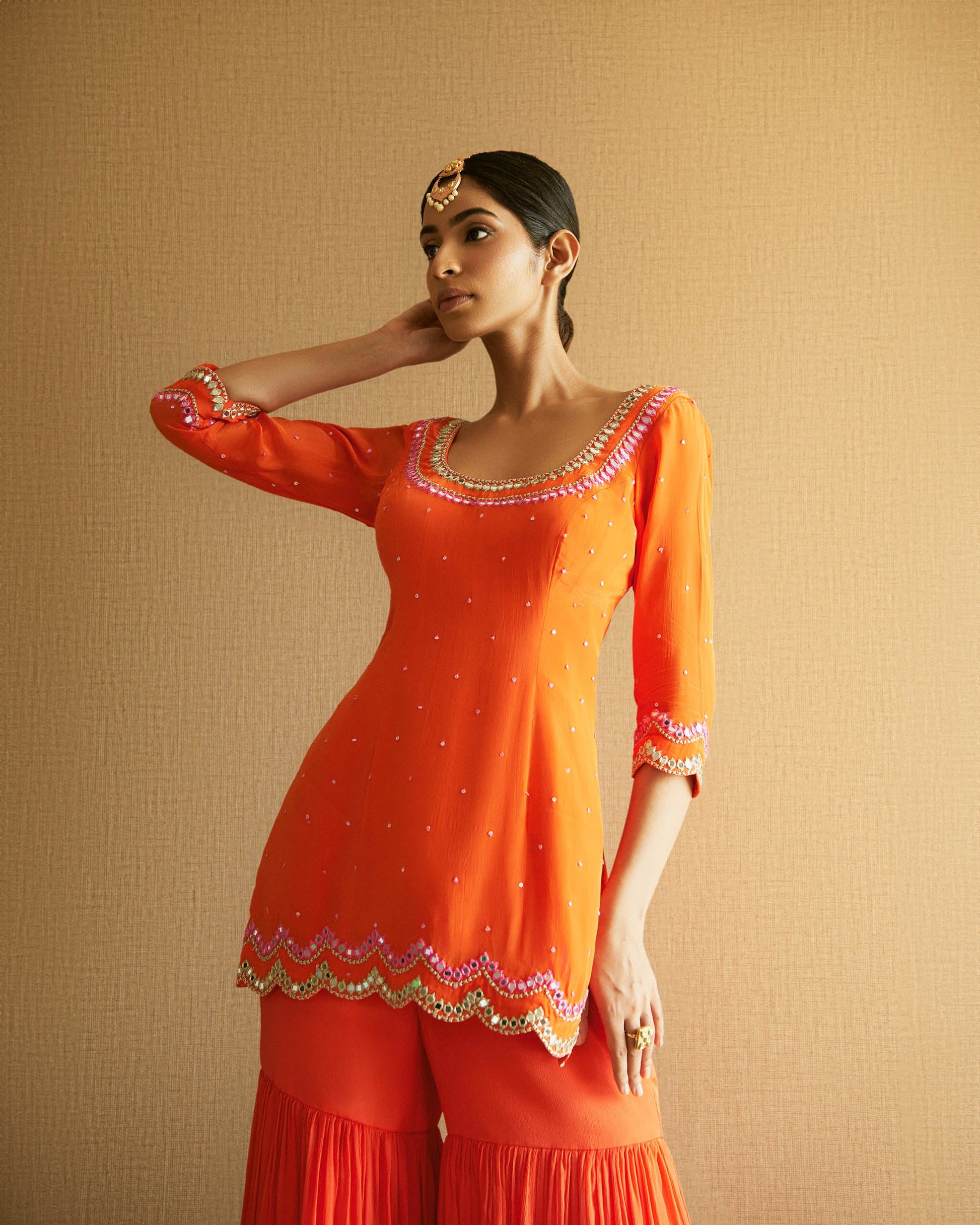 Orange crepe short mirror work kurti with scallop embroidery and baby pink sequin highlights, burnt peach pleated sharara and burnt peach embroidered dupatta.