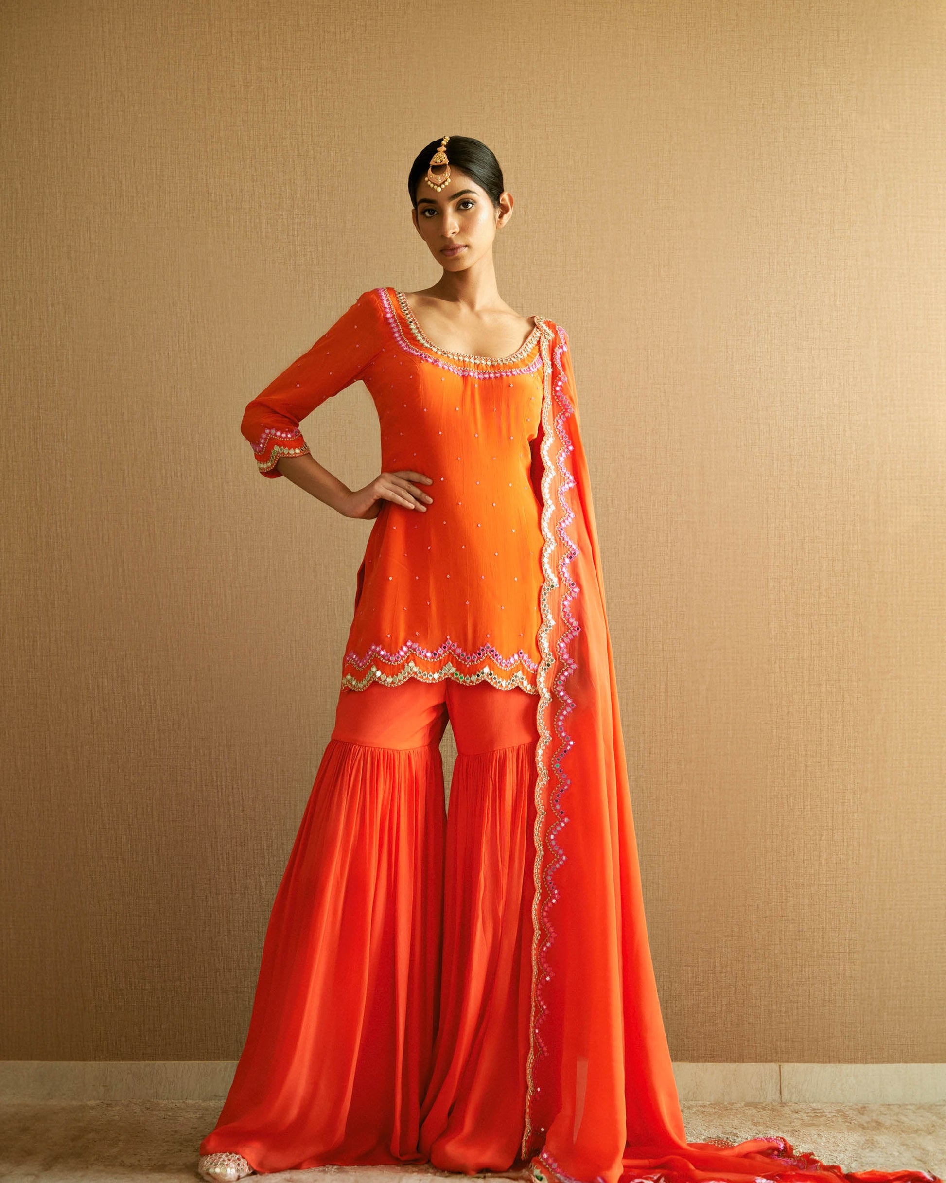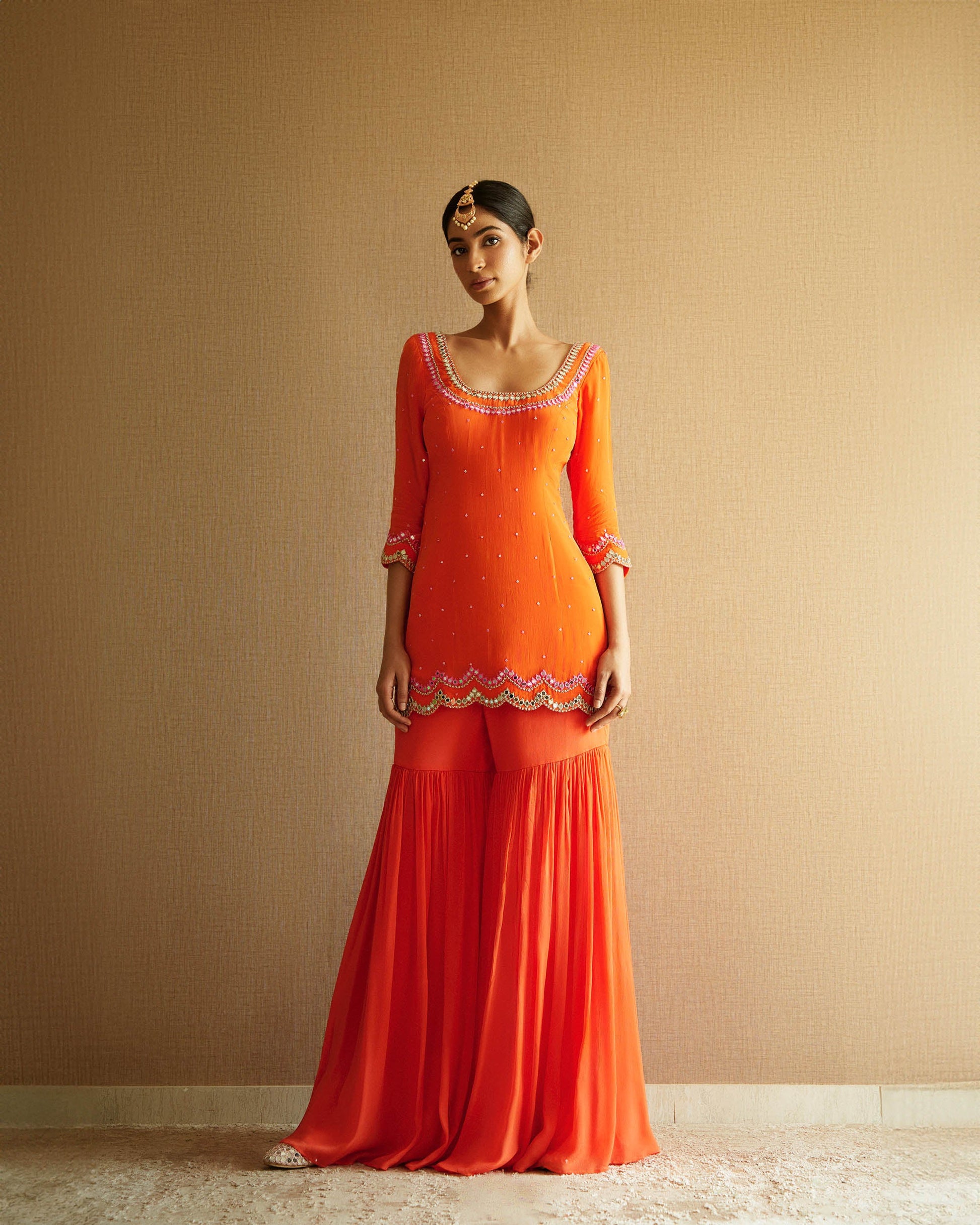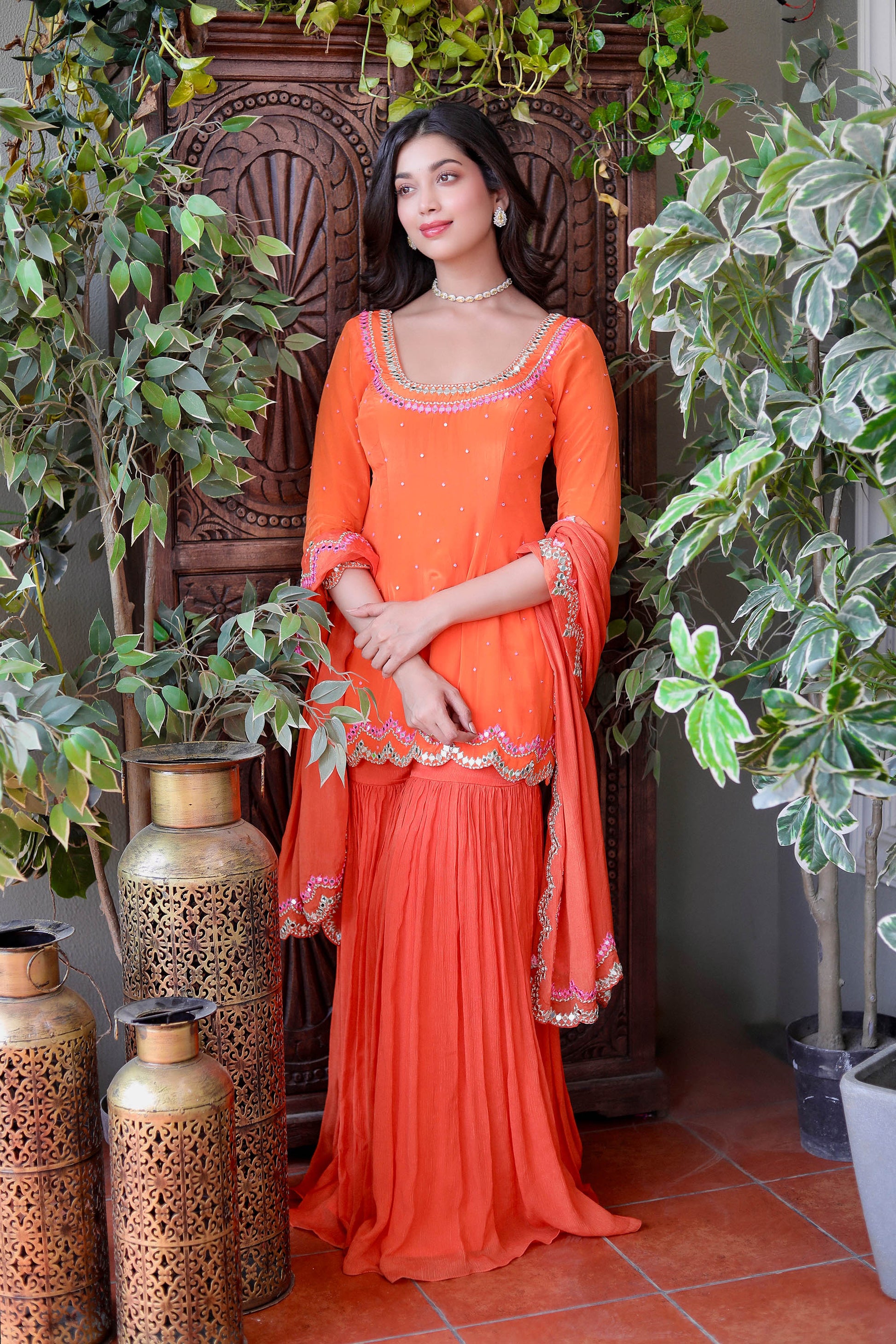 Orange crepe short mirror work kurti with scallop embroidery and baby pink sequin highlights, burnt peach pleated sharara and burnt peach embroidered dupatta.