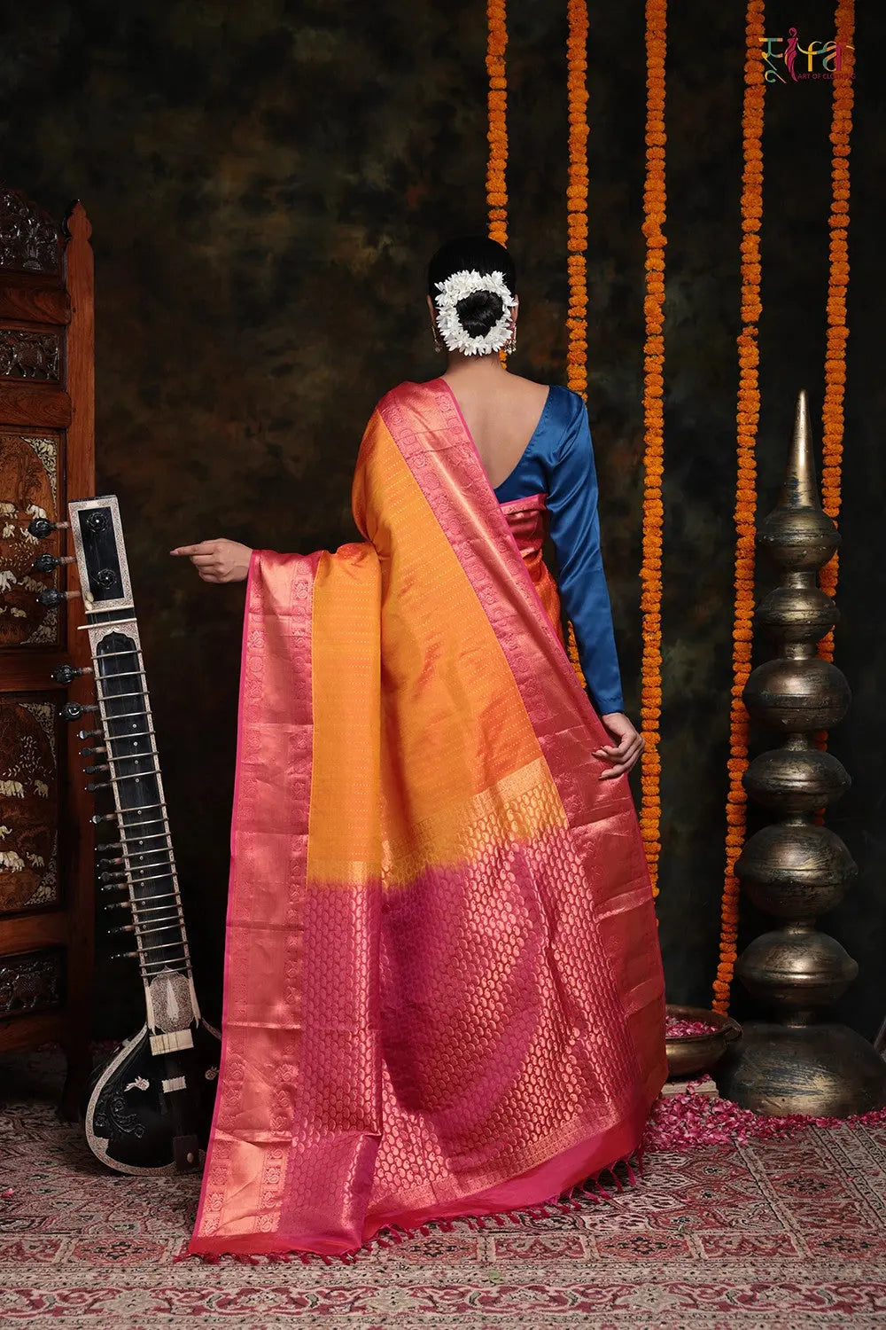 Indulge in the mesmerizing allure of our Orange pure Silk Kanchipattu saree, featuring a stunning self design and adorned with a vibrant hot Pink Kanchi border, beautifully embellished with Golden zari. With its captivating charm extending to the Pallu, this masterpiece promises to elevate your presence and effortlessly steal the spotlight at every festive and wedding celebration. Embrace the sheer elegance of this opulent attire, and prepare to be the center of attention, radiating unparalleled grace and captivating hearts with every step you take.