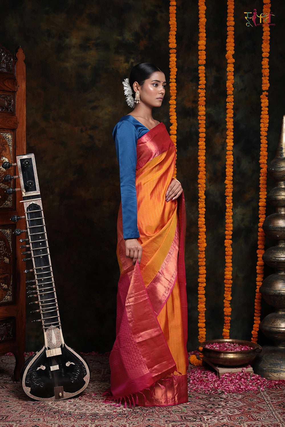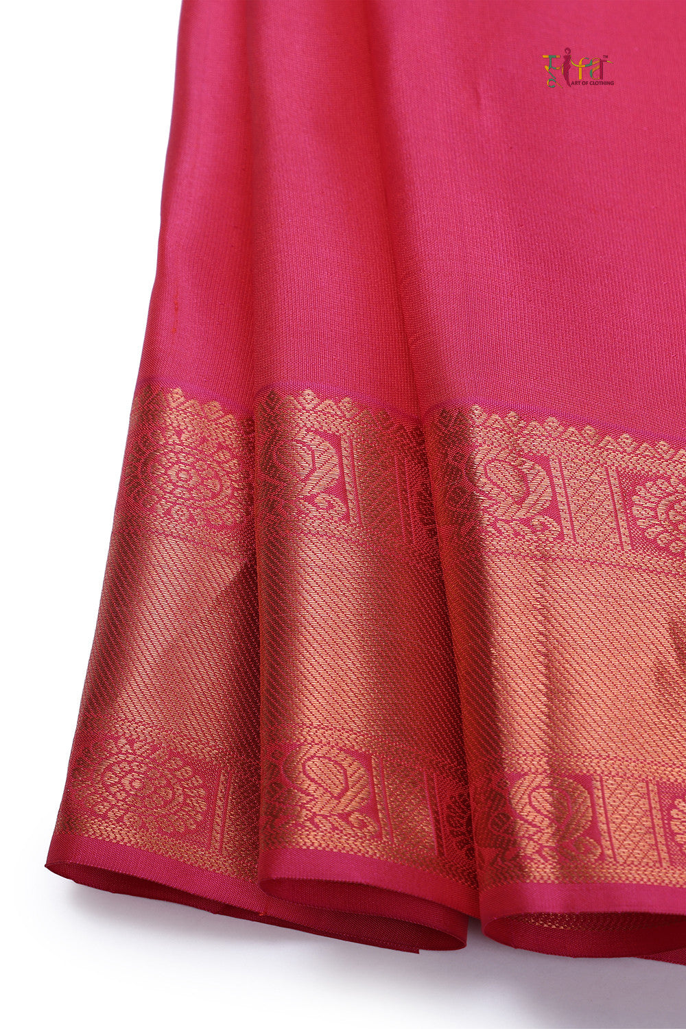 Indulge in the mesmerizing allure of our Orange pure Silk Kanchipattu saree, featuring a stunning self design and adorned with a vibrant hot Pink Kanchi border, beautifully embellished with Golden zari. With its captivating charm extending to the Pallu, this masterpiece promises to elevate your presence and effortlessly steal the spotlight at every festive and wedding celebration. Embrace the sheer elegance of this opulent attire, and prepare to be the center of attention, radiating unparalleled grace and captivating hearts with every step you take.