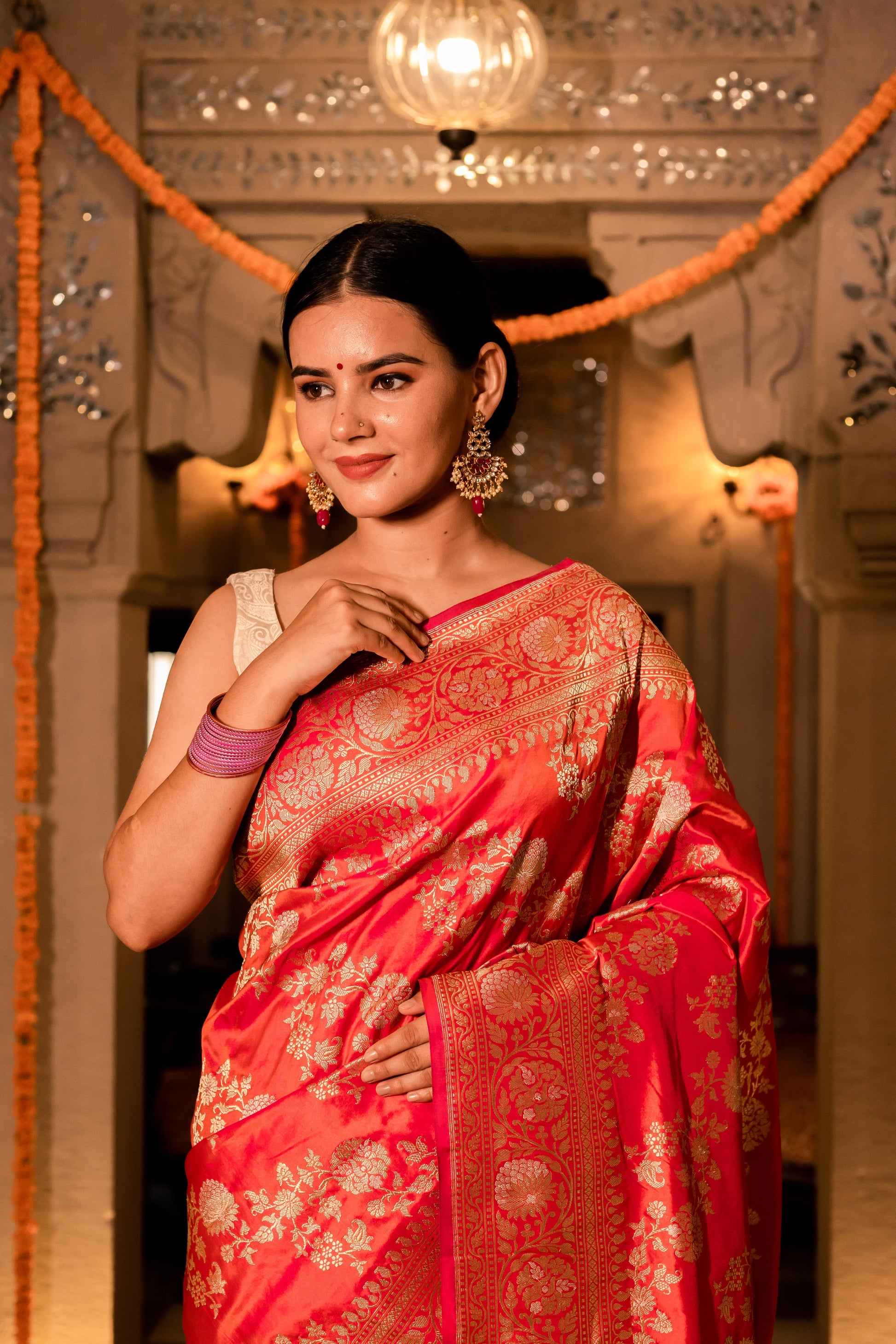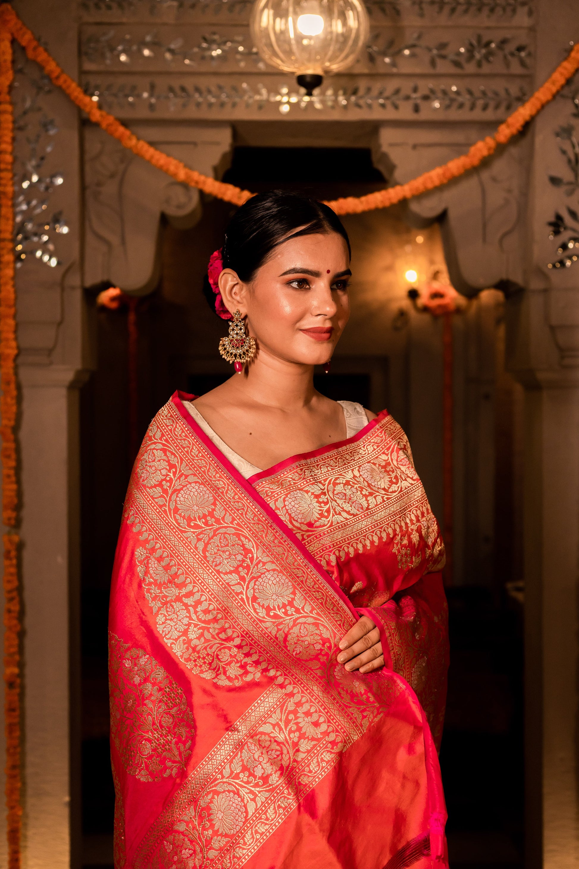 Product Description: The Orange Handwoven Kadwa Katan Silk Saree is a testament to the timeless traditions of Banaras. It features an intricate Adda pattern of Jaal design in gold and silver zari with meena work. This saree showcases the artistry of handloom Banarasi weaving and is a symbol of elegant and sustainable fashion.
