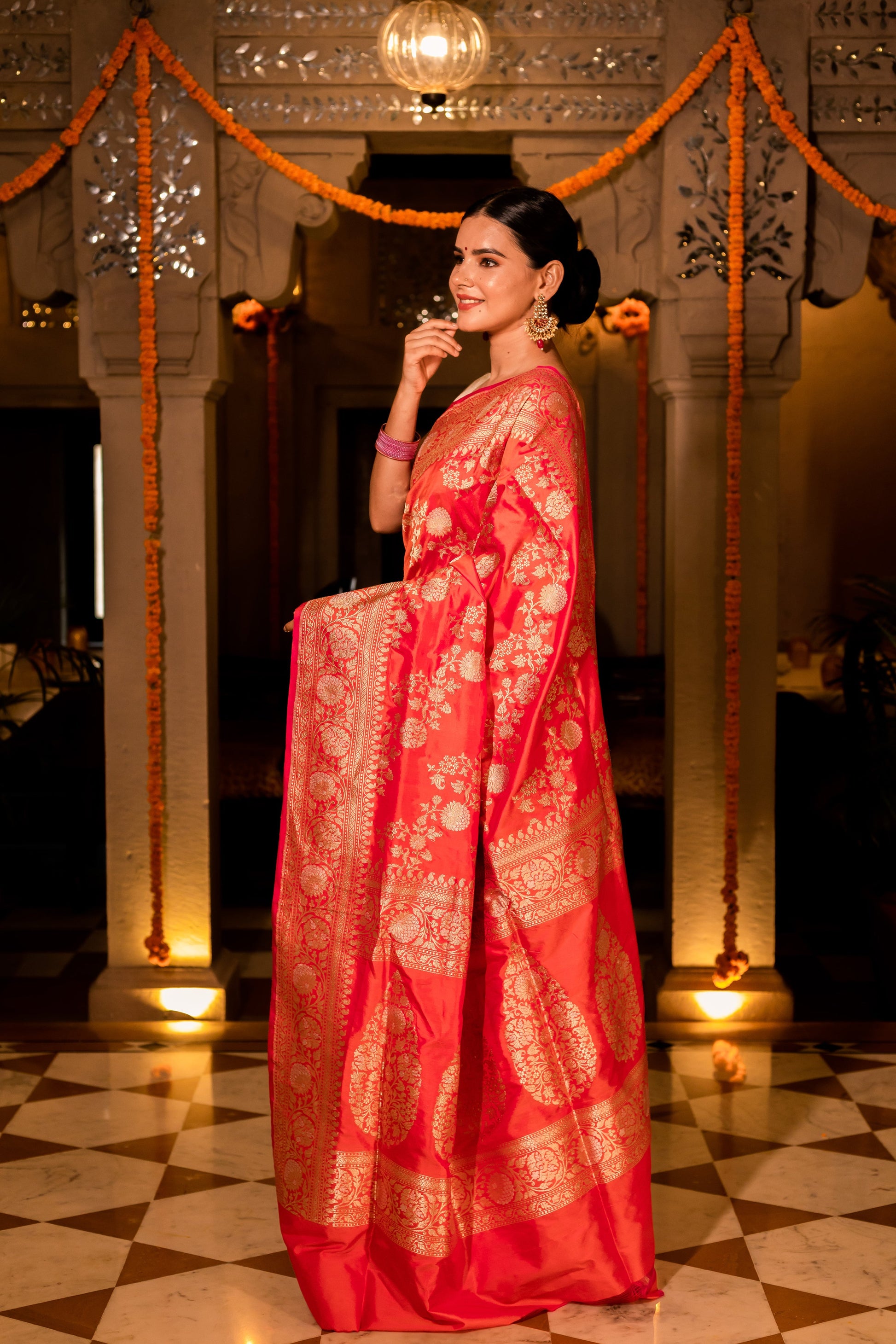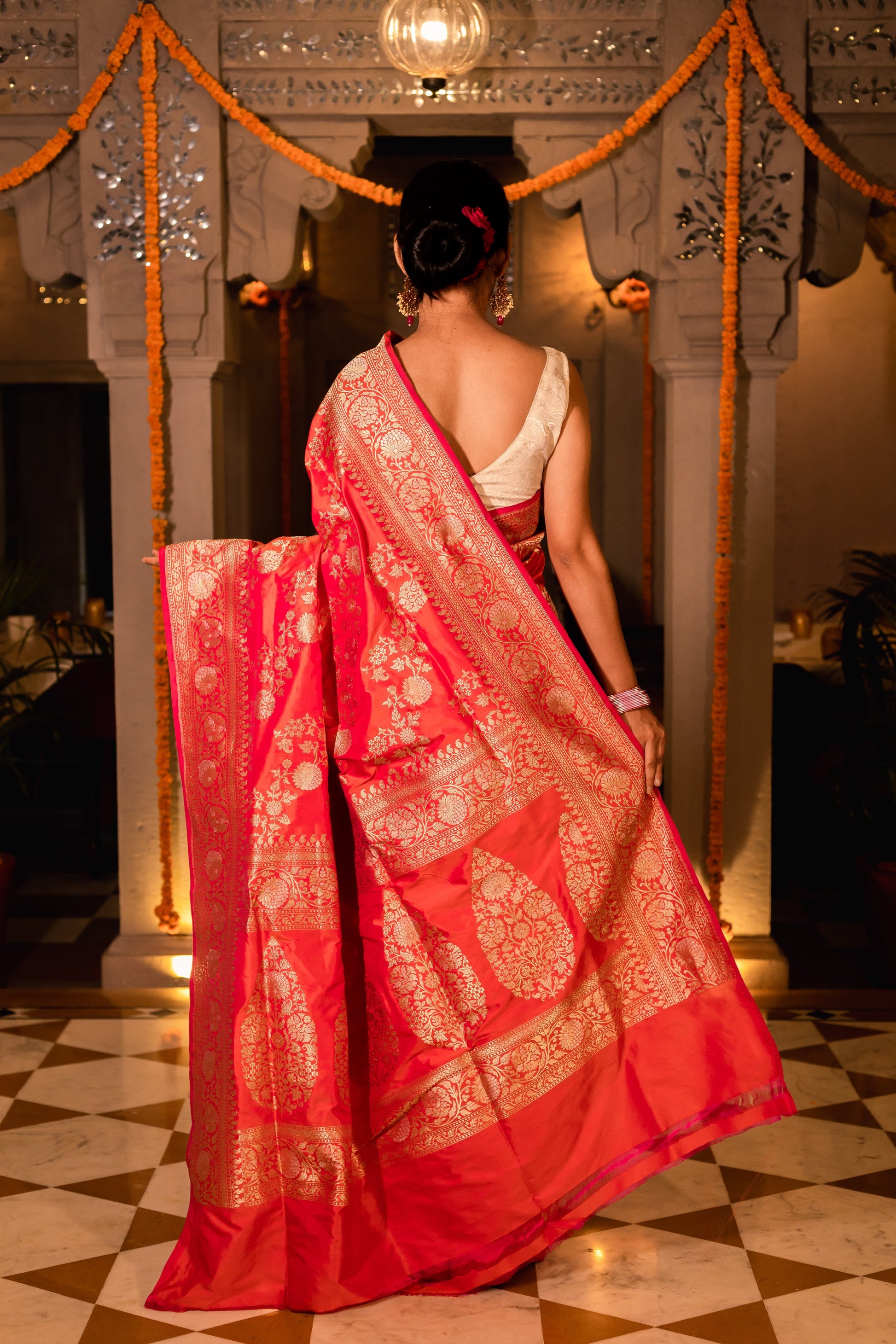 The Orange Handwoven Kadwa Katan Silk Saree is a perfect choice for those who appreciate the beauty of tradition and sustainable fashion. Its intricate design and rich colors make it a statement piece for special occasions and celebrations.
