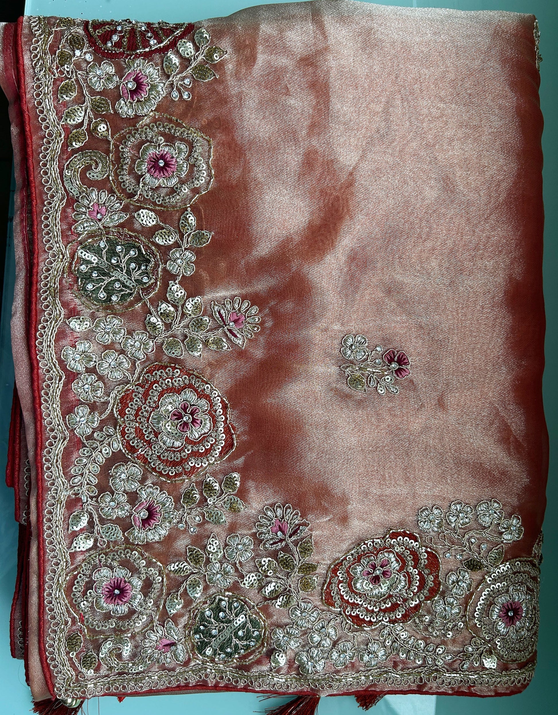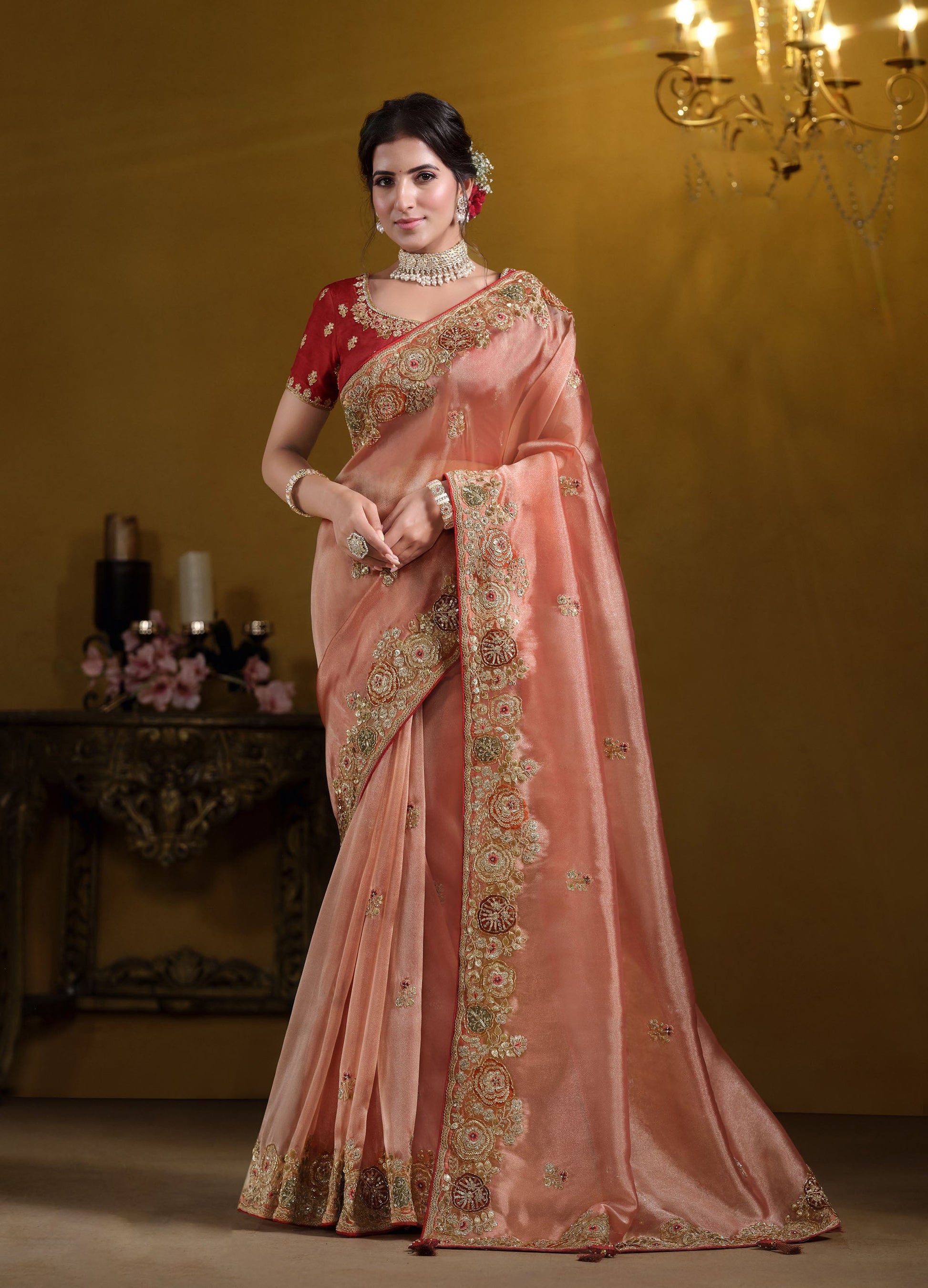 Are you seeking something exclusive? We've got what you require! This Orange Twill Tissue Khatli Work Festive Saree with its Khatli work and orange color is the perfect option for those seeking to make an impact. You will certainly be the center of attention in this Saree if you wear it to a wedding reception, an engagement party, or a sangeet. Pictured here is a bride wearing the Orange Twill Tissue Khatli Work Festive Saree which you can purchase today!