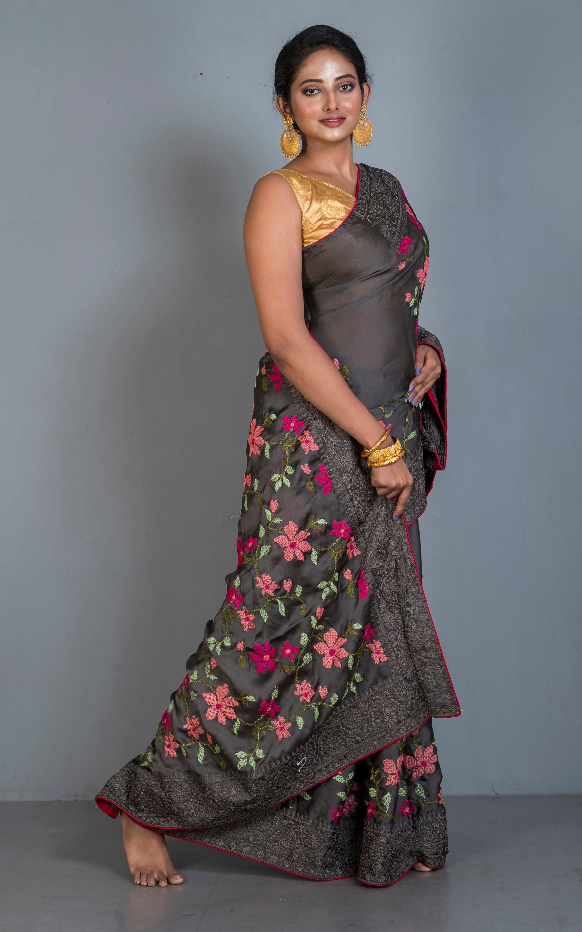 Parsi Cross Stitch Work Designer Italian Crepe Silk Saree in Taupe Brown, Hot Pink and Multicolored Thread Work