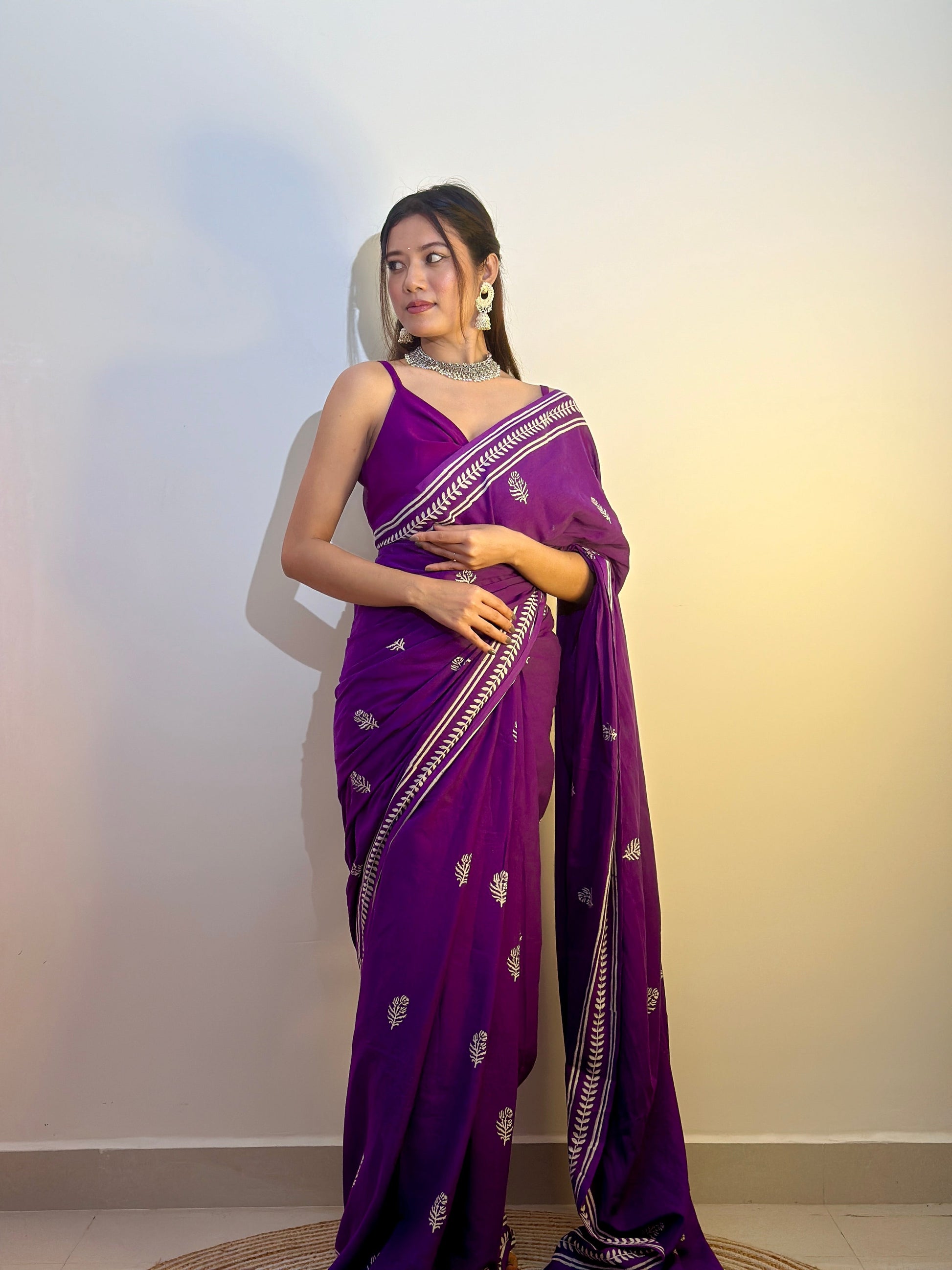 Step into the world of elegance and charm with our exquisite purple handblock saree, crafted to perfection. Its intricate handblock designs exude sophistication, making it the perfect attire for cocktail parties. The rich hue of purple adds a touch of regality, while the soft drape of the saree enhances your wardrobe aesthetics effortlessly. Whether you're sipping champagne or twirling on the dance floor, this saree will ensure you stand out with grace and style. Elevate your ensemble and leave a lasting impression with this timeless piece.