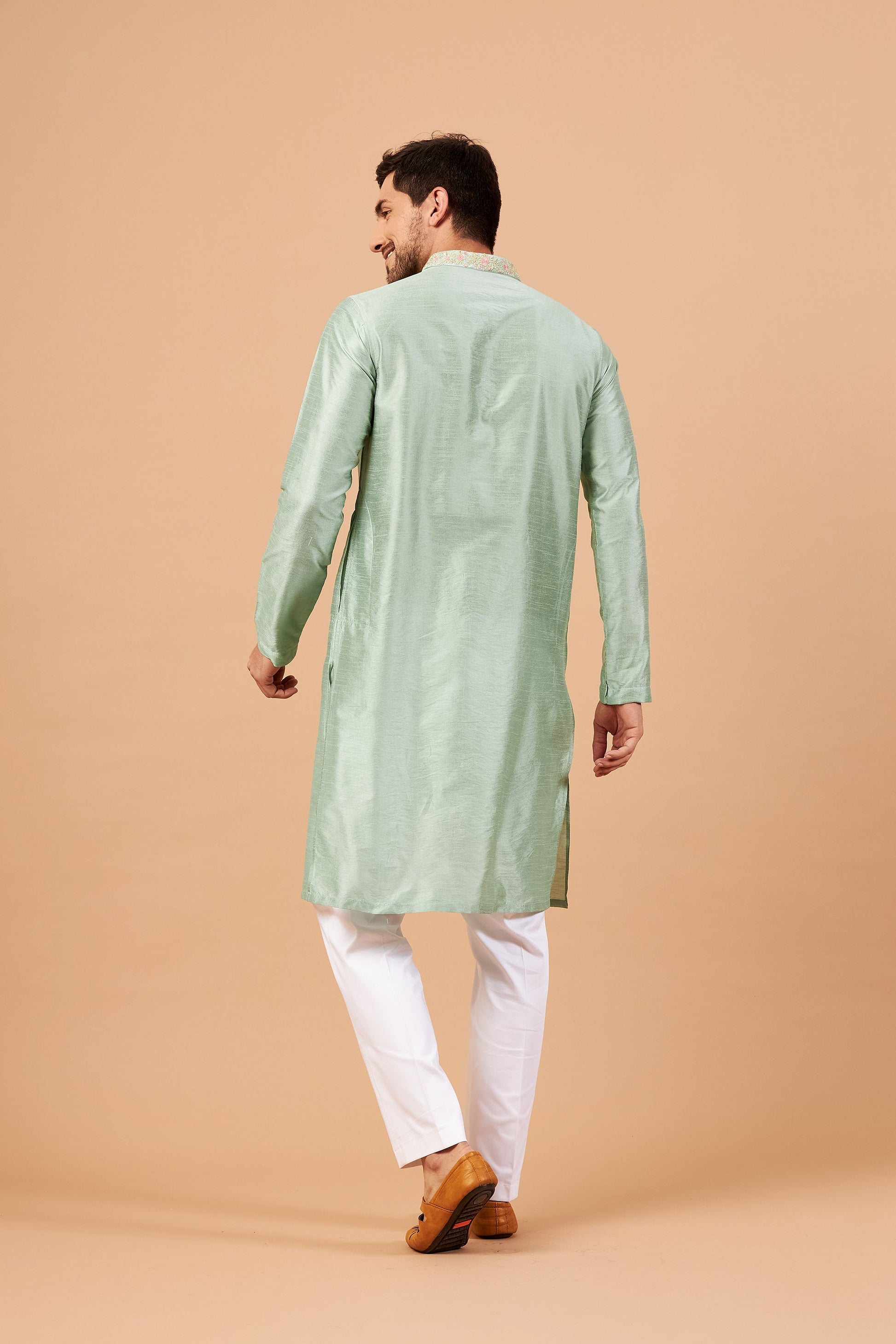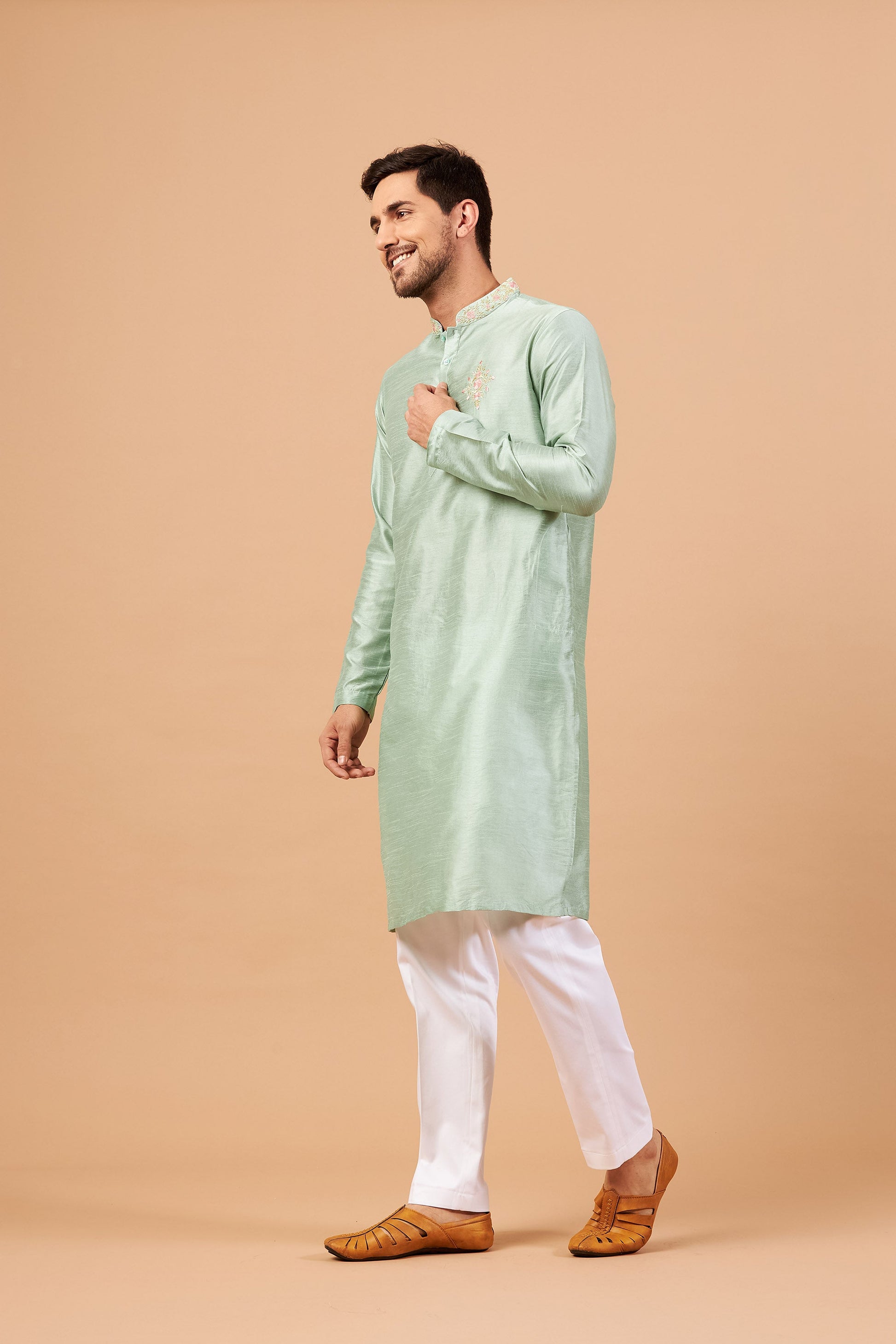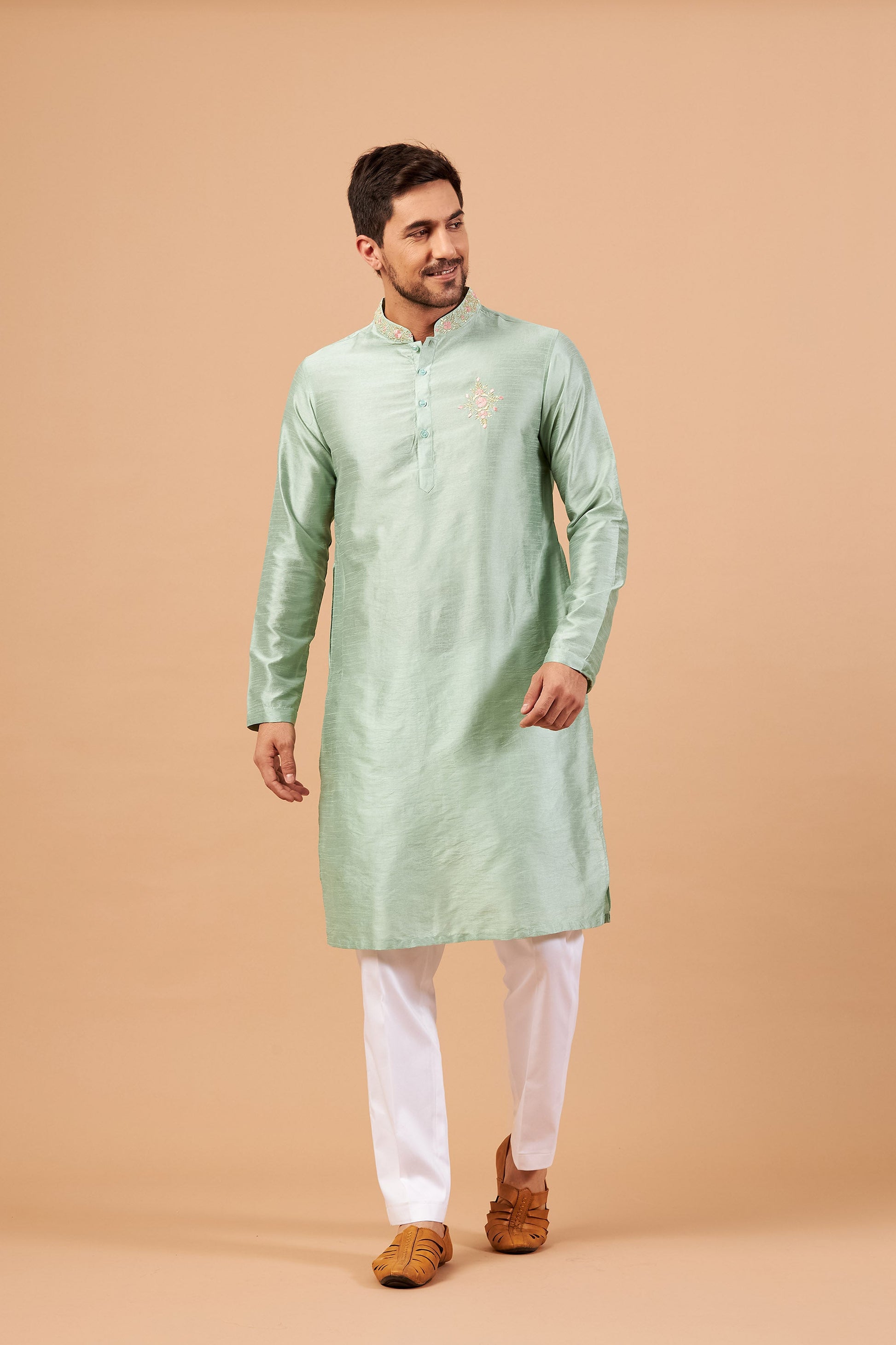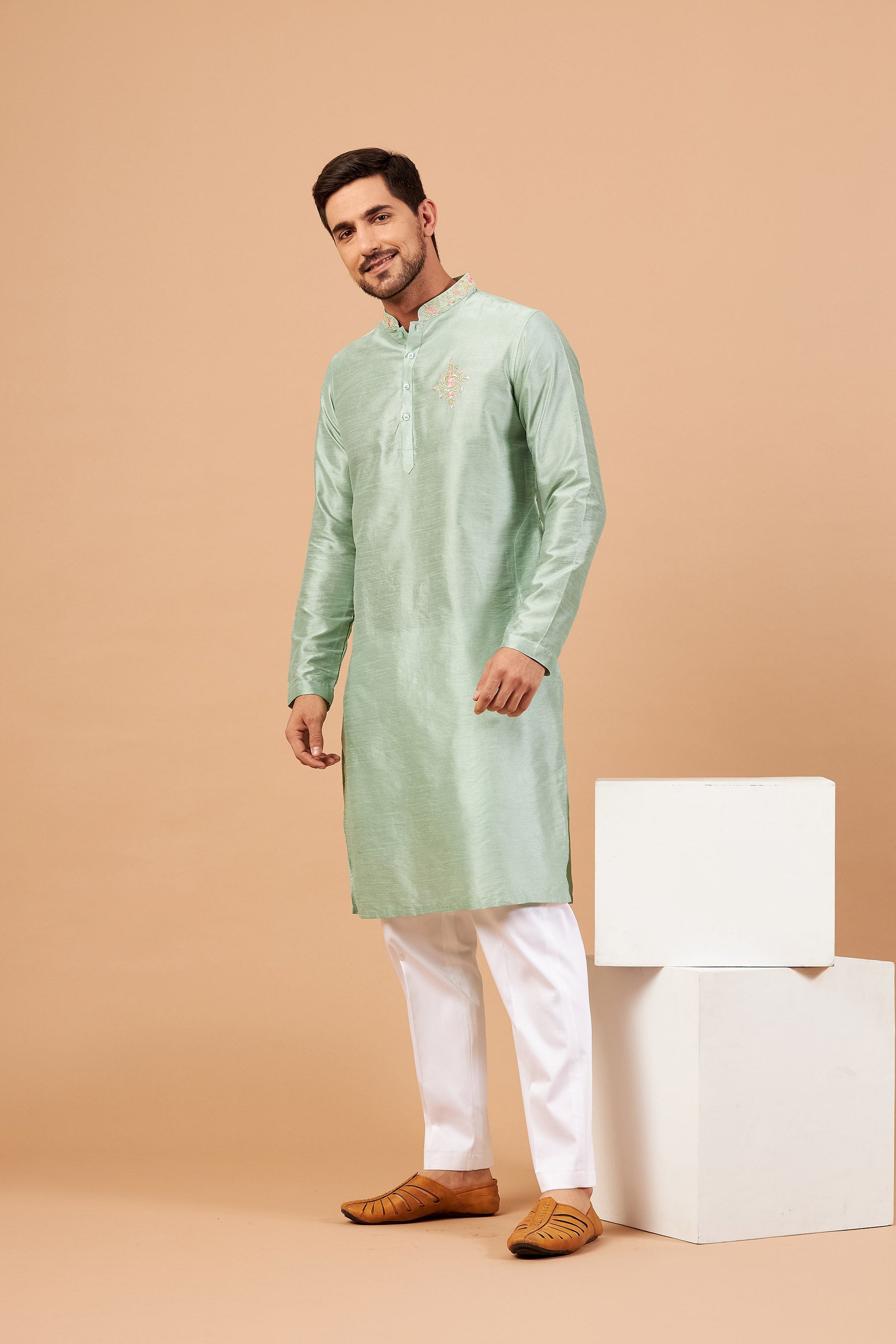 Featuring pastel green kurta in machine embroidery, embroidered near collar & motif the chest ,which makes you look sassy and fashion forward . It can be worn for multiple occasions, from casual outings to festive occasions .pair it up with white or same colored bottoms.