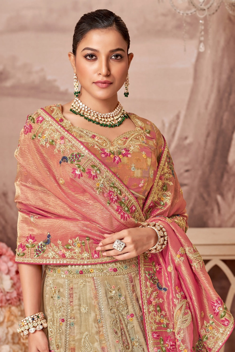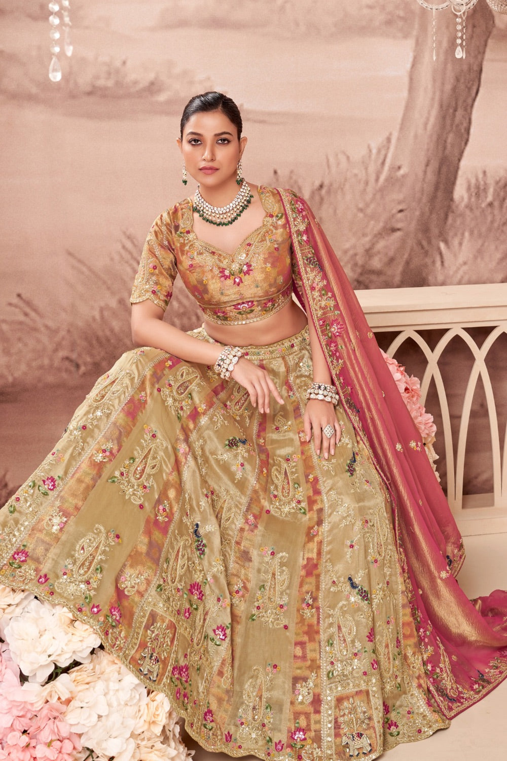 Peach & Beige banarasi silk lehenga set