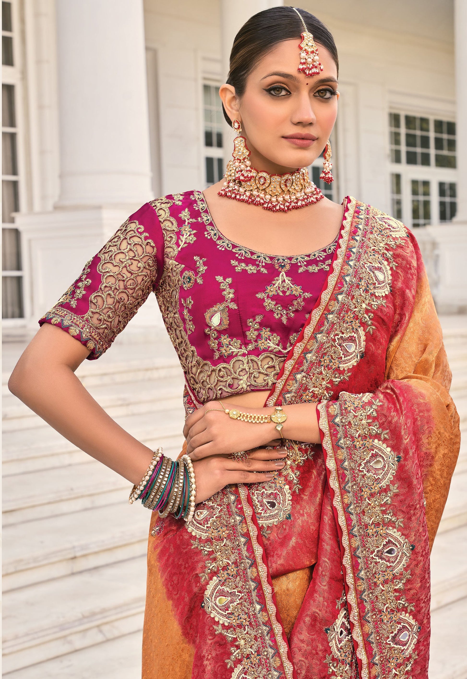 Peach Crepe Jacquard Zarkan Embroidery Festive Saree