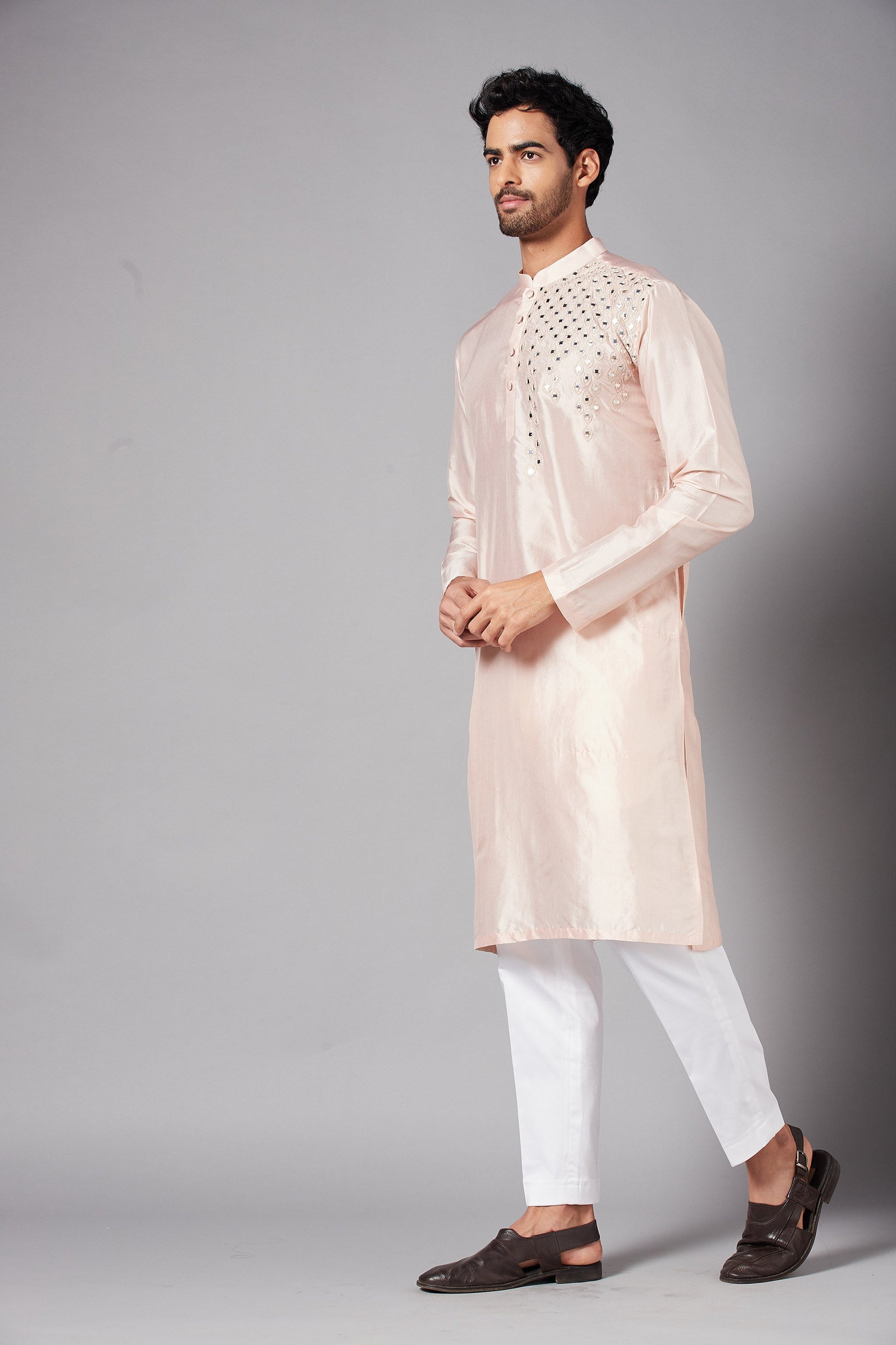 Featuring peach mirrored kurta in machine embroidery , which makes you look sassy and fashion forward . It can be worn for multiple occasions, from casual outings to festive occasions .It can be paired with white or same colored bottoms.