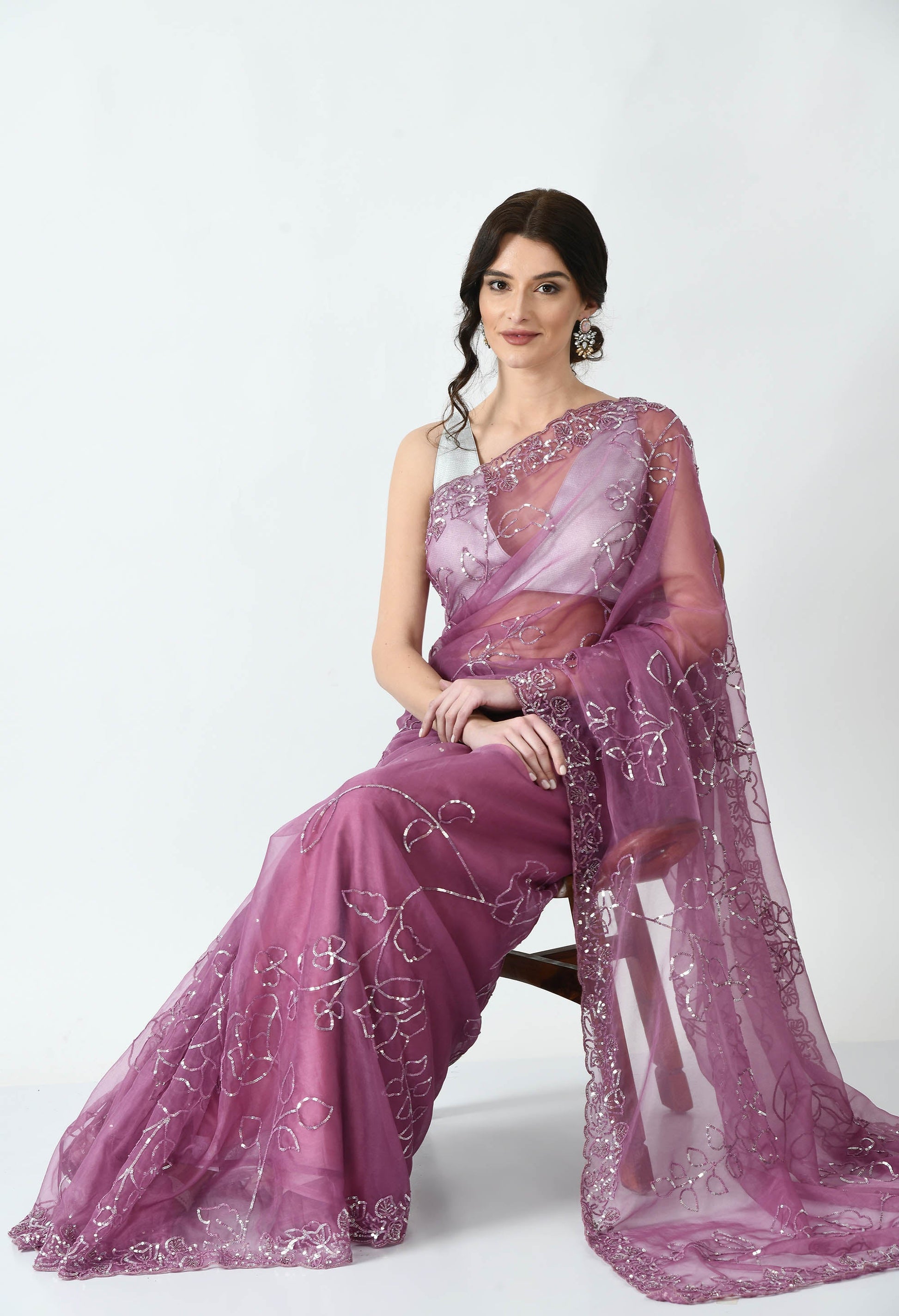 Beautiful Peach Hand embroidered Organza Designer Saree with hand embroidery work floral motifs. This is a saree that is tailor made efficiently with perfect exquisite detailing. Handmade to Embrace your special moments. Suitable for Parties , family gatherings and Weddings. Perfect for a wedding Guest