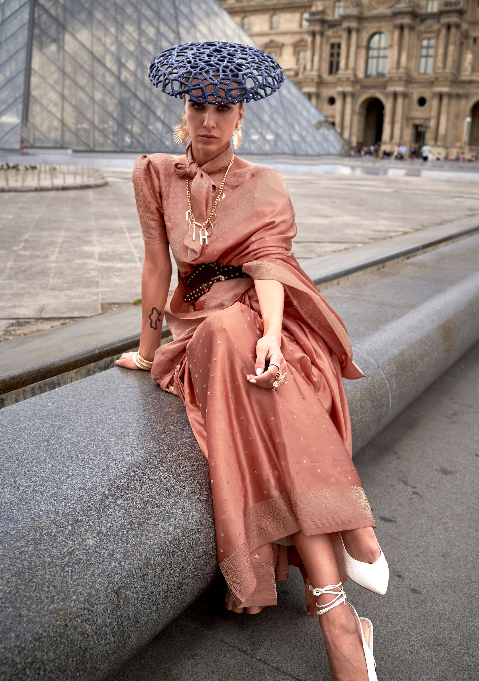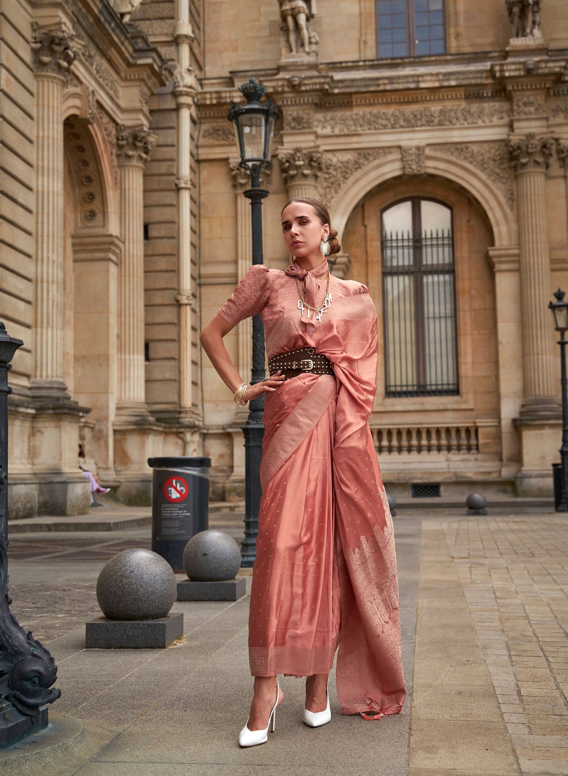 Peach Kamzah Silk Pure Satin Nylon Handloom saree