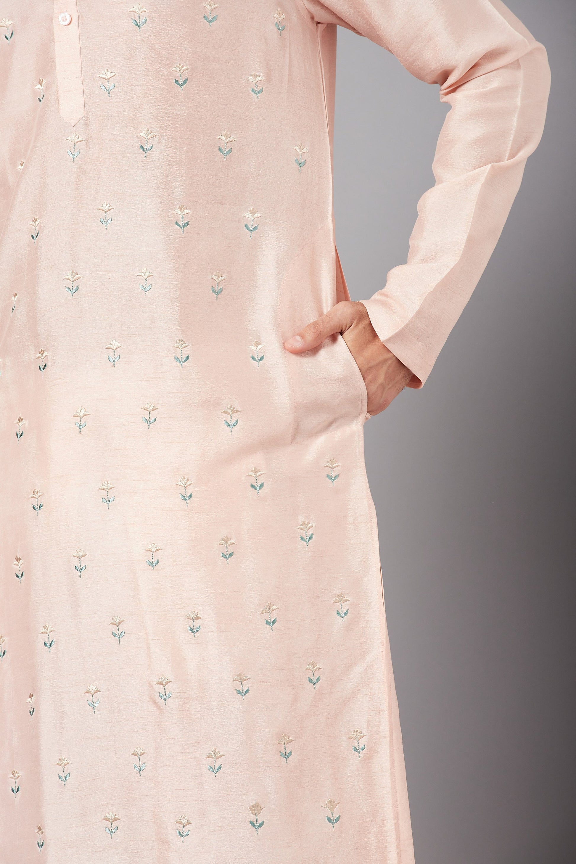 Peach Raw Silk Flower Embroidered Festive ( only Kurta )