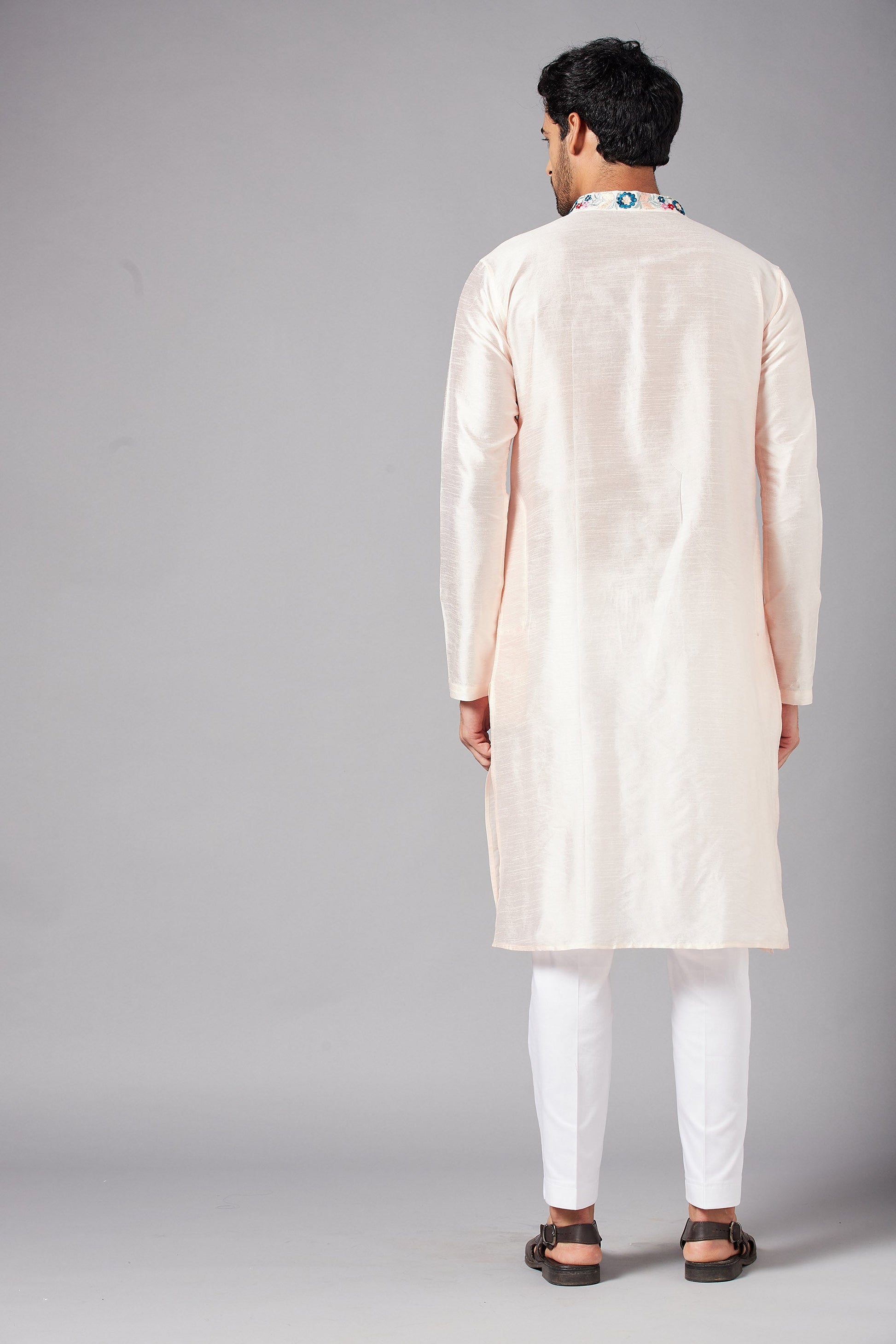 Light peach elegant machine embroided kurta. embroiderd near the collar & the chest. Pair it up with same colored or white colored pants