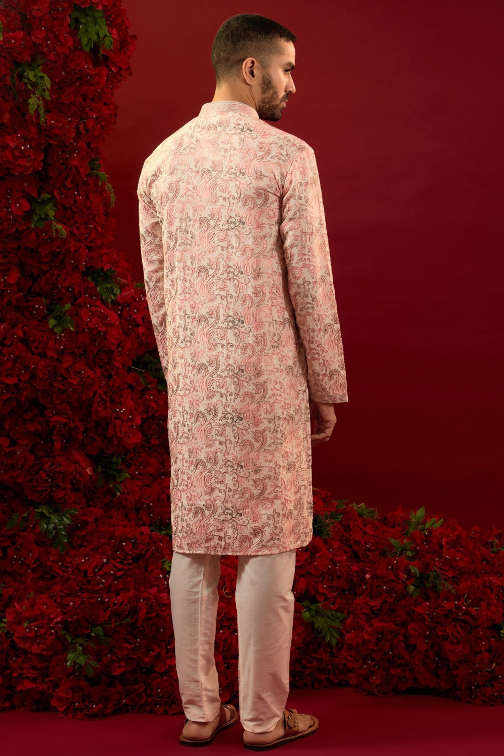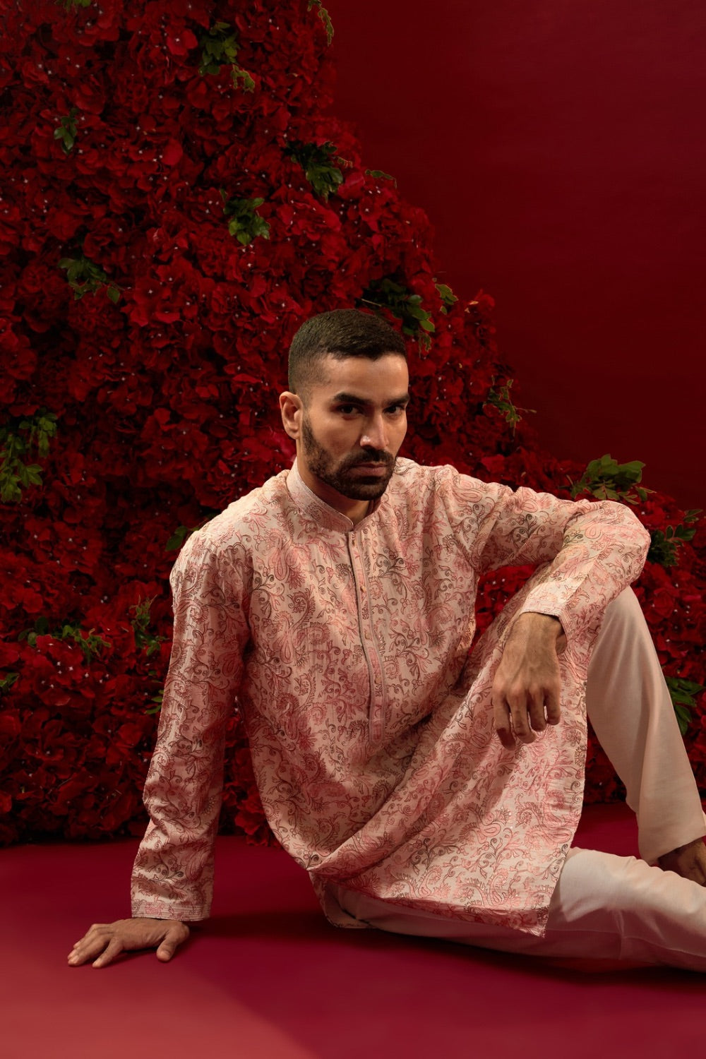 Elevate your style with the peach silk kurta set, crafted with hand and machine work. Complemented with white pajama.