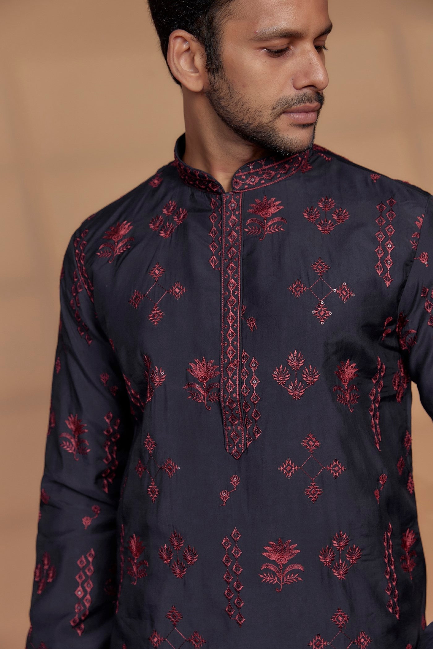 Featuring a nevy blue kurta in silk with sequins embroidery and mandarin neckline. It is paired with pristine white churidar pants. Perfect wear for a festive occasion.
