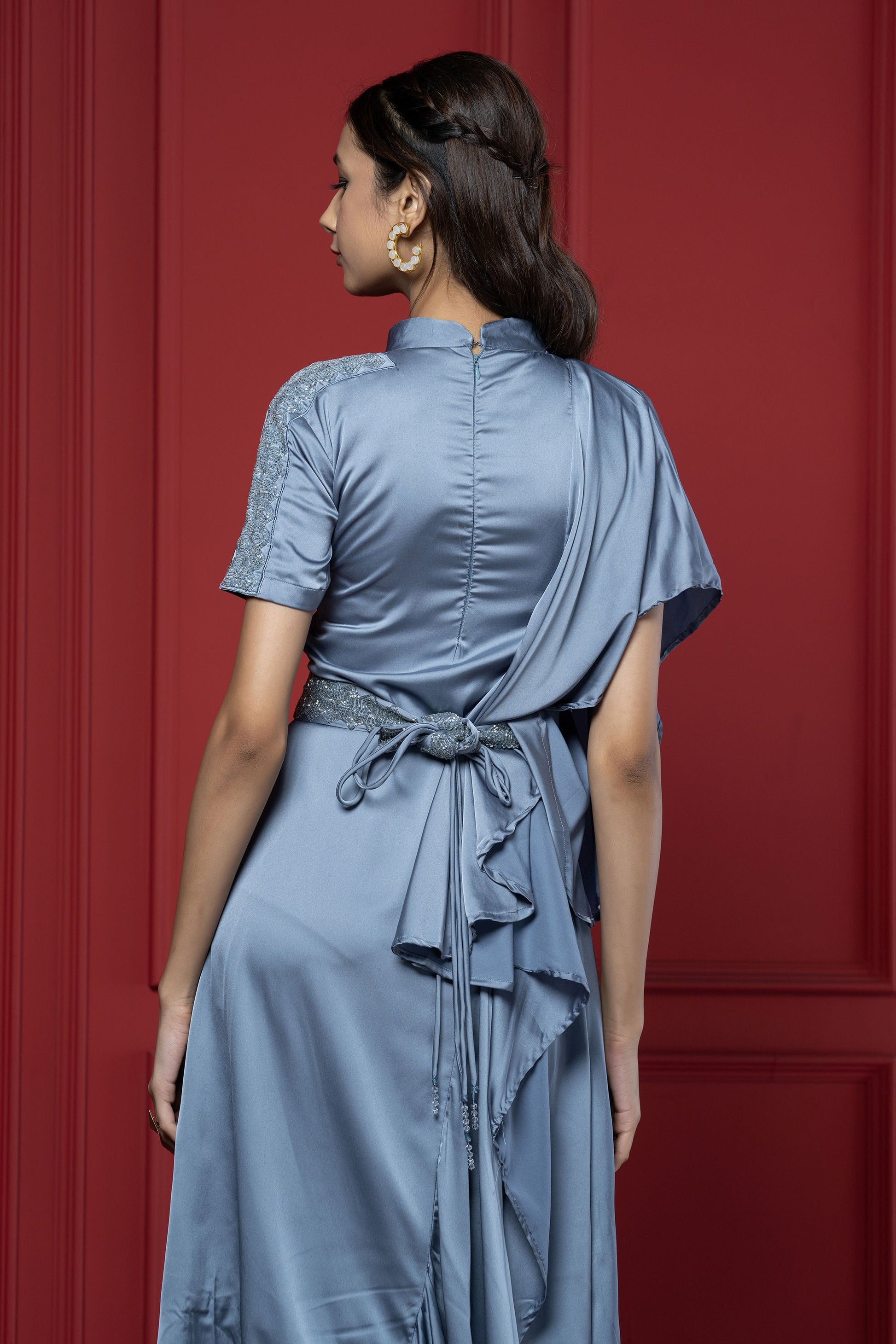 This Knee length gown provides a flattering look with A line cuts and flaired drape on one side with cut dana belt.