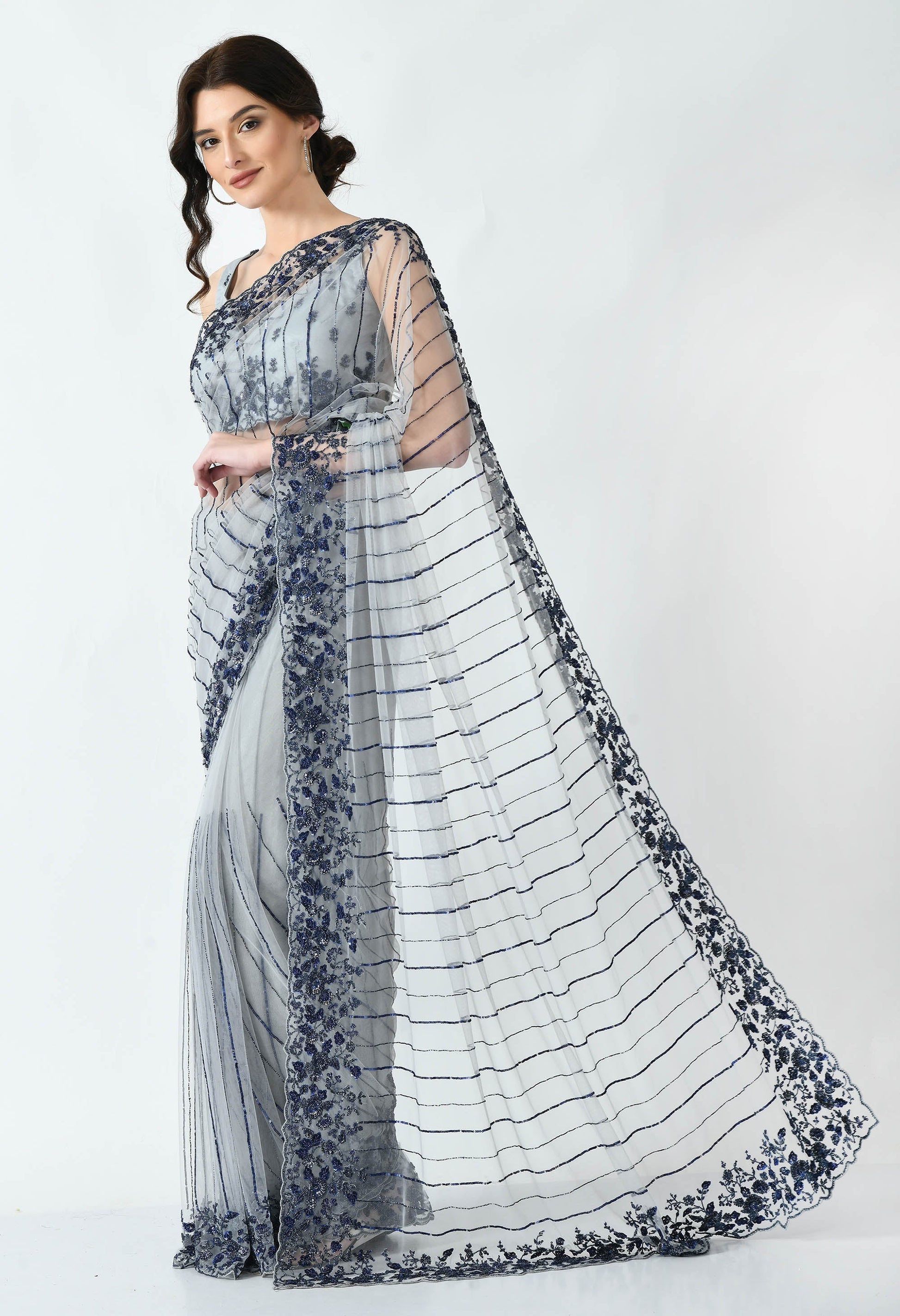 Gorgeous Pearl Hand embroidered Net Special Designer Saree with hand embroidery floral work motifs. This is a saree that is tailor made efficiently with perfect exquisite detailing. Handmade to Embrace your special moments. Suitable for Parties , family gatherings and Weddings. Perfect for a Wedding Guest.