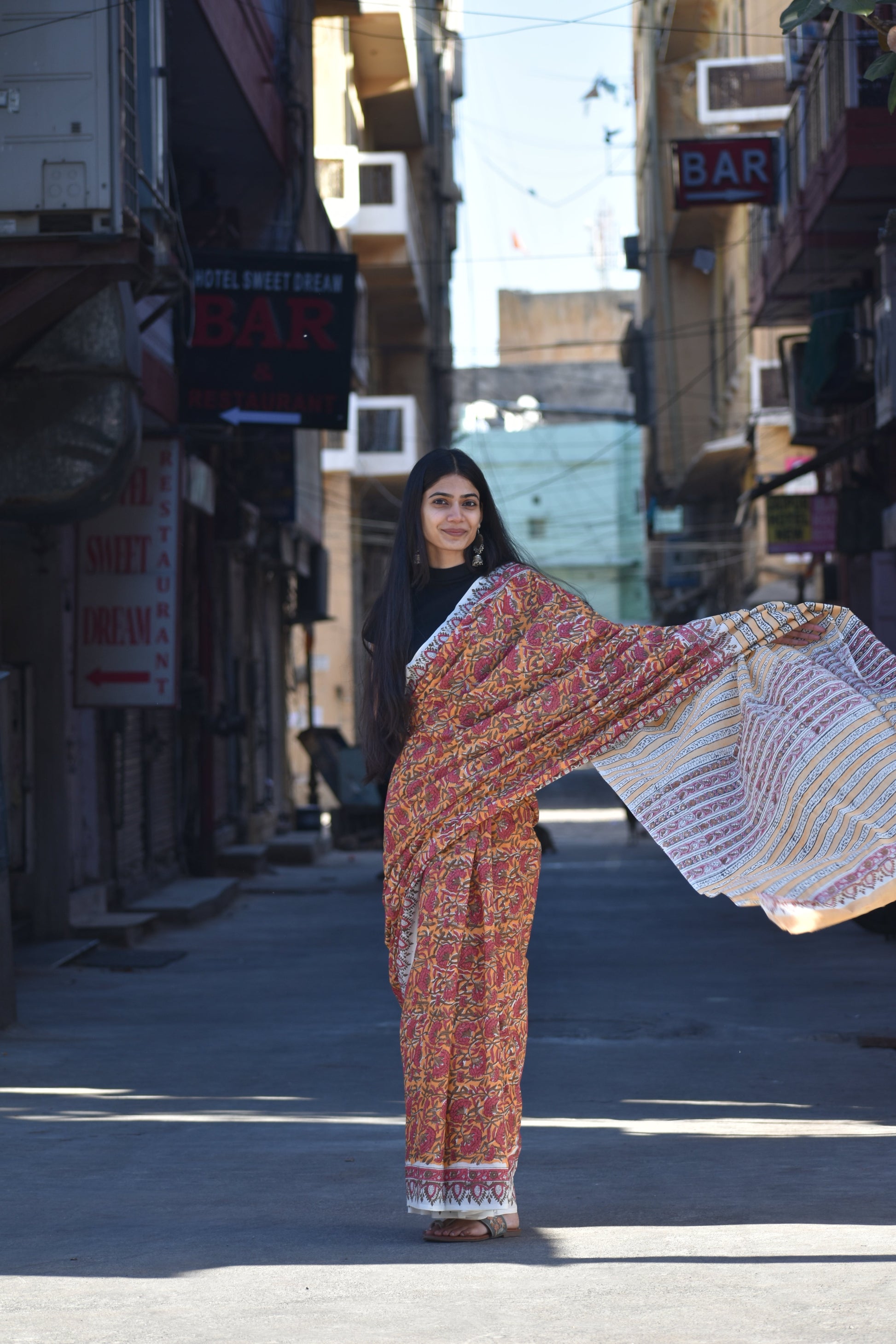 Peeli Dhoop - Sun-Kissed Elegance - Handblock Print Natural Dyed - Mulmul Cotton Saree