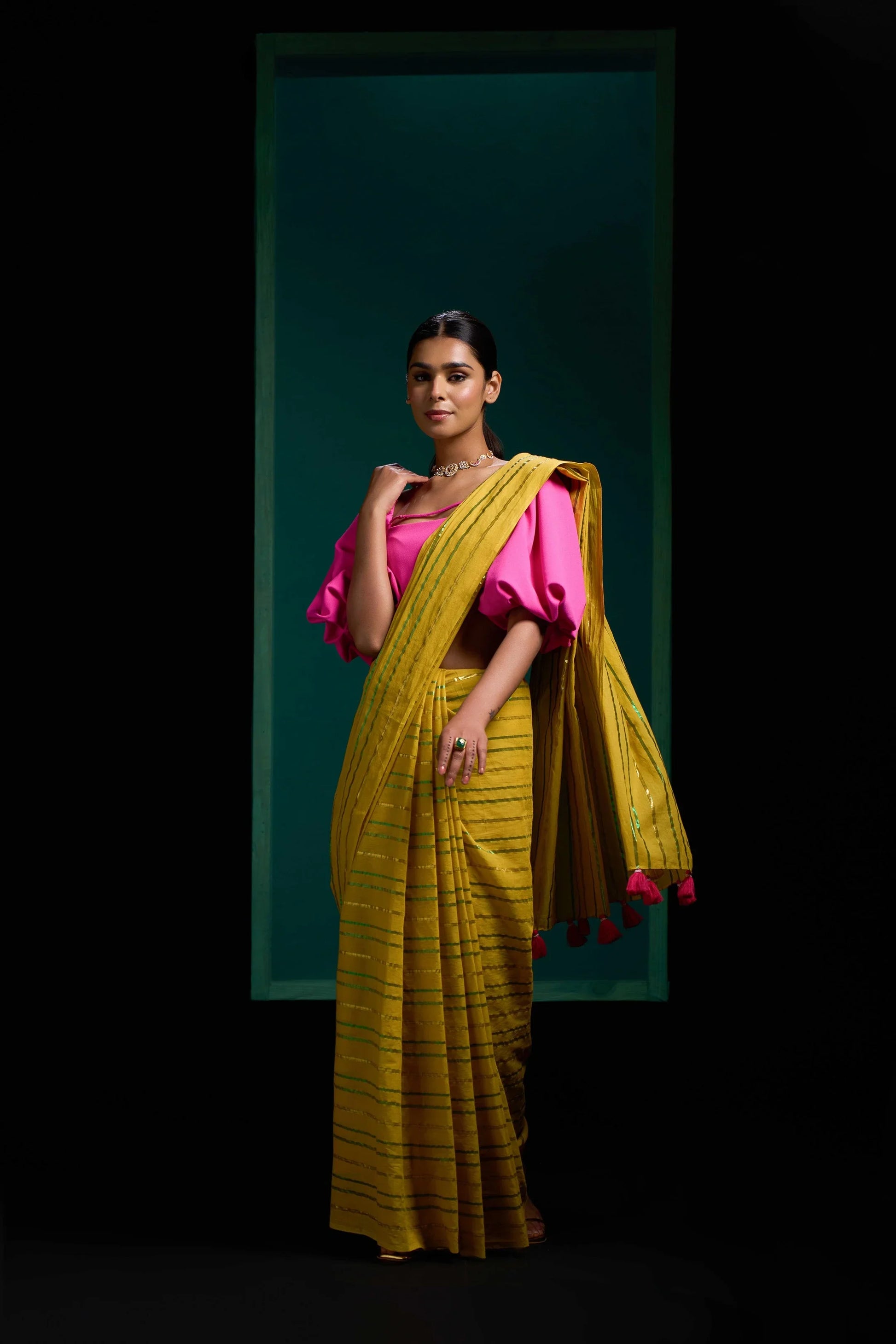 This saree is in cotton Mulmul fabric with multi coloured pink and gold stripes. Saree fabric is breathable and feels lighter in summer. Its comfortable, stylish and extremely versatile. Saree has pink tassles at the pallu.